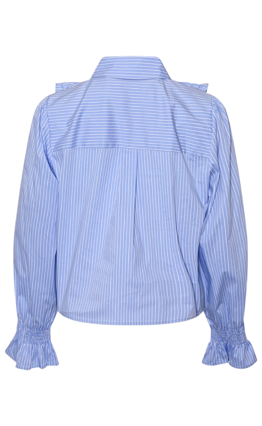Feminin skjorte fra Noella i et blå stribet print, med flæsedetaljer fortil.