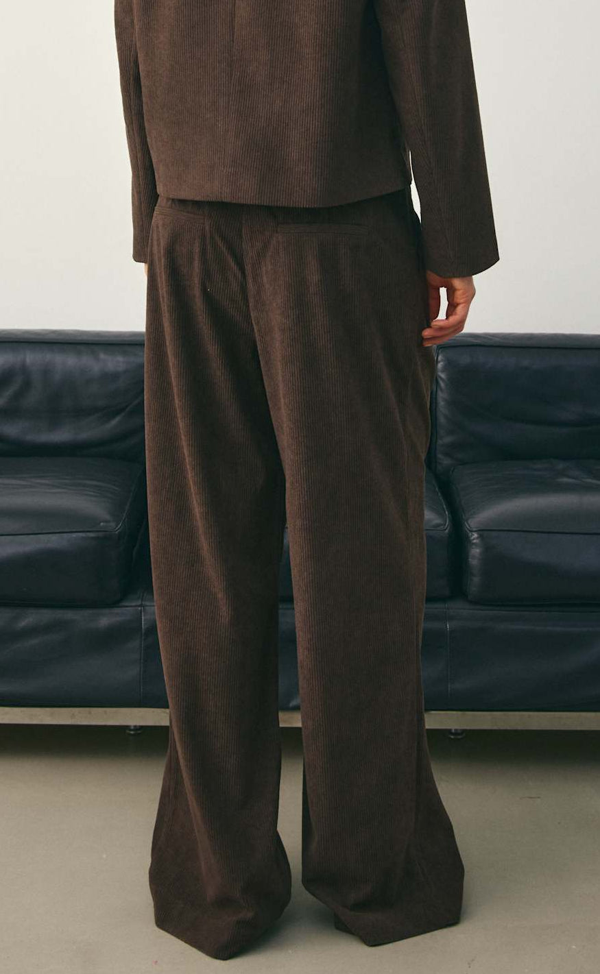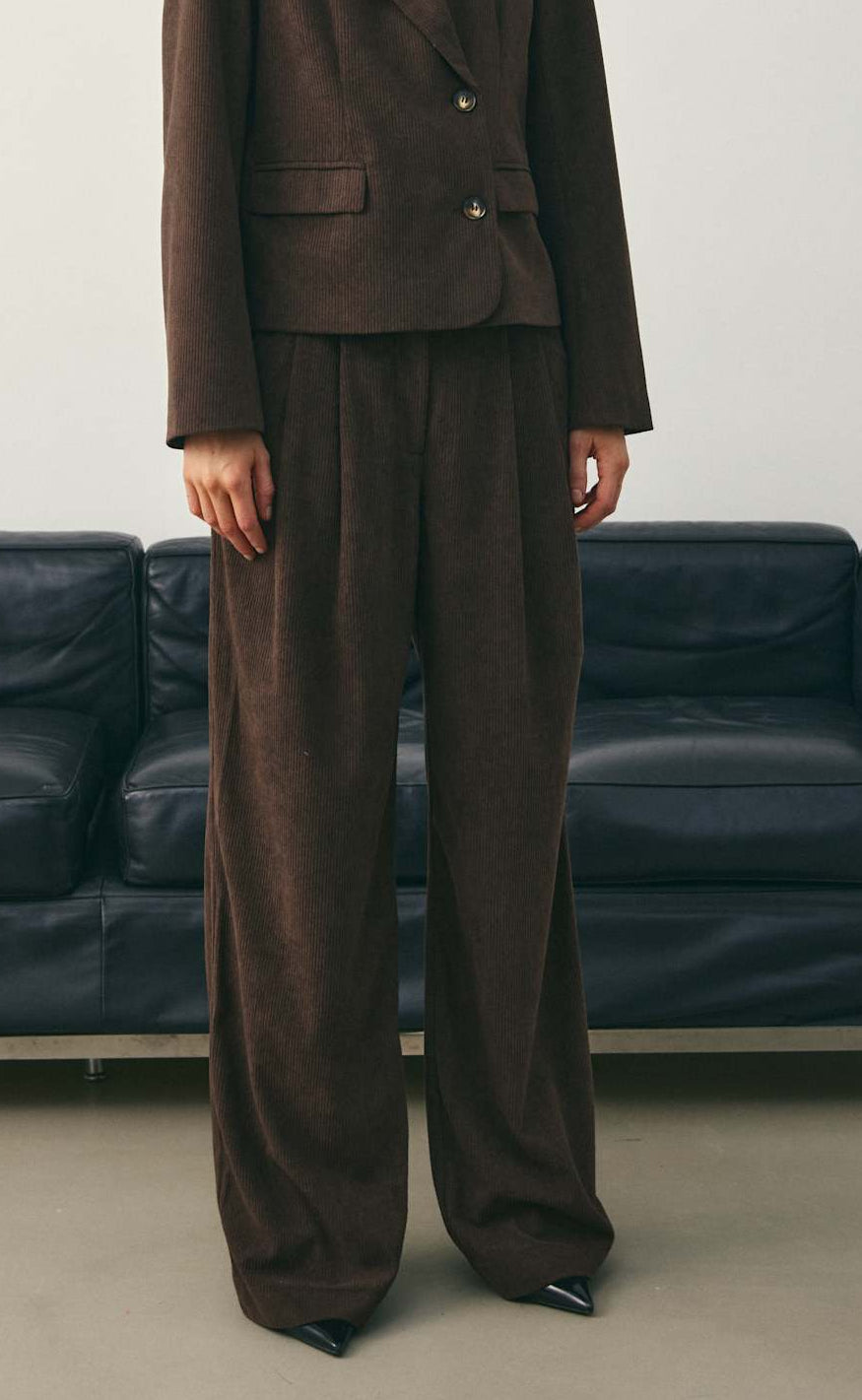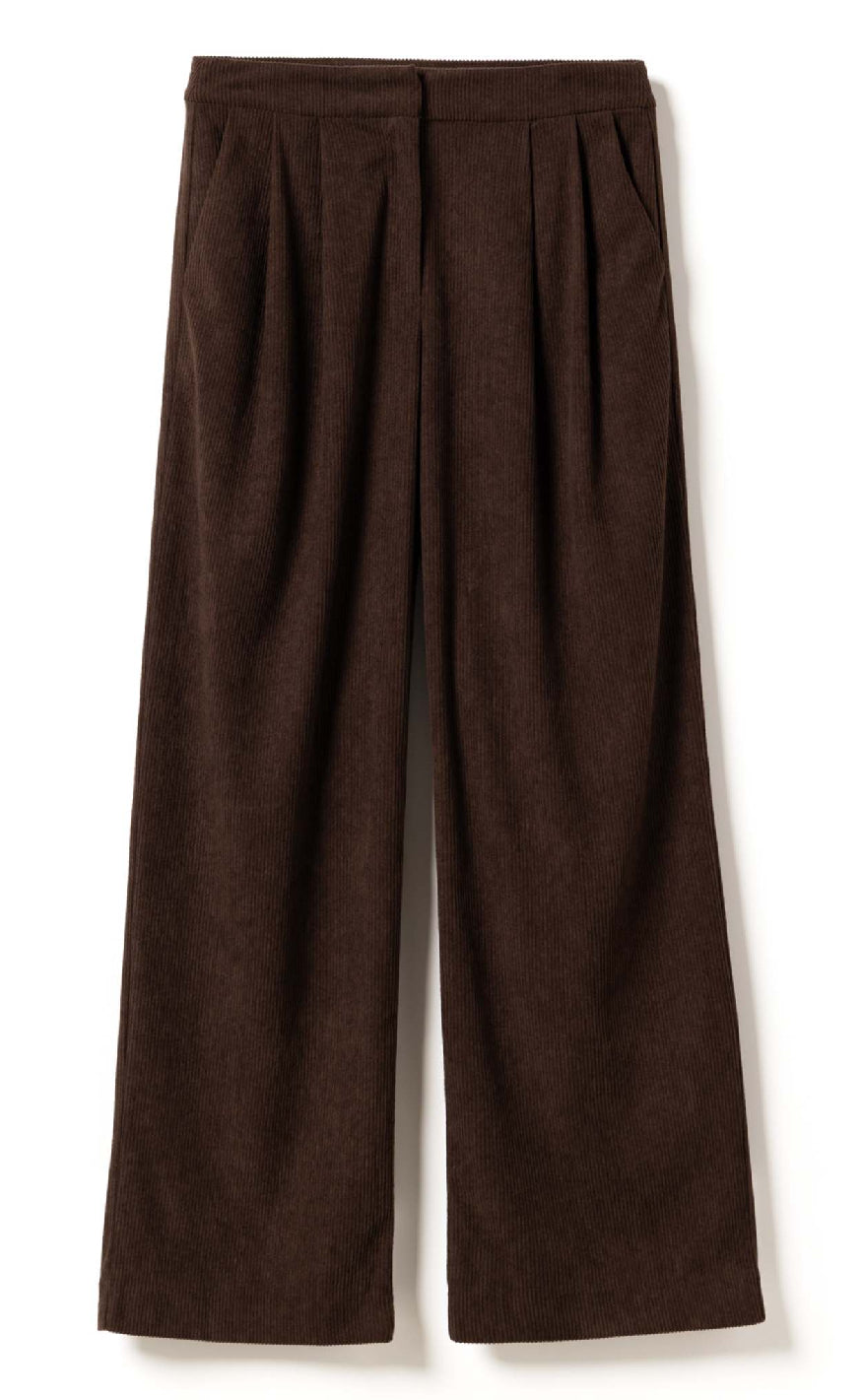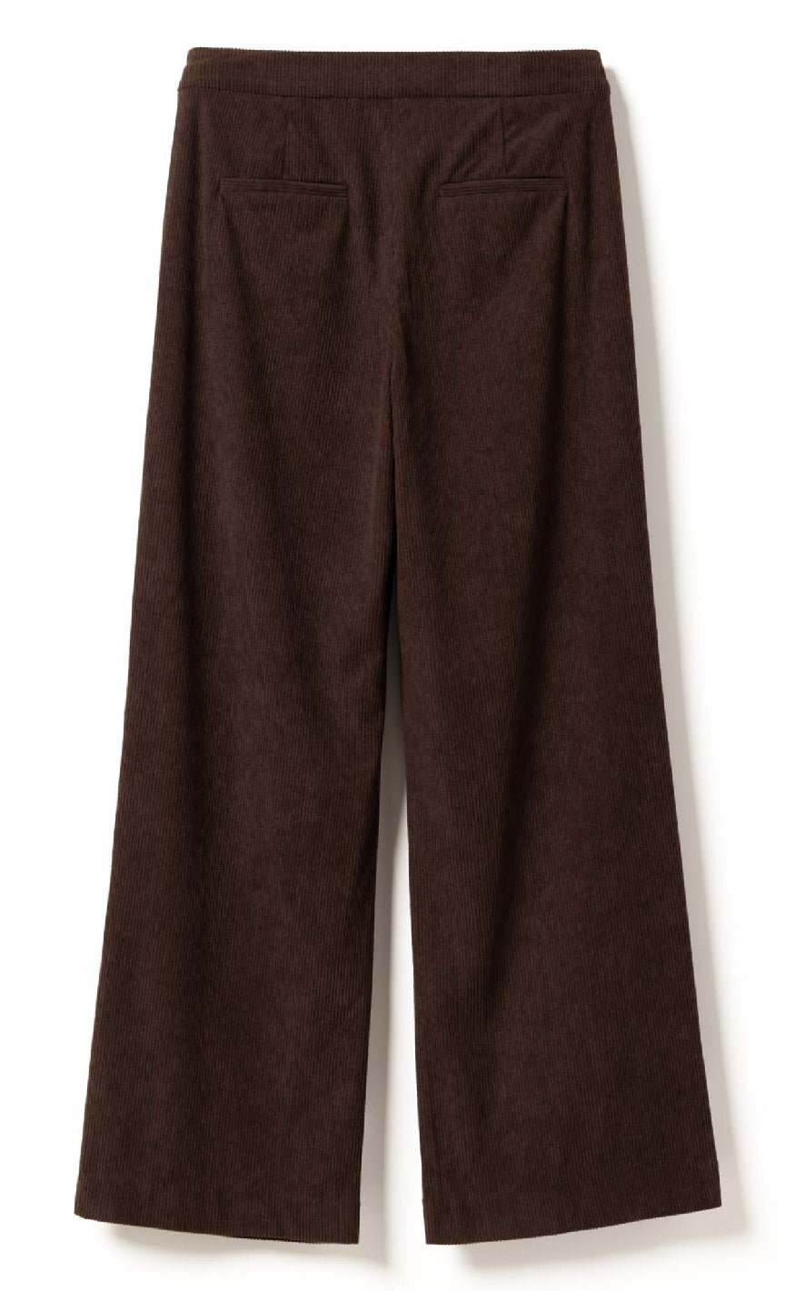 Brune bukser fra Noella i blød fløjl med vide ben og læg foran – et komfortabelt og elegant valg til både hverdag og kontor.