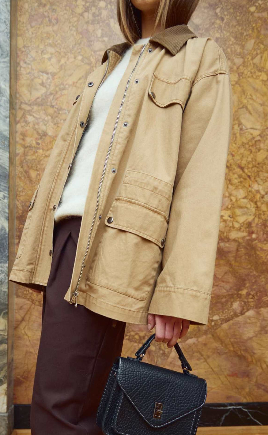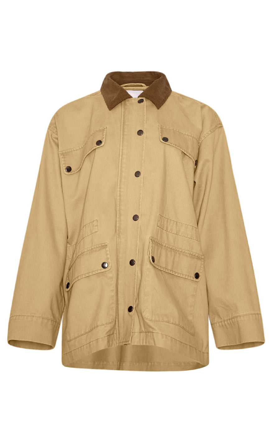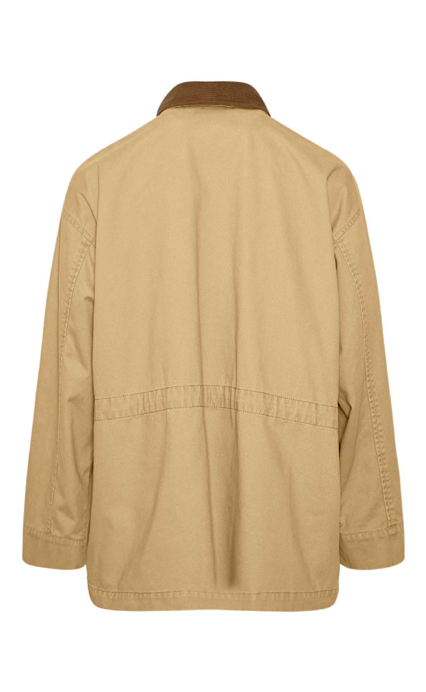 Klassisk jakke fra Noella i beige, med en mørkebrun krave.