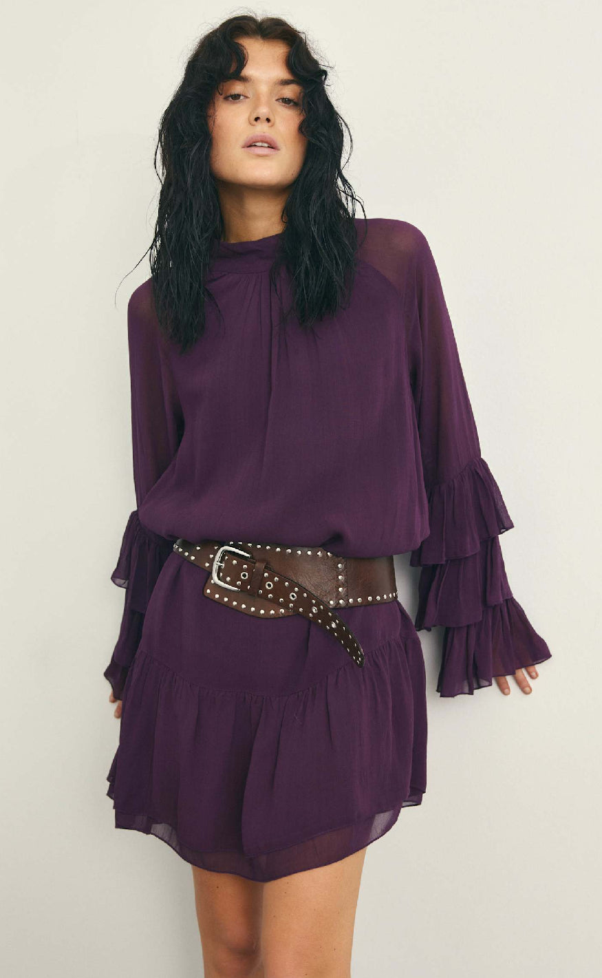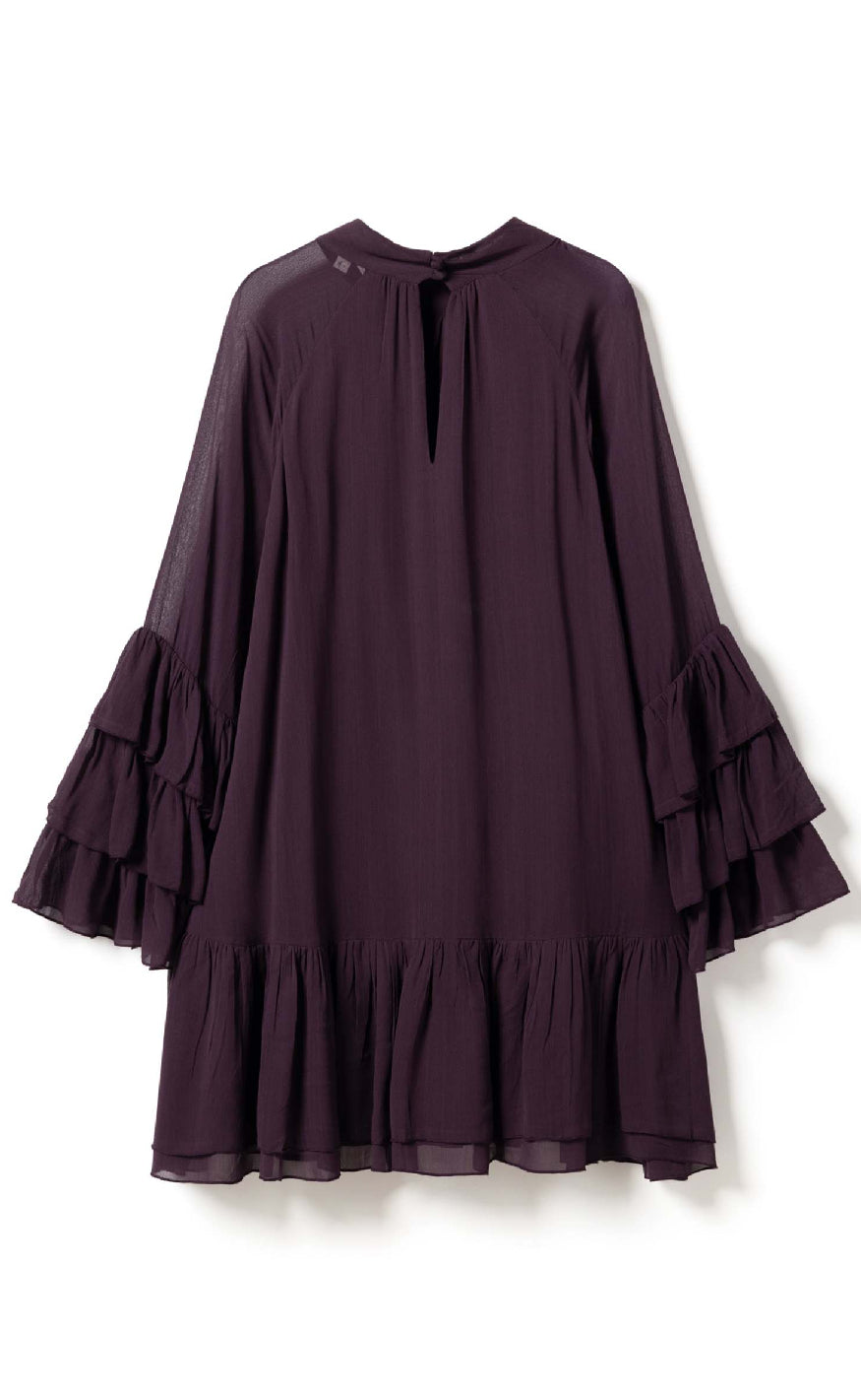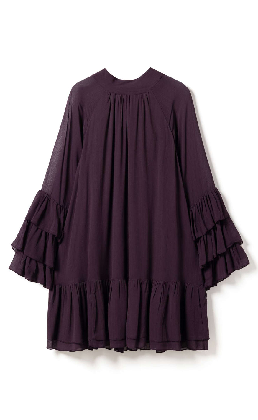 Kjolen har lange ærmer, høj halsudskæring og fine flæsedetaljer. Den løse pasform med lav cutline gør den behagelig at have på, og den er perfekt til enhver festlig anledning – et oplagt valg til garderoben!