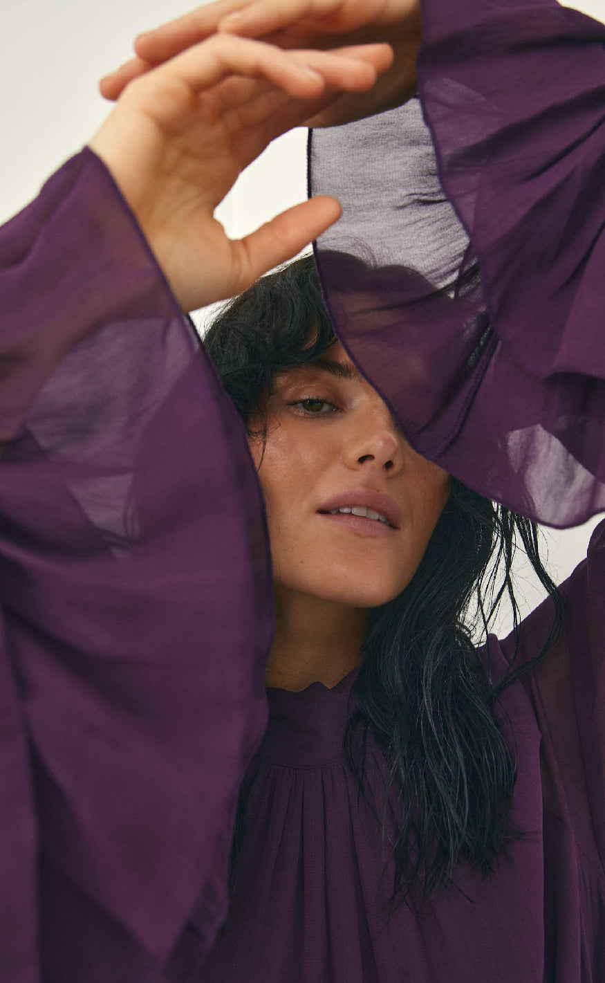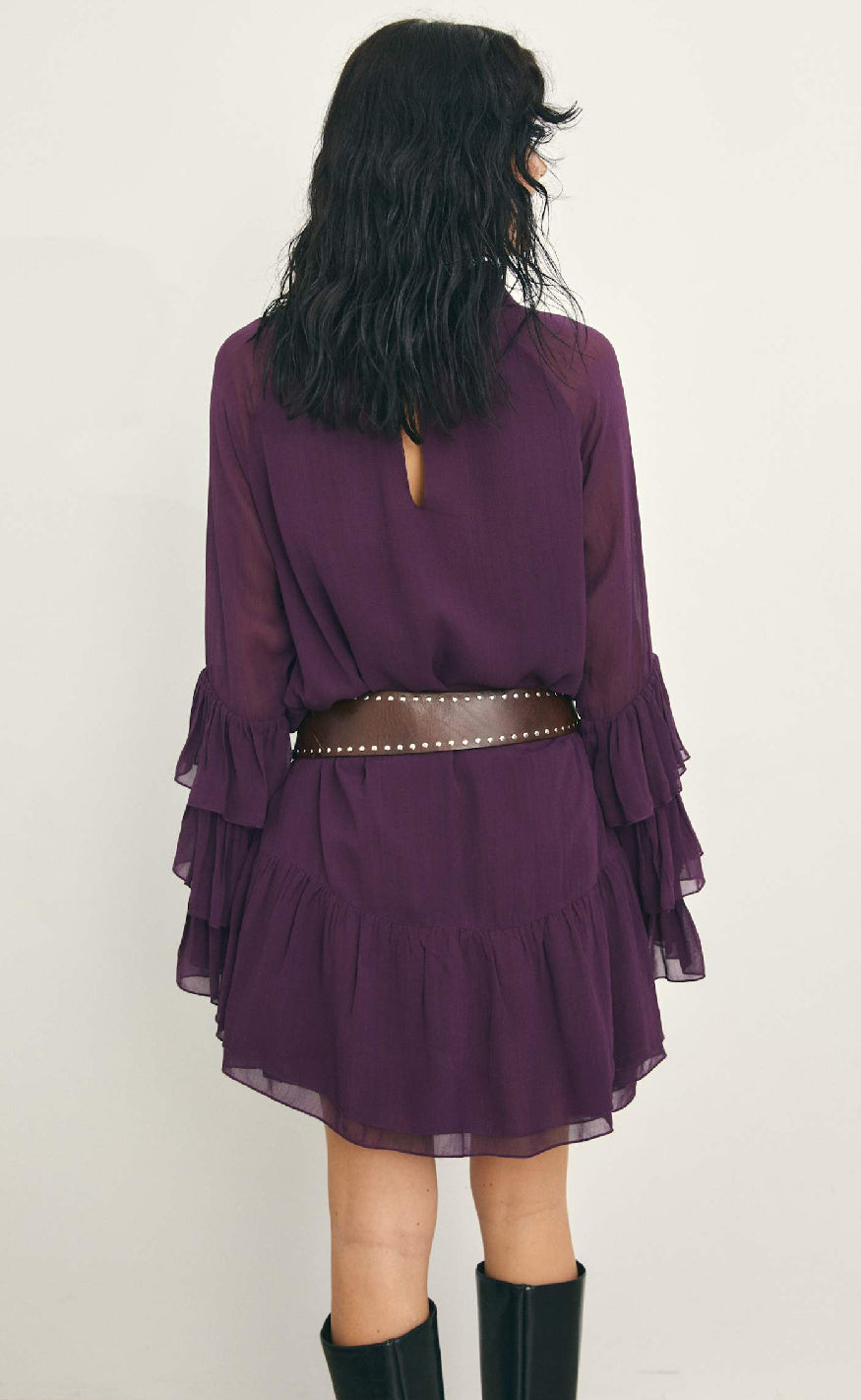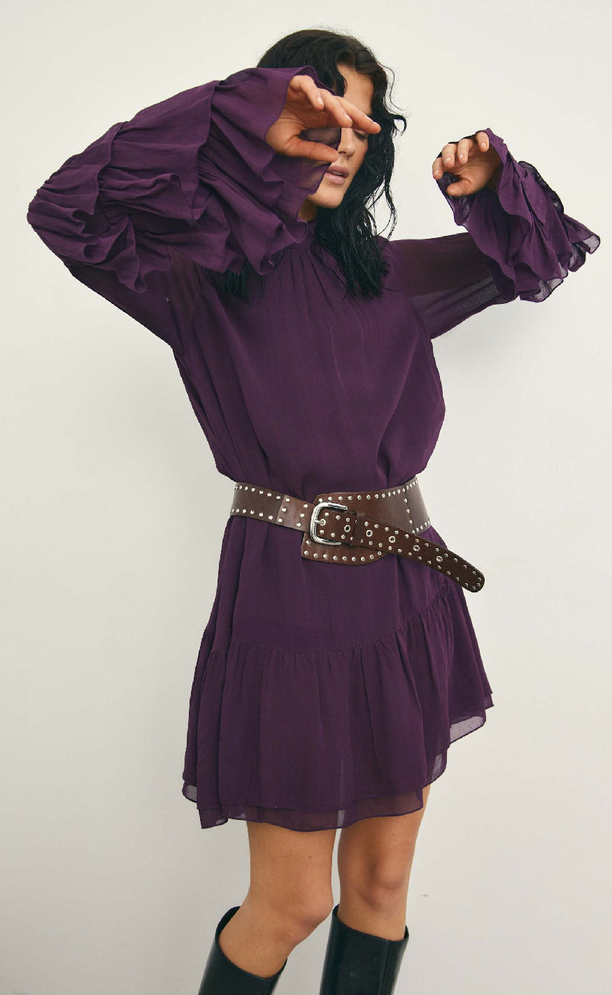 Kjolen har lange ærmer, høj halsudskæring og fine flæsedetaljer. Den løse pasform med lav cutline gør den behagelig at have på, og den er perfekt til enhver festlig anledning – et oplagt valg til garderoben!
