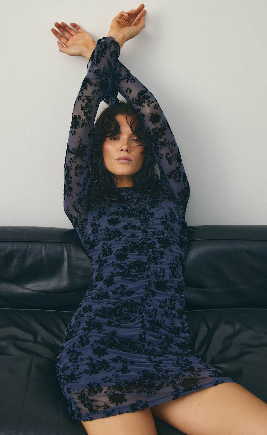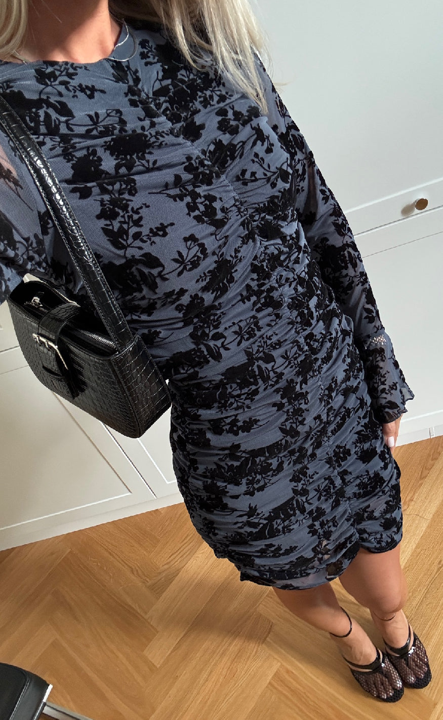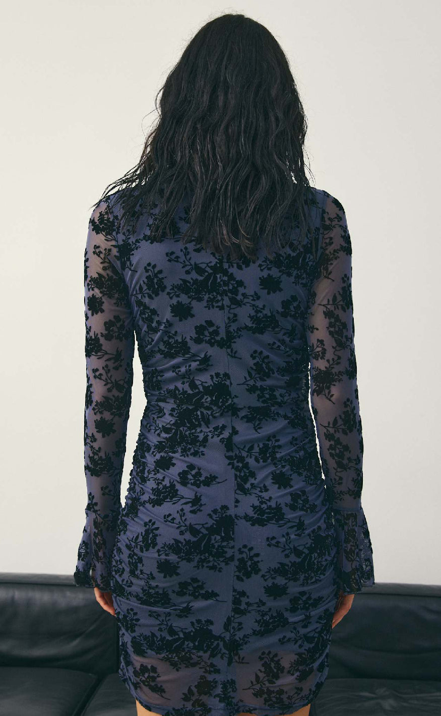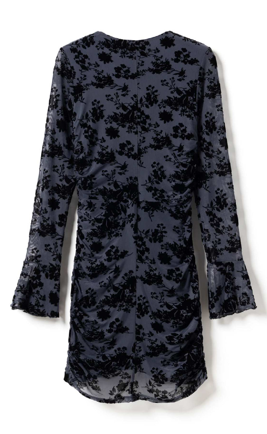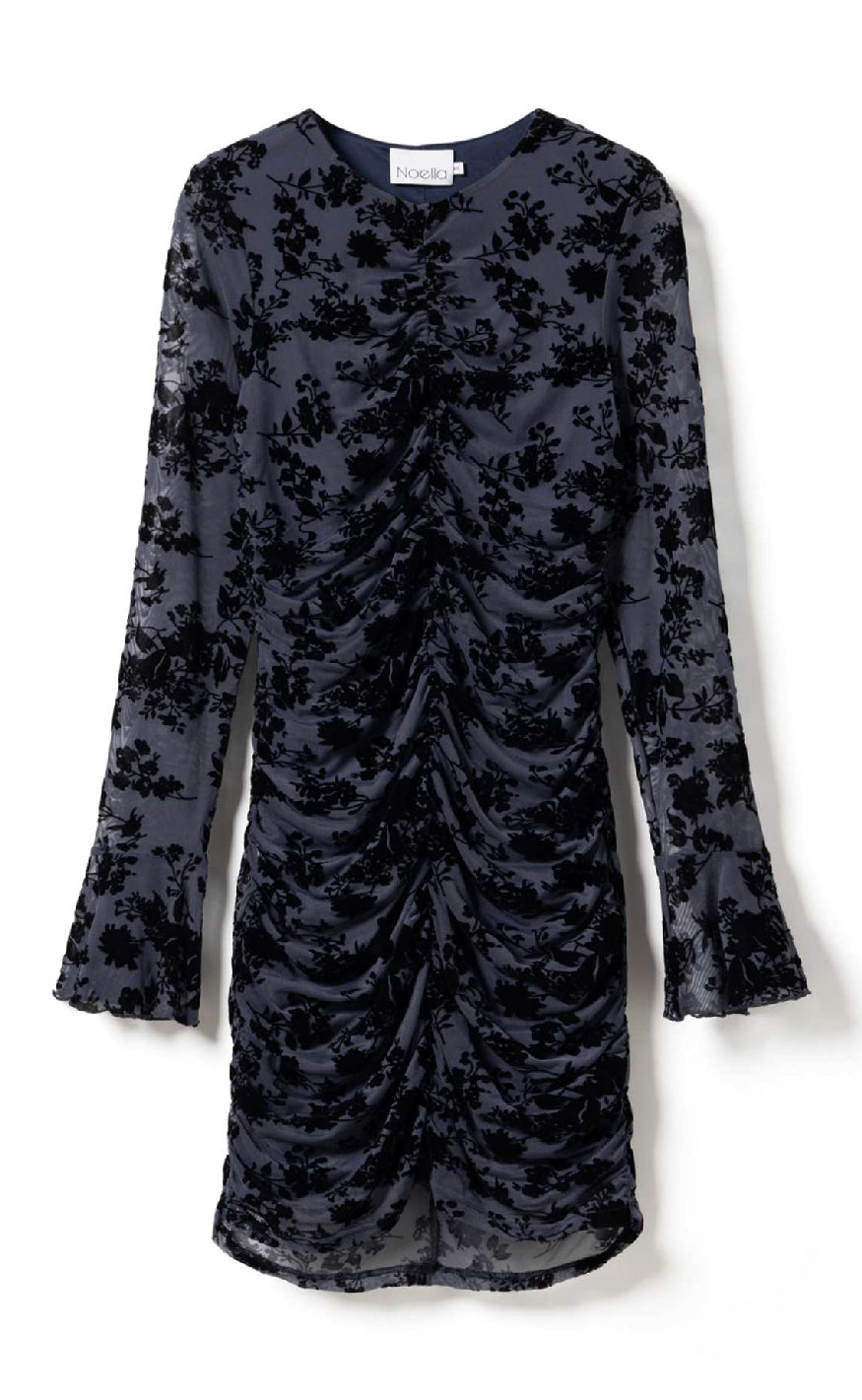 Kort kjole fra Noella i mørkeblå mesh med lange ærmer, rund hals og flæsedetaljer ved manchetterne, dekoreret med sort blomstermønster og draperinger langs kroppen for et elegant og festligt look.