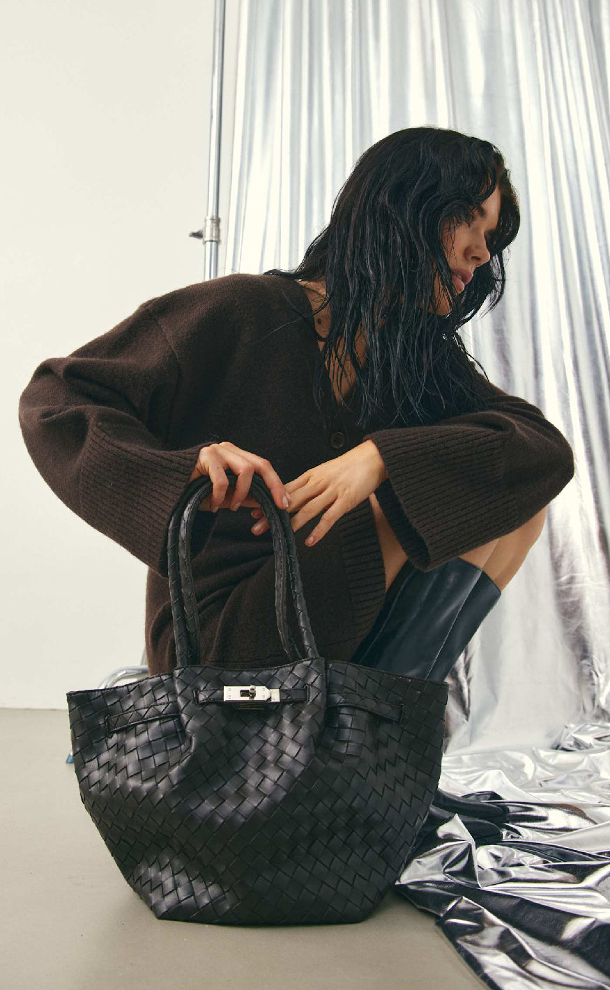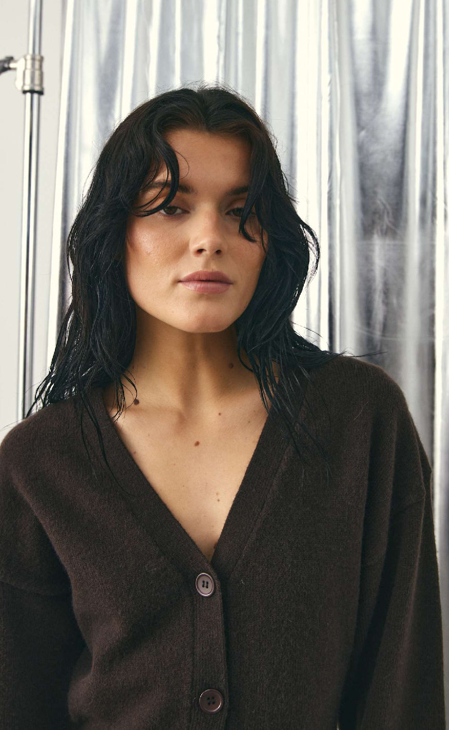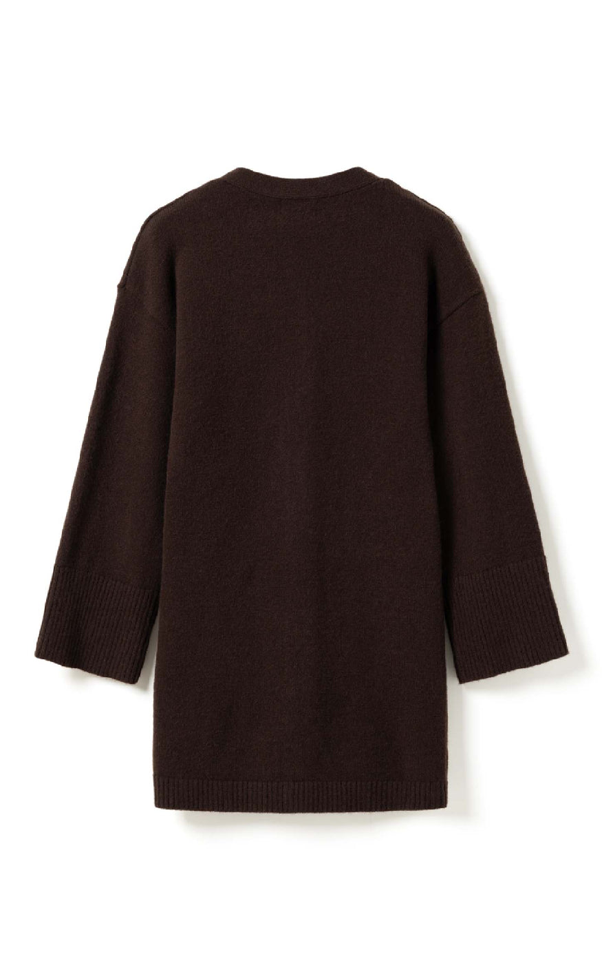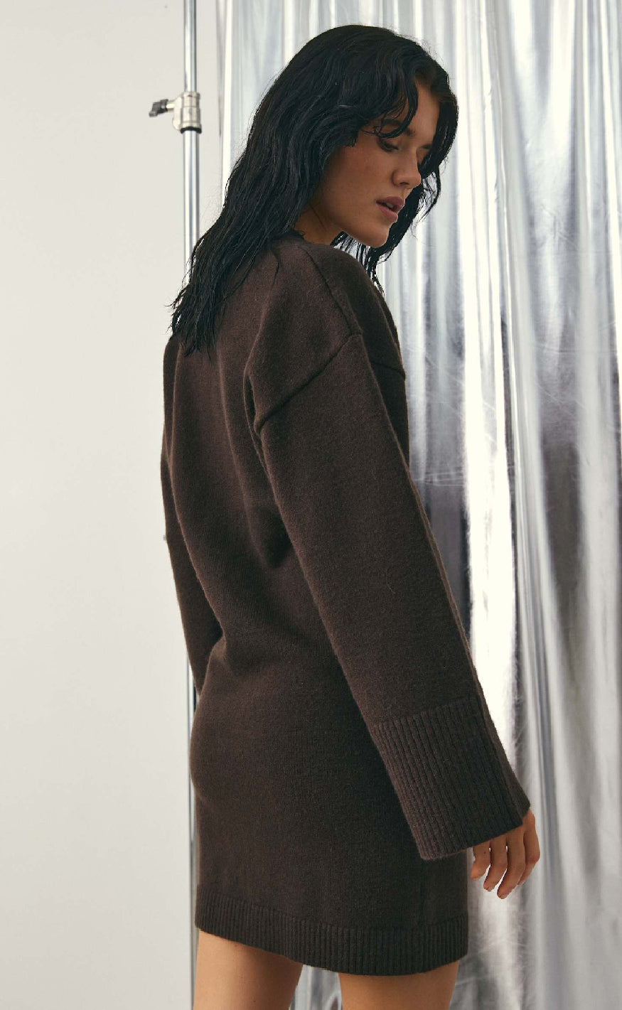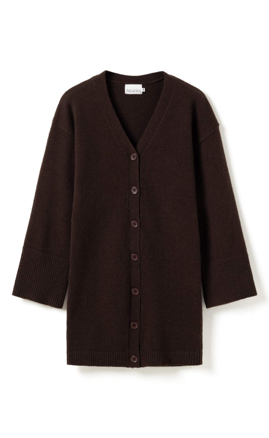 Lang, strikket kjole fra Noella i mørkebrun med V-udskæring, knaplukning og brede ribkanter på ærmer og bund, der giver et minimalistisk og tidløst look.