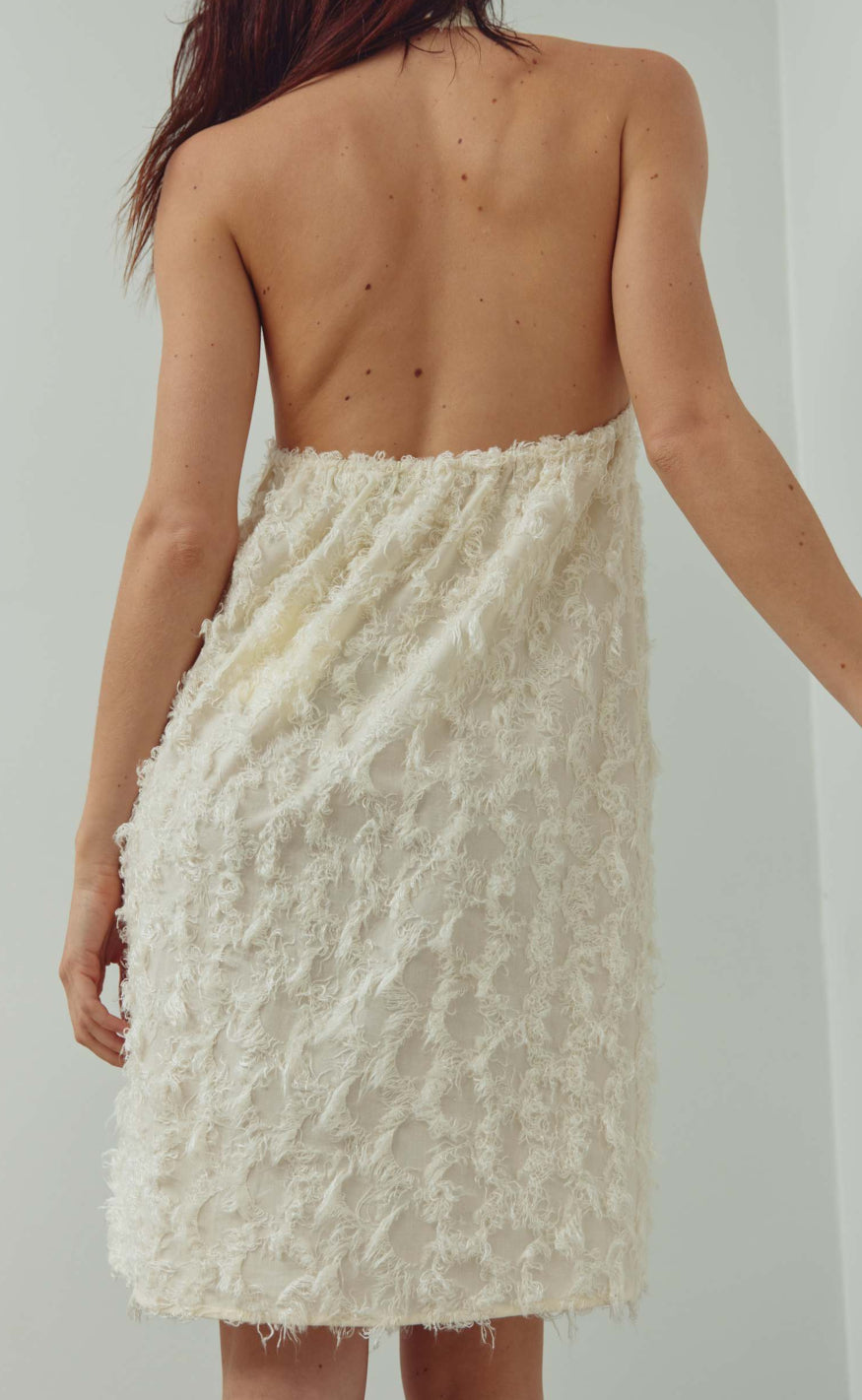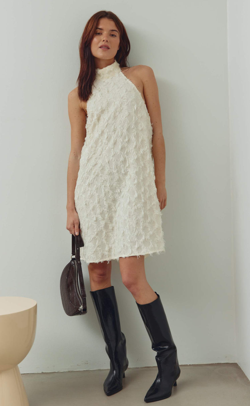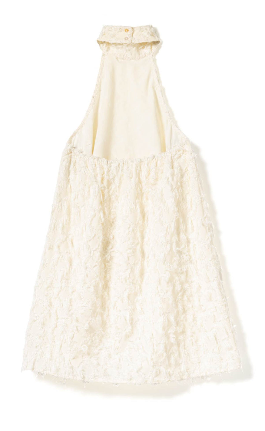 Kjolen har høj hals, halterneck‑design og en løs A‑formet silhuet, som skaber et moderne og feminint look med fine teksturelle detaljer.