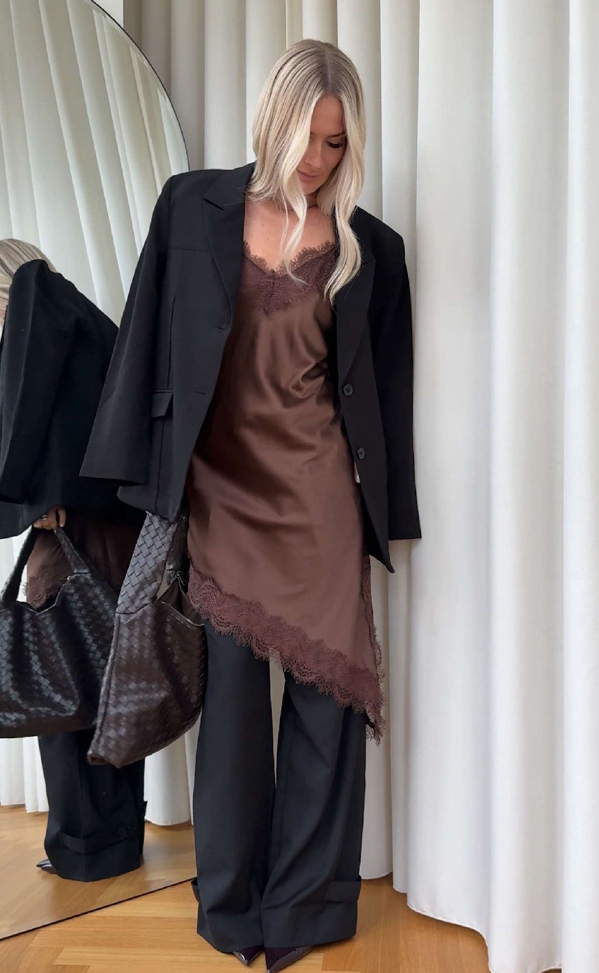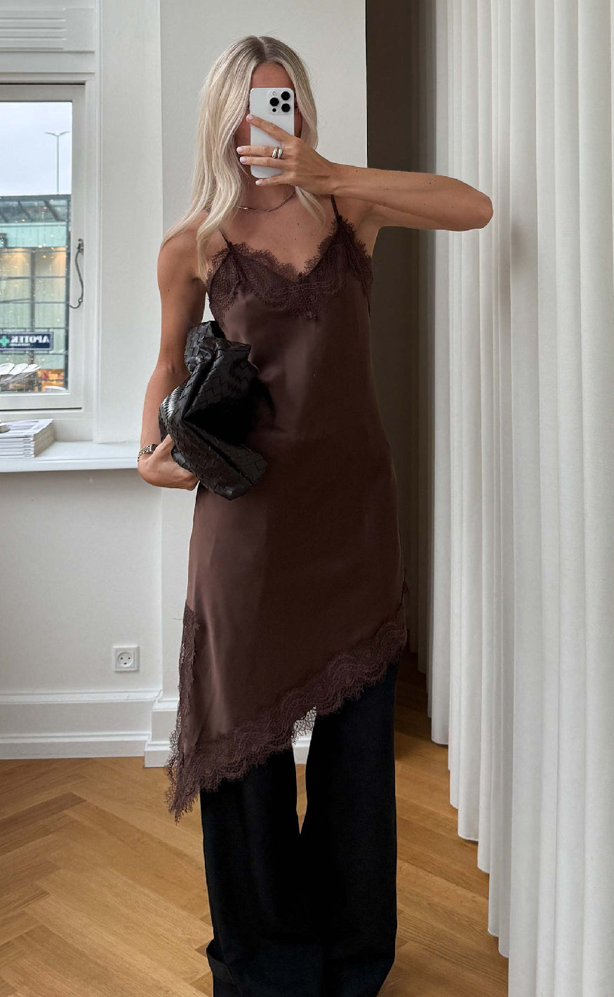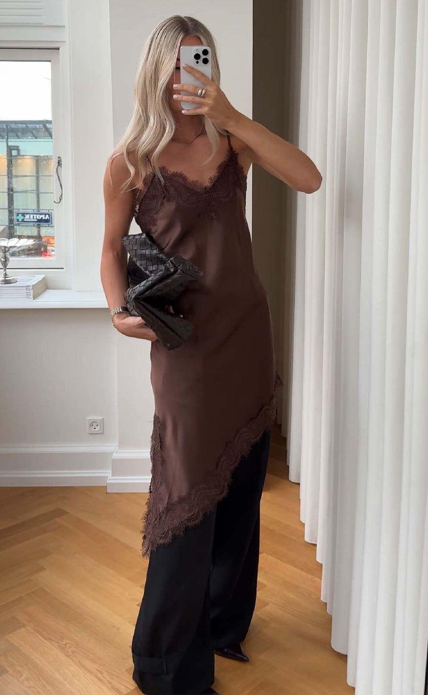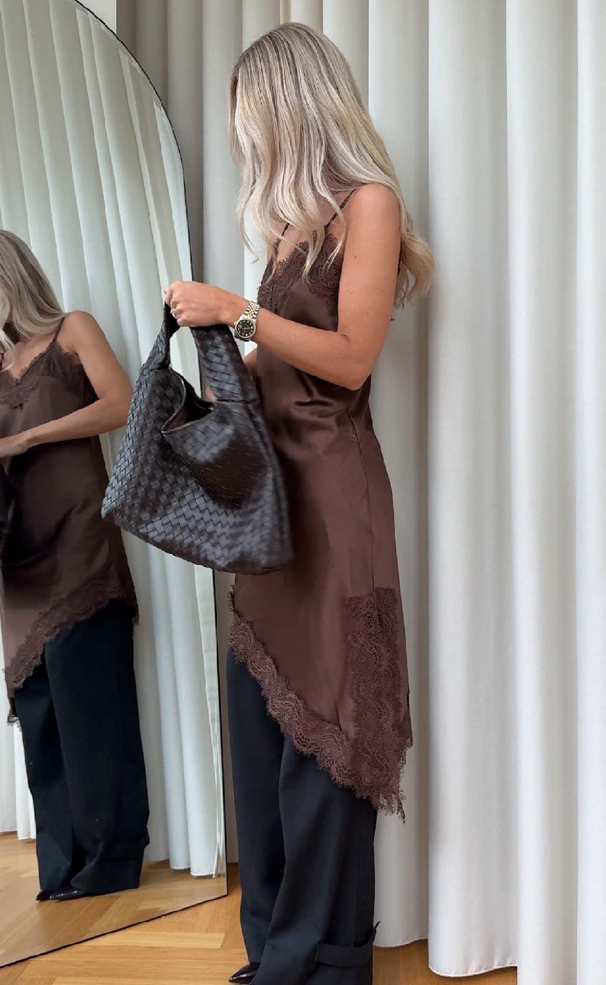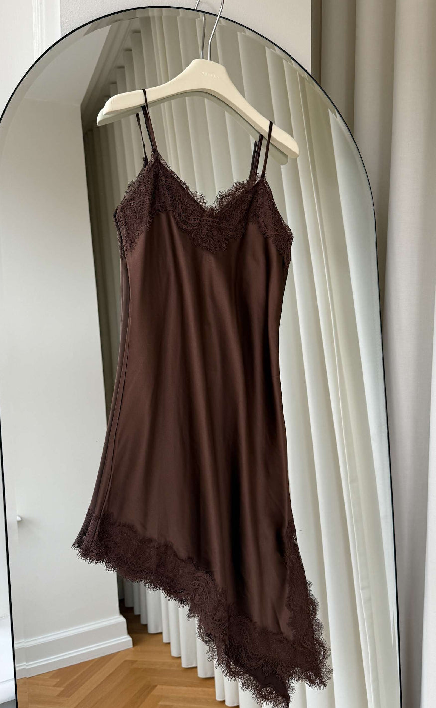 Fin satin kjole fra Noella i brun, med blonde detaljer.