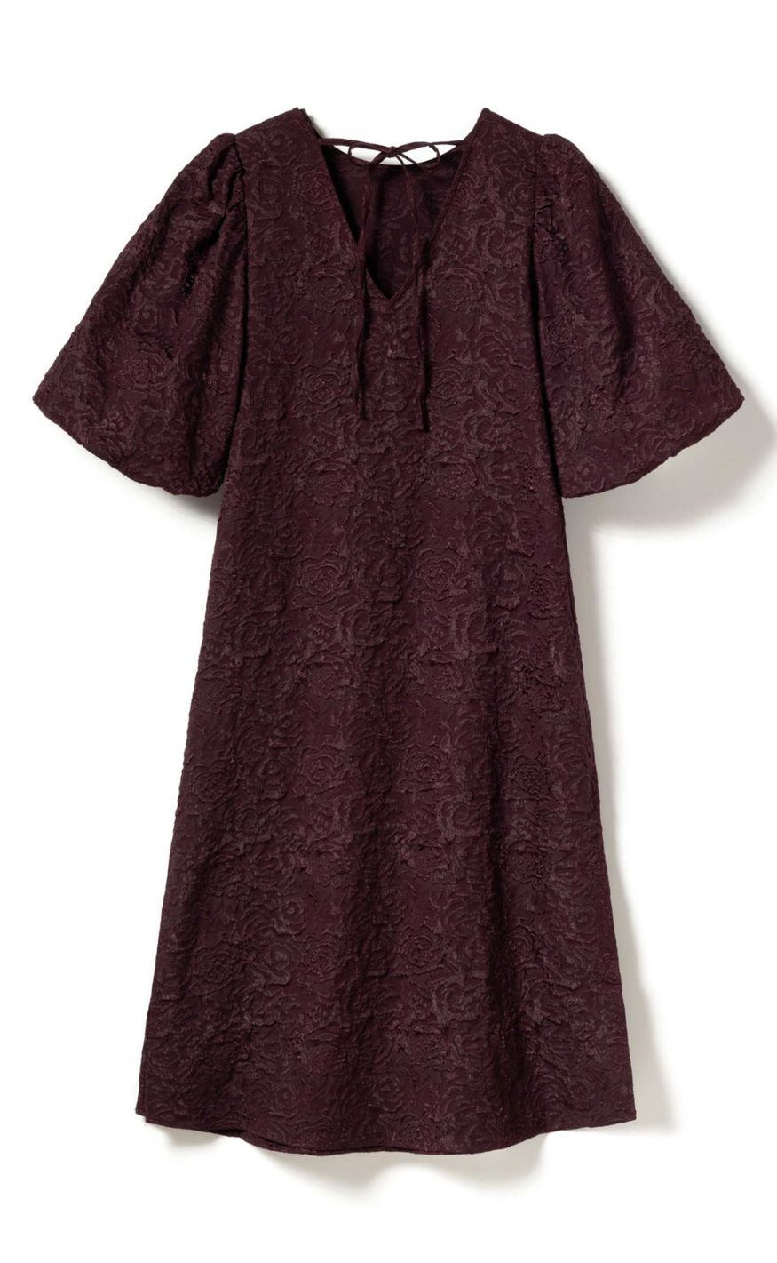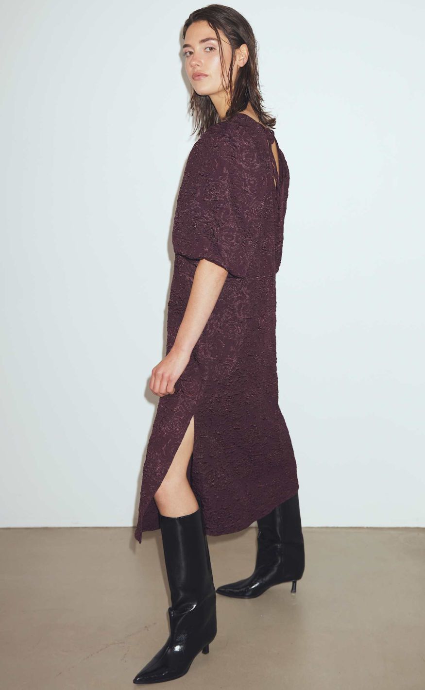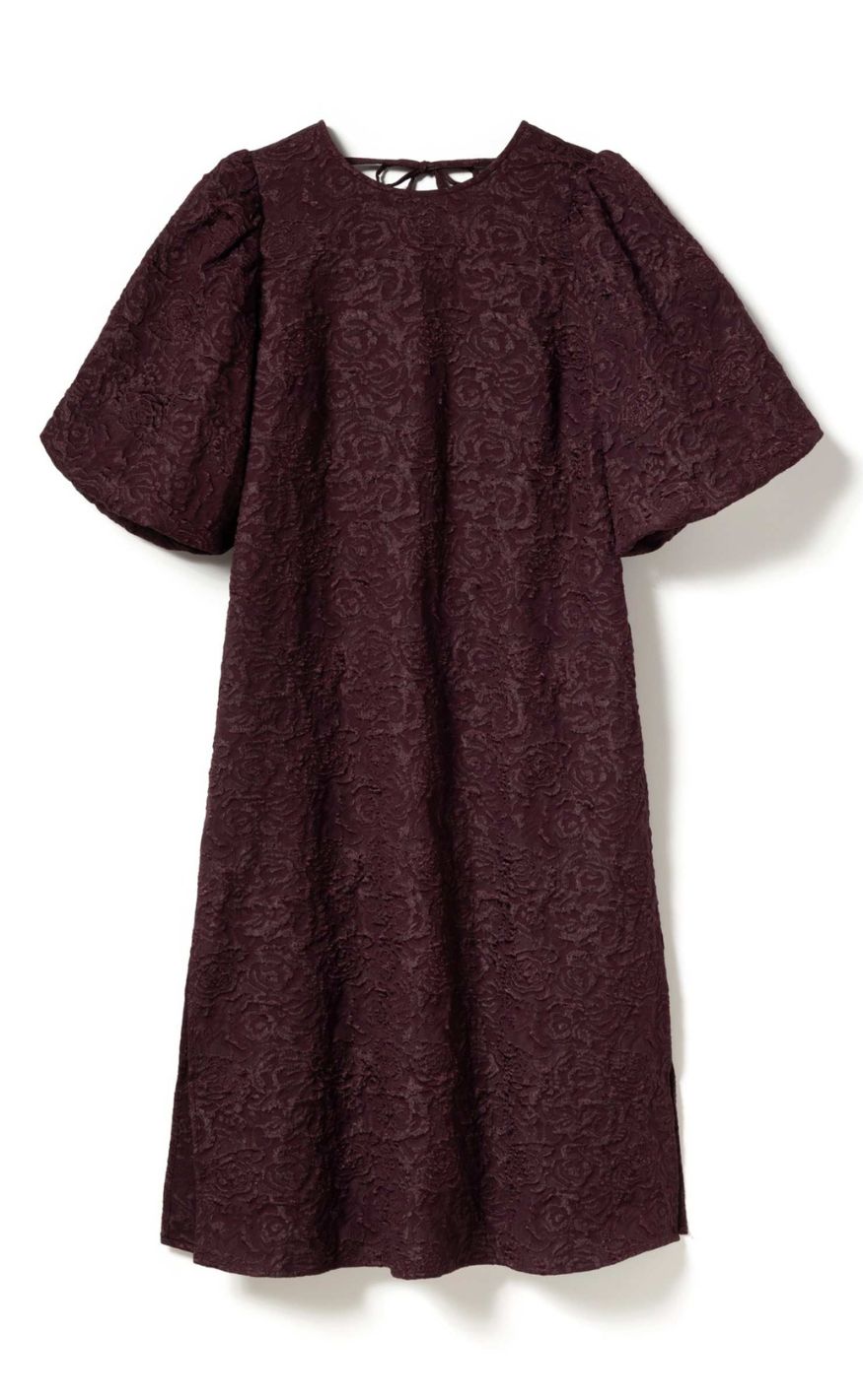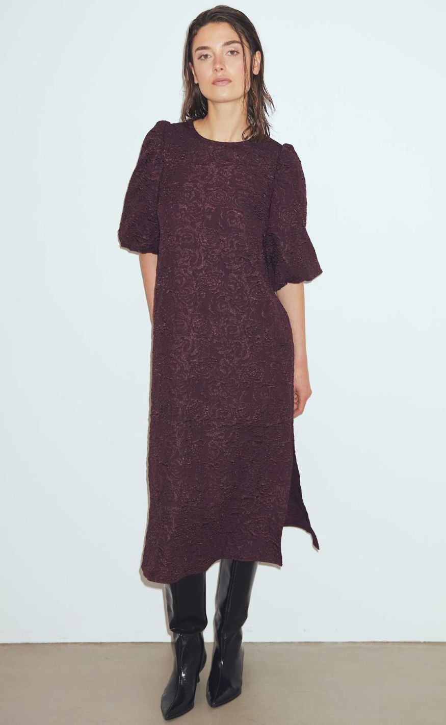 Smuk jacquardkjole i en smuk farve med slids i siderne og voluminøse puffærmer.
