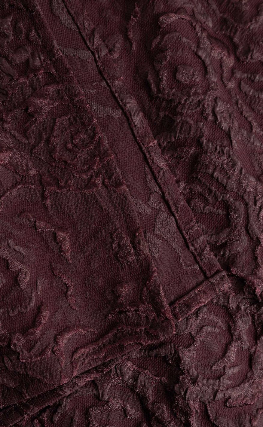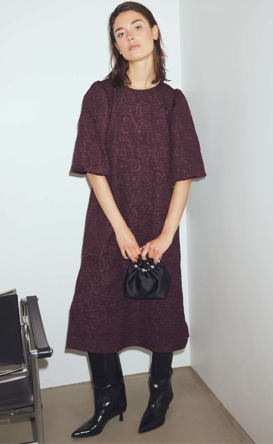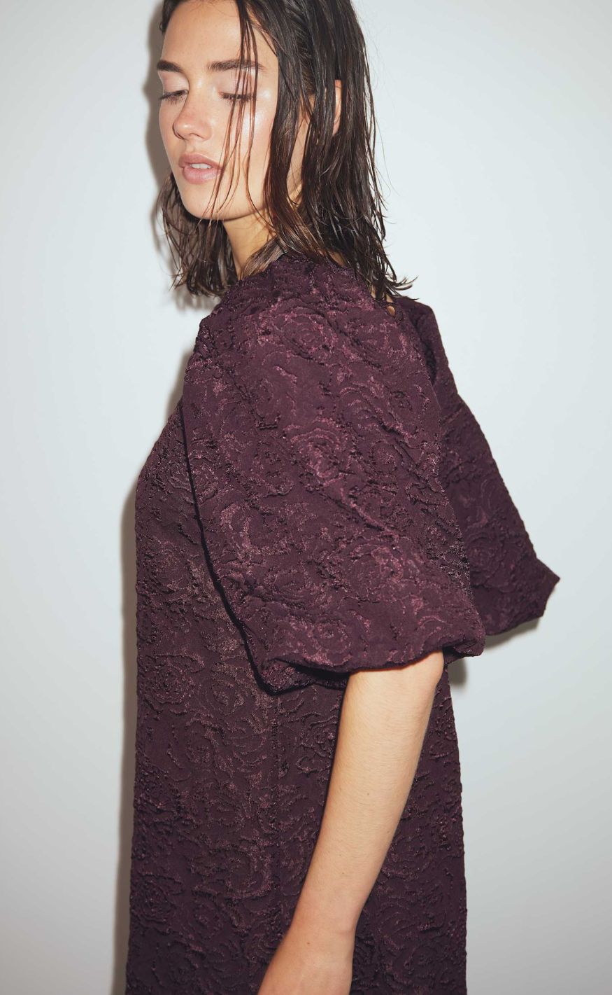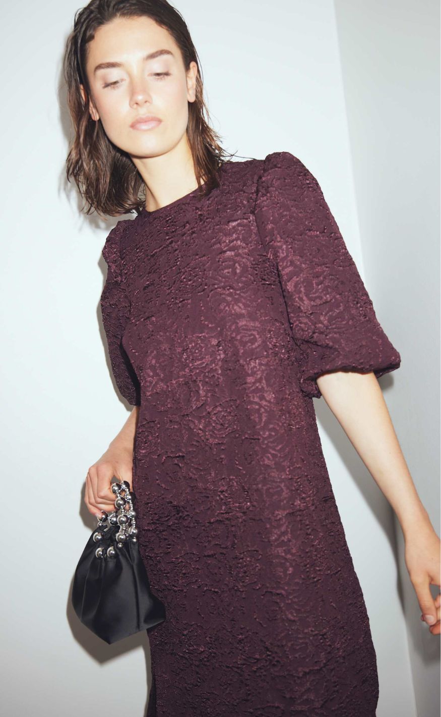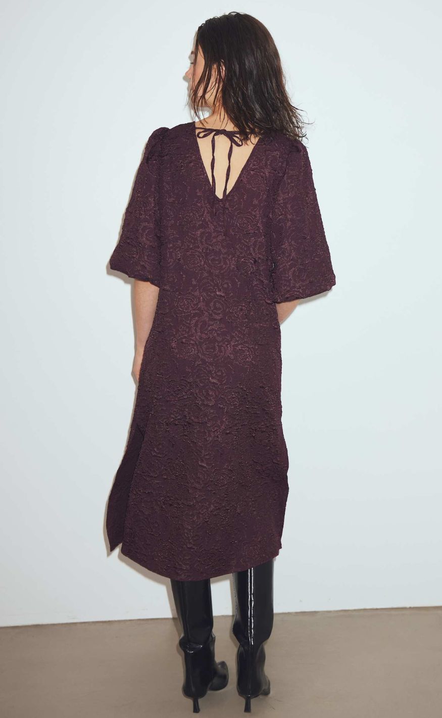 Smuk jacquardkjole i en smuk farve med slids i siderne og voluminøse puffærmer.