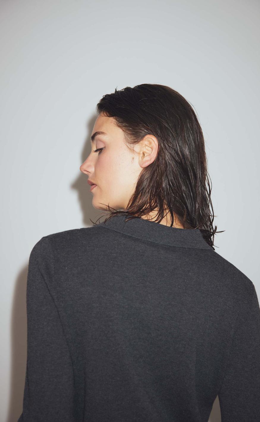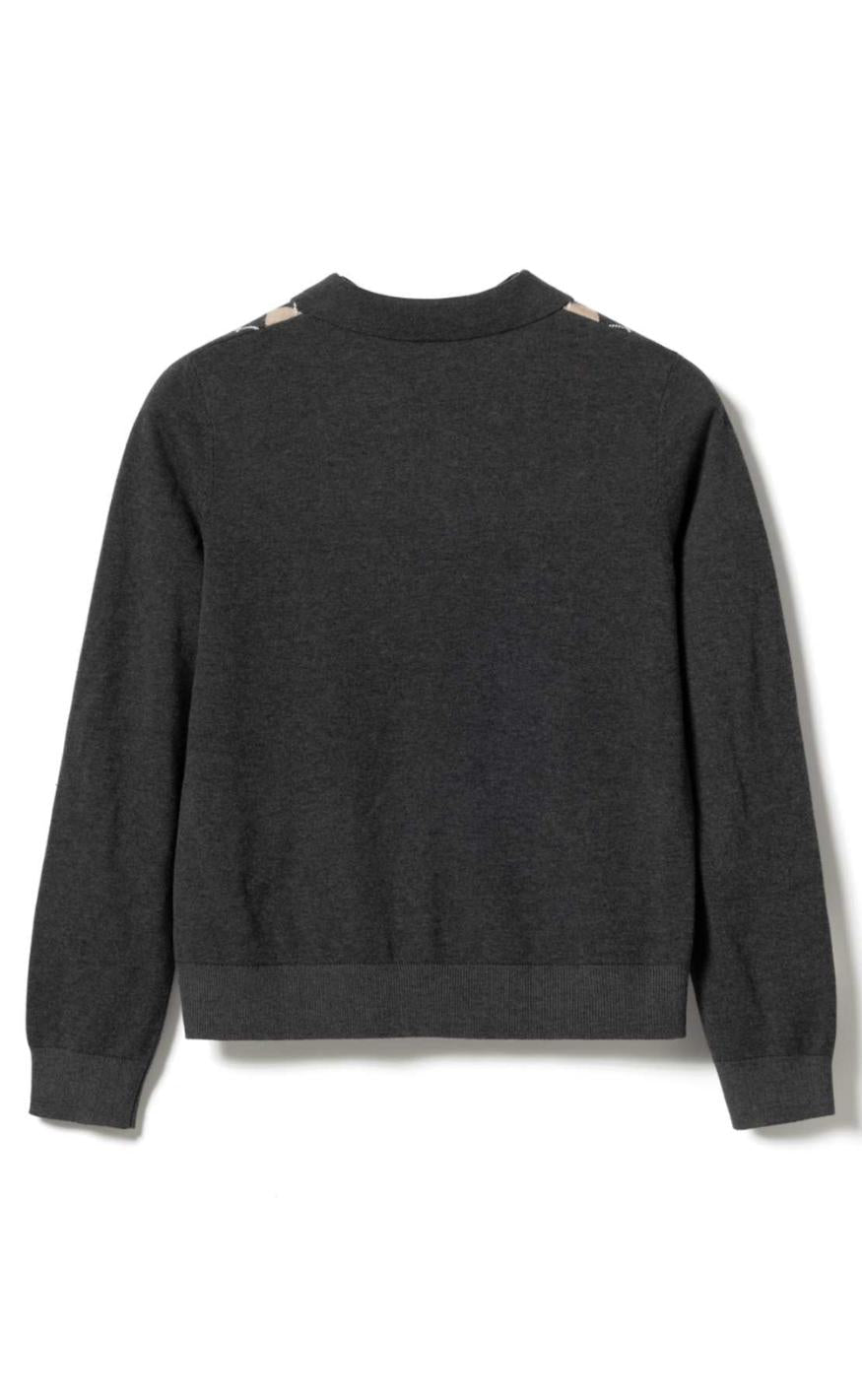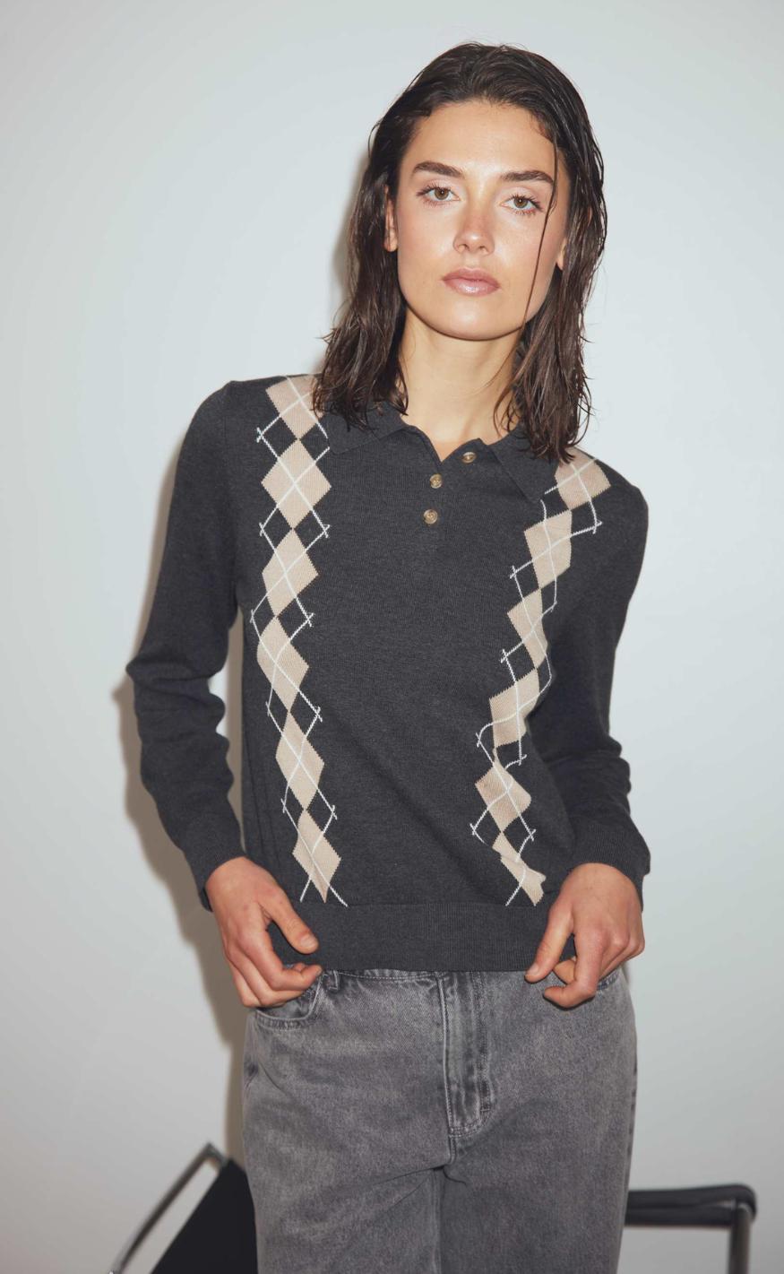 Strikken har en krave og nogle knapper.