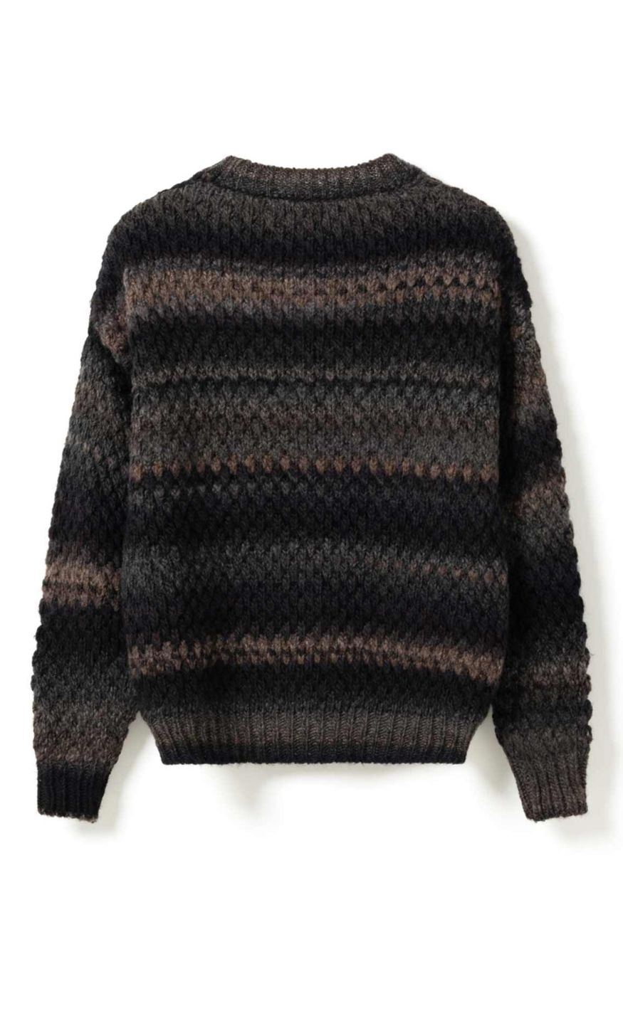 Brun striktrøje med brede striber i varme nuancer og rund hals – et hyggeligt og stilfuldt valg til kølige dage.