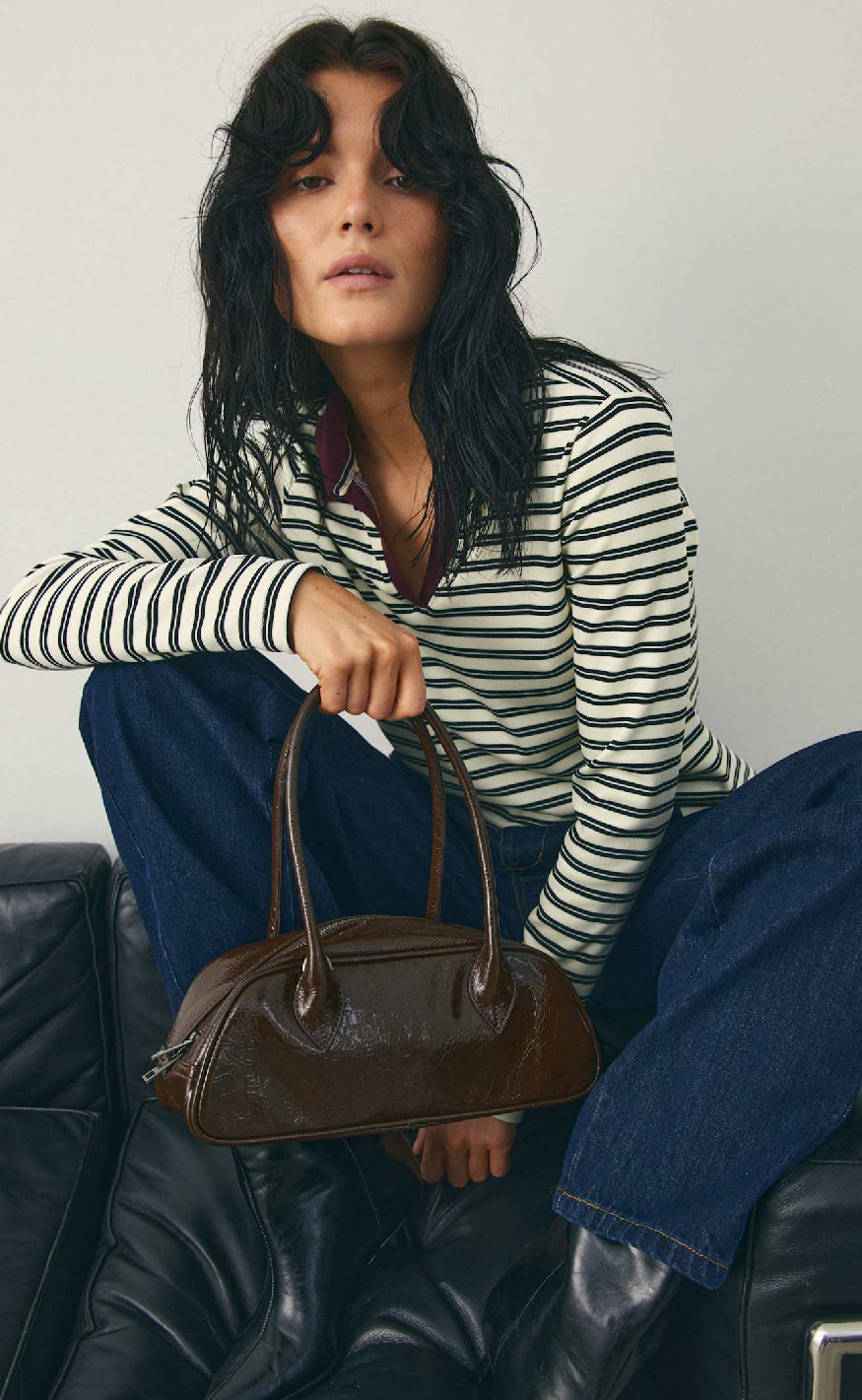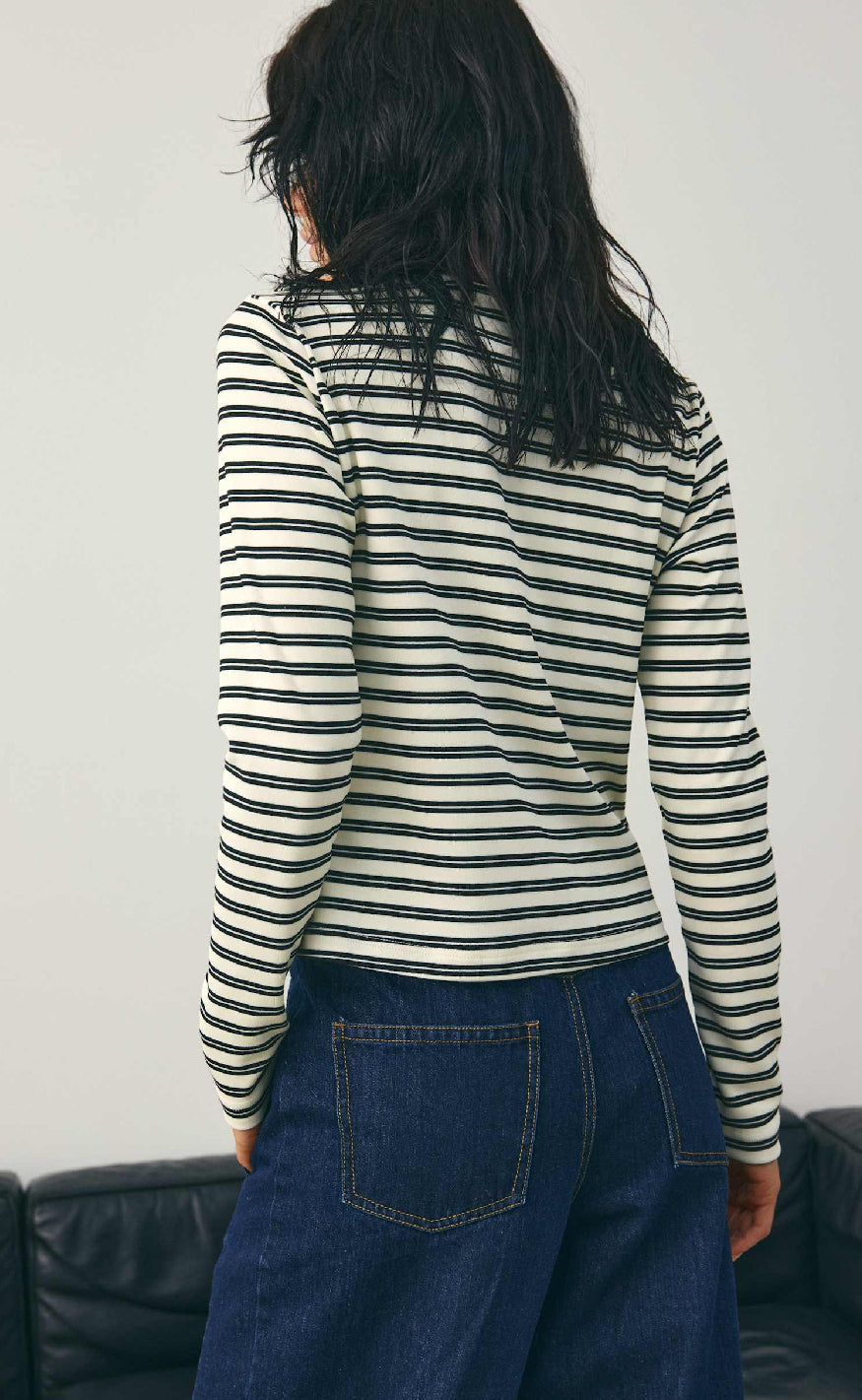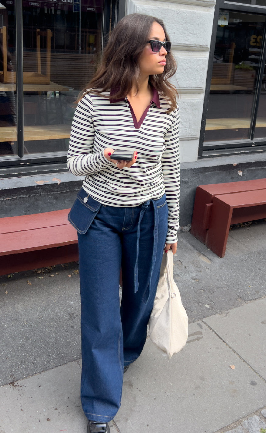 Langærmet bluse med sorte og hvide striber, V-udskæring og kontrastkrave i mørk bordeaux, der giver et afslappet og sporty look med et moderne twist.