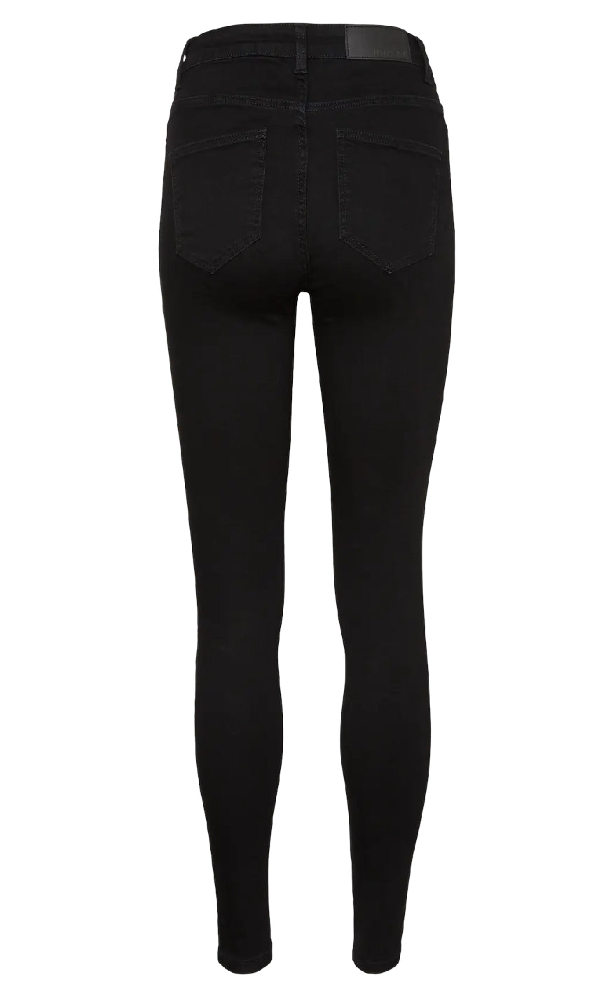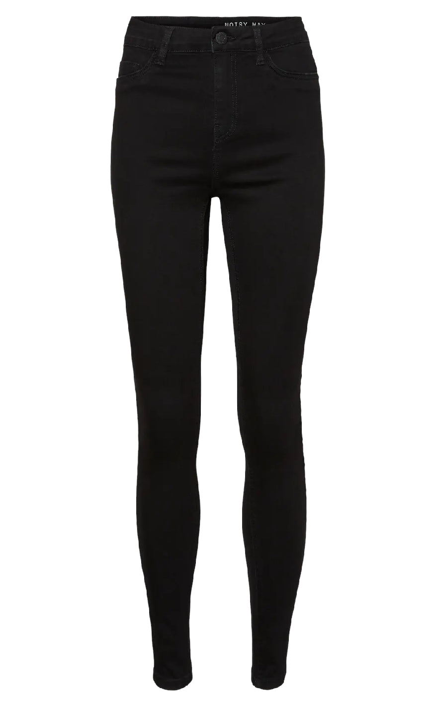 Sorte skinny jeans fra Noisy May i et klassisk ensfarvet design. Bukserne har høj talje, smalle ben og lukkes med knap og lynlås.