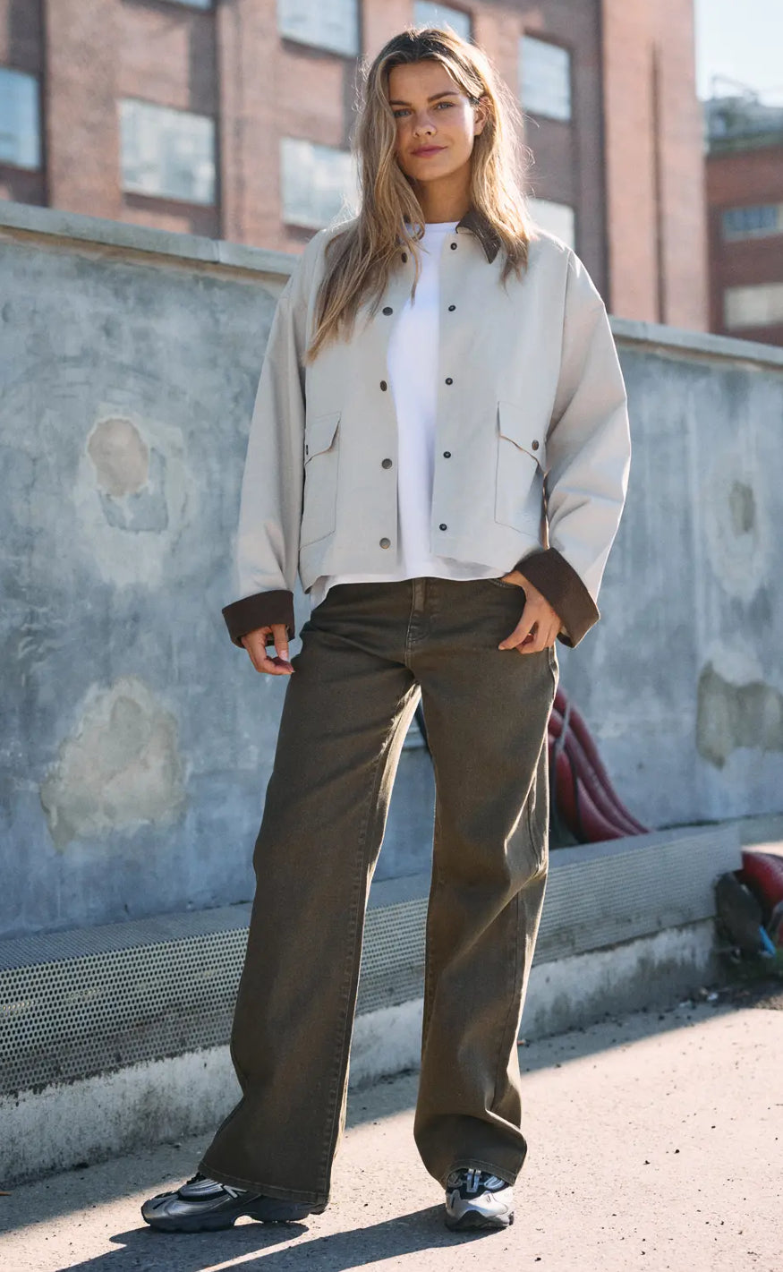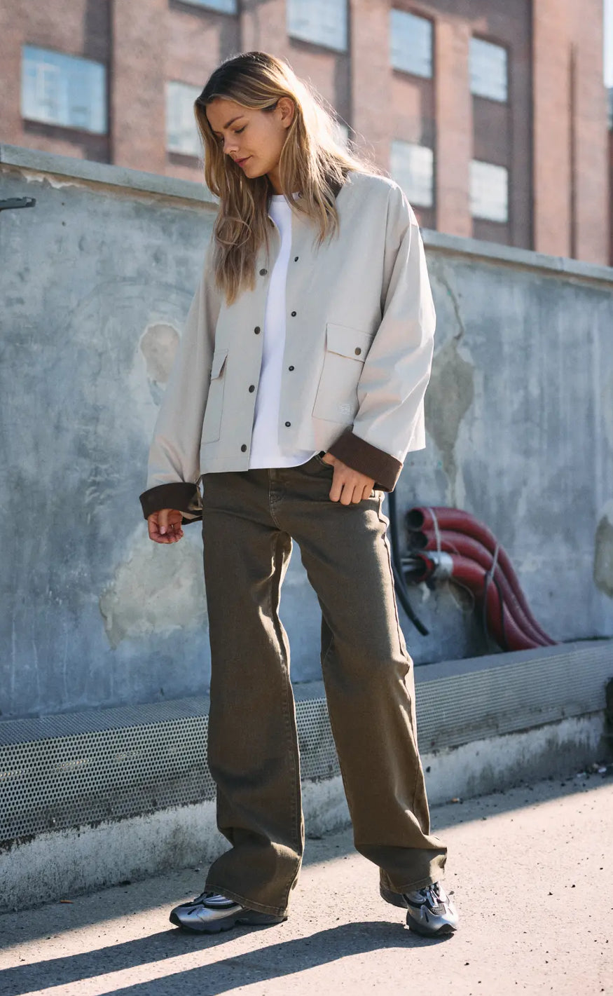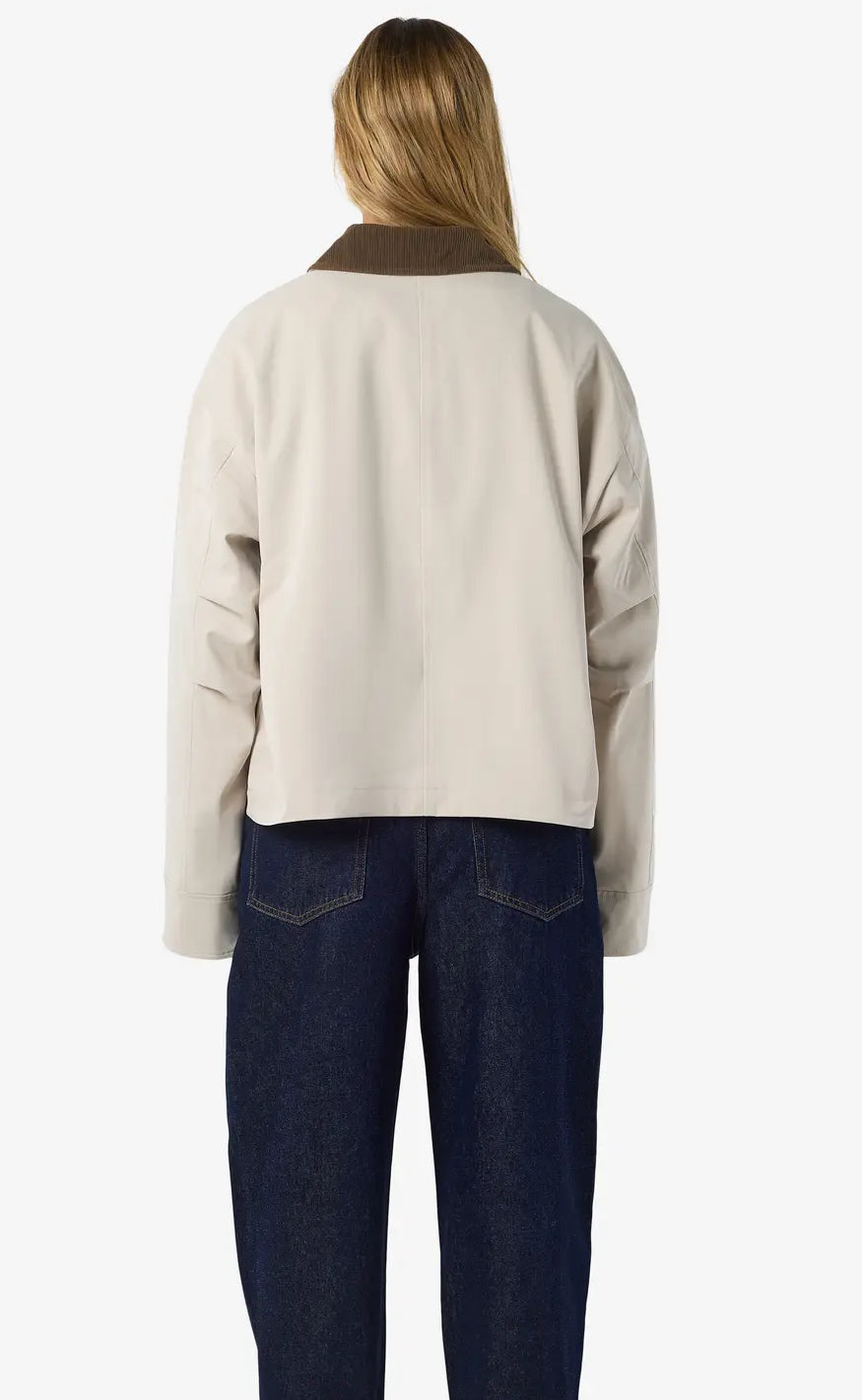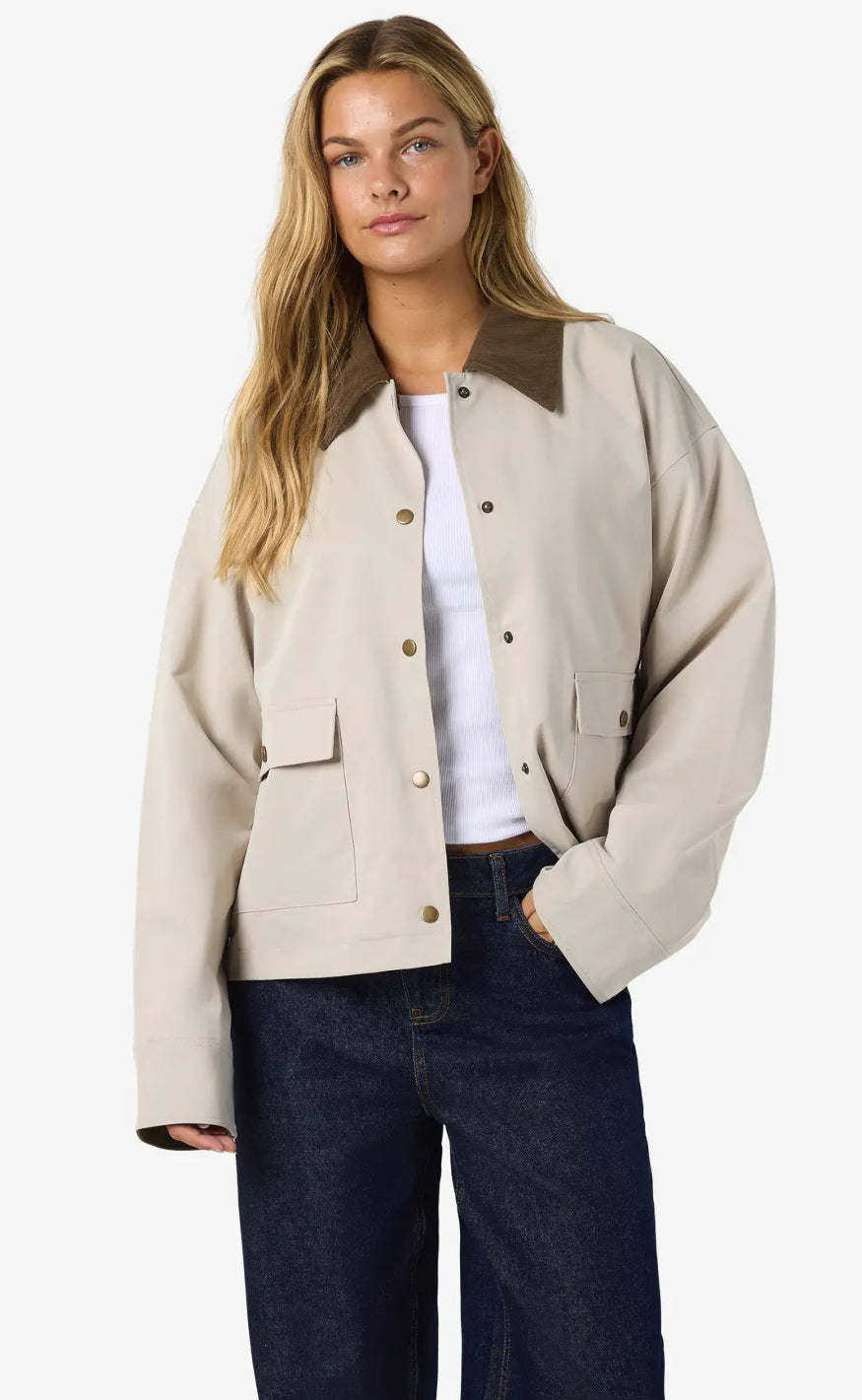 Stilren jakke fra Noisy May i en lys beige nuance med kontrastdetaljer i mørk brun på krave og manchetter.