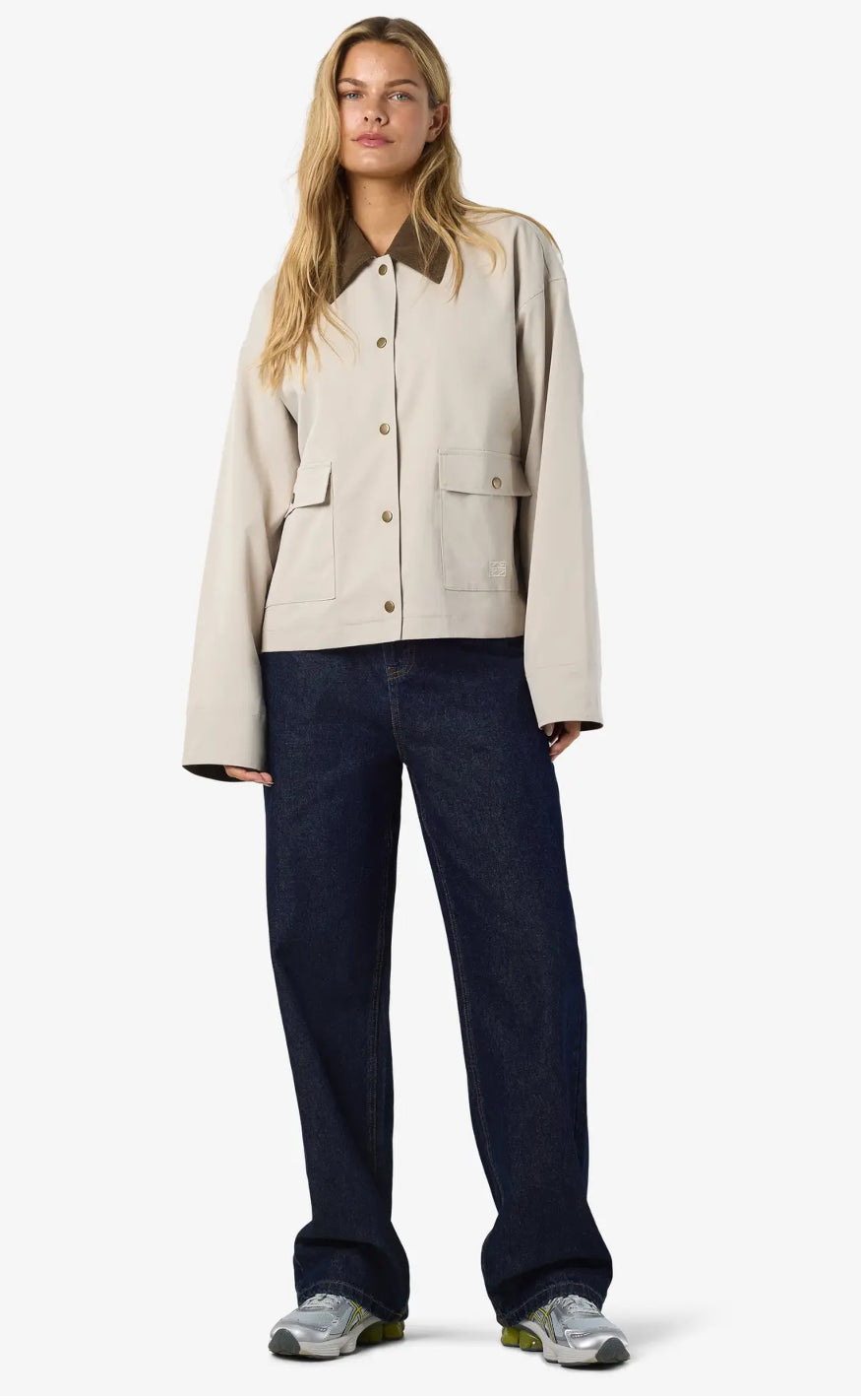 Jakken har trykknaplukning, store frontlommer med klap samt en lige og afslappet pasform, der giver et cool og moderne udtryk.