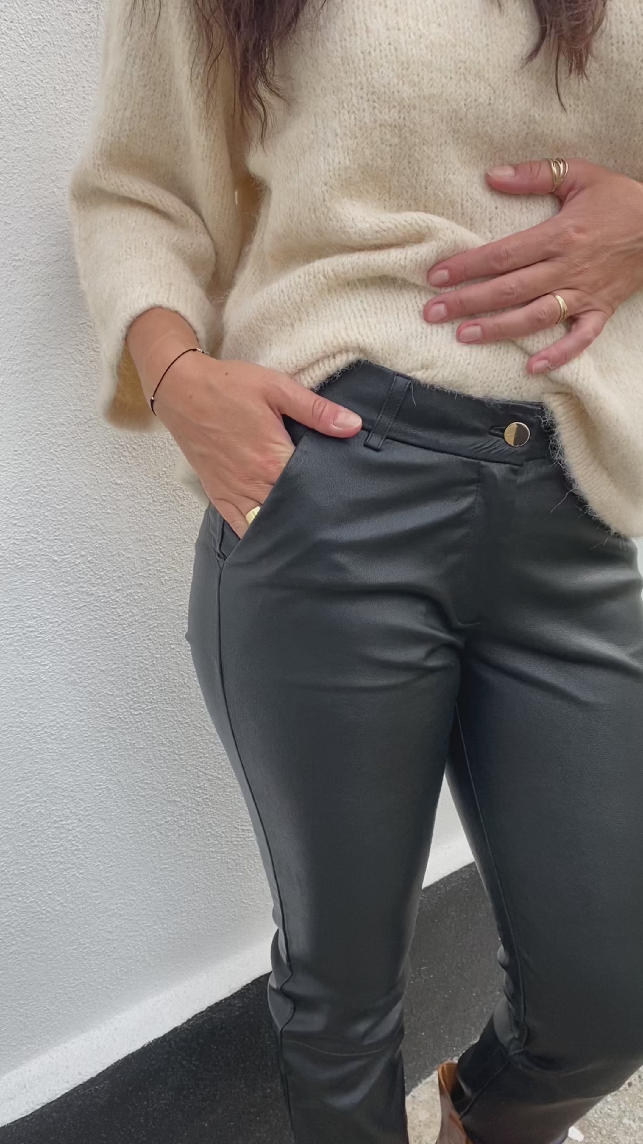 Eksklusive skindbukser i blødt og fleksibelt lammeskind med tidløse lige ben. Modellen er designet med saddle back-detalje og skrå lommer i siderne. Bukserne lukkes med lynlås og knap foran, og de markante syninger under knæene tilfører et ekstra strejf af kant.
