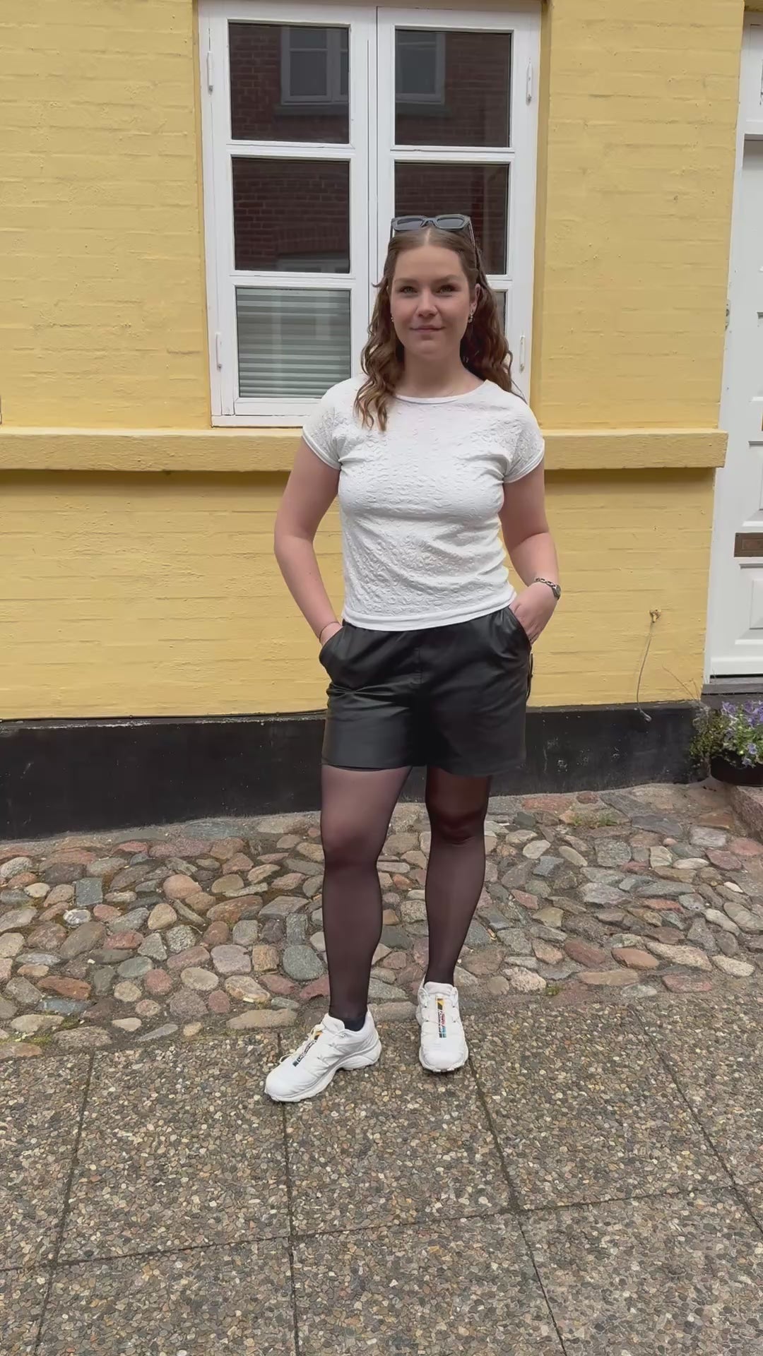 Korte lædershorts i blødt lammeskind med elastik i taljen, der giver både komfort og fleksibilitet. Modellen er designet med skrå sidelommer, saddleback-detalje bagpå og rå kant forneden, som tilfører et afslappet og moderne udtryk. Shortsene er alsidige og kan styles med alt fra t-shirt og sweatshirt til skjorte eller strik – perfekte både med strømpebukser om vinteren og bare ben i de varmere måneder.