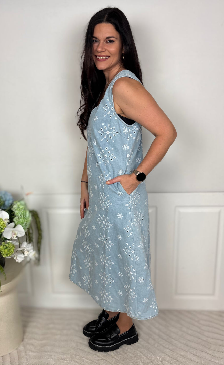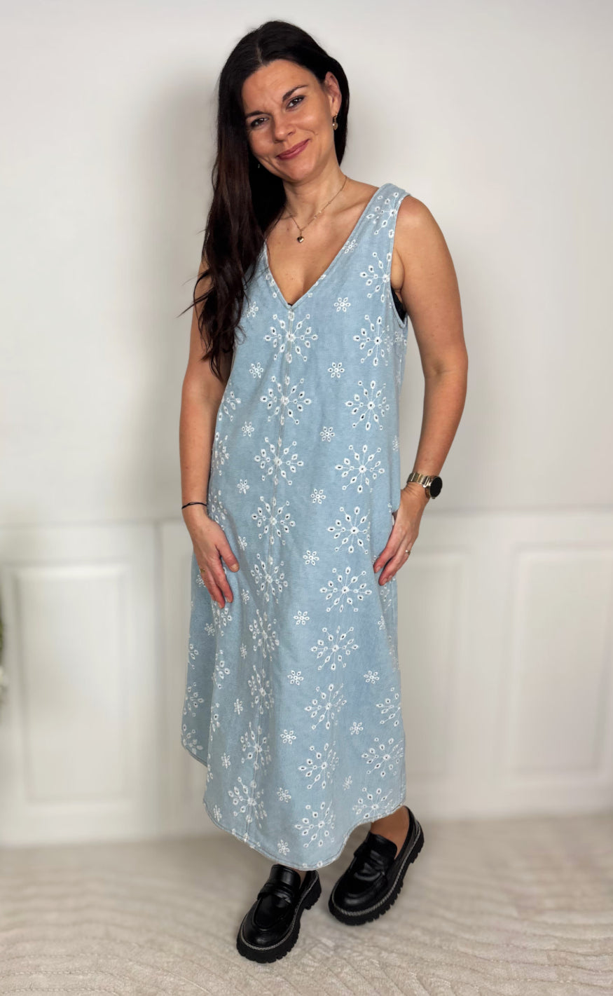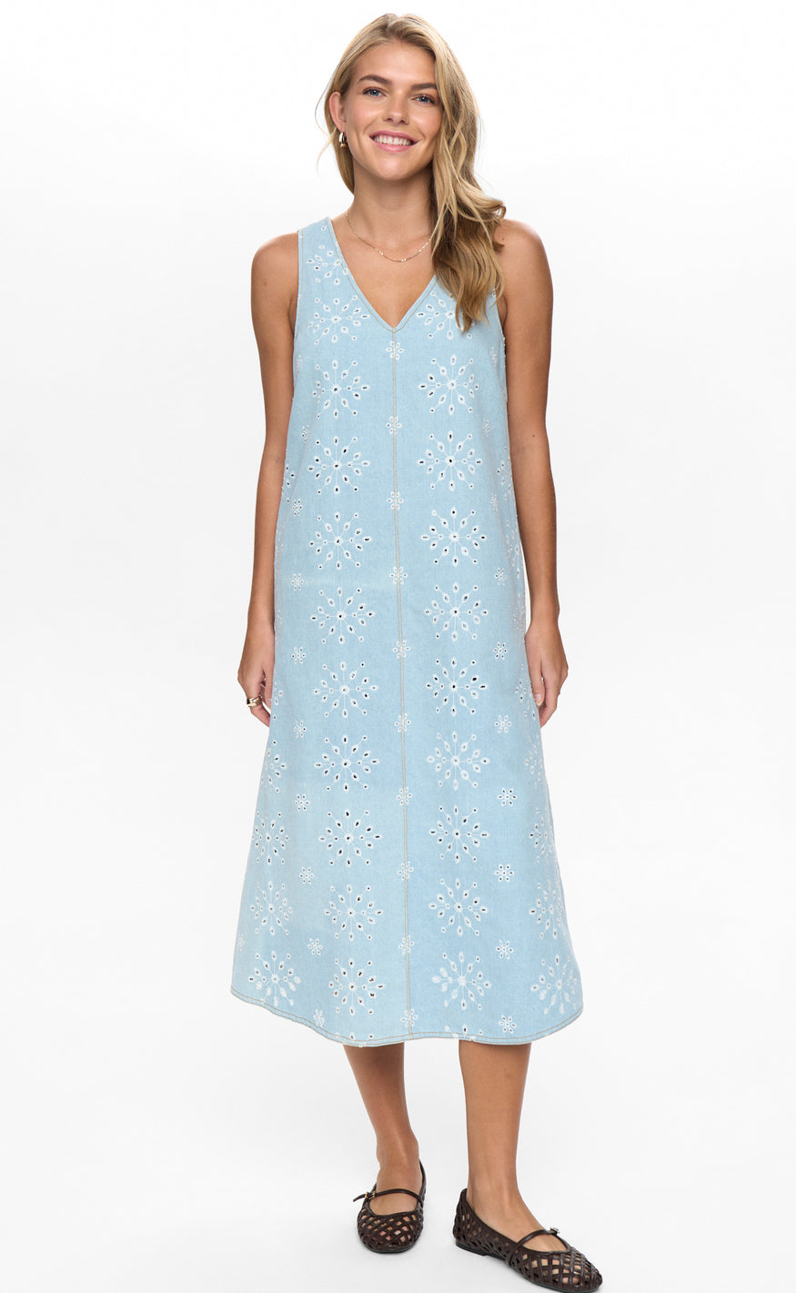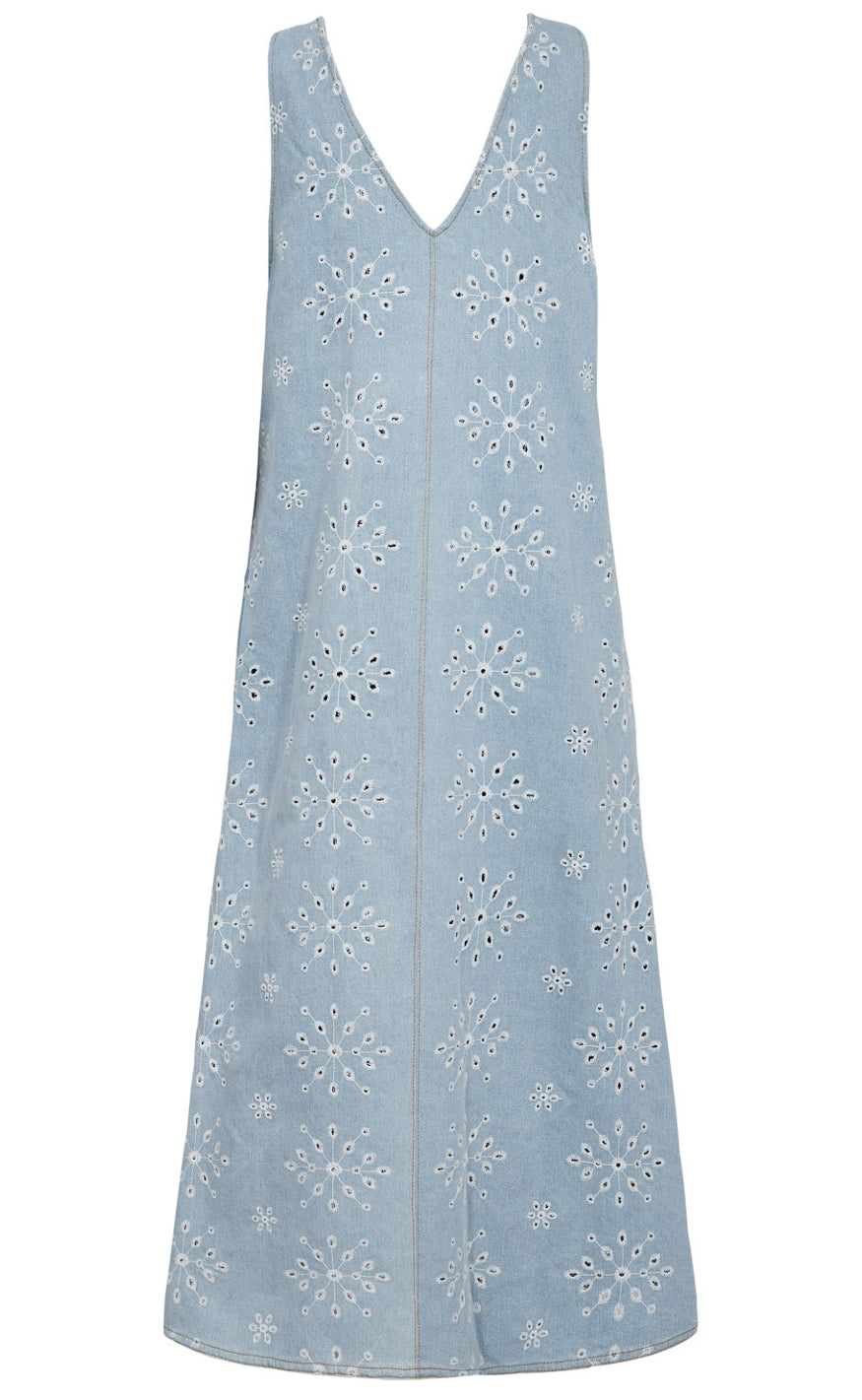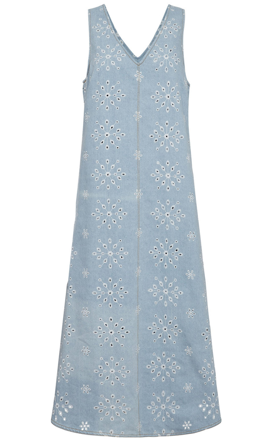 Feminin kjole fra Nümph i et lyseblåt denimlook med smukt broderet hulmønster.