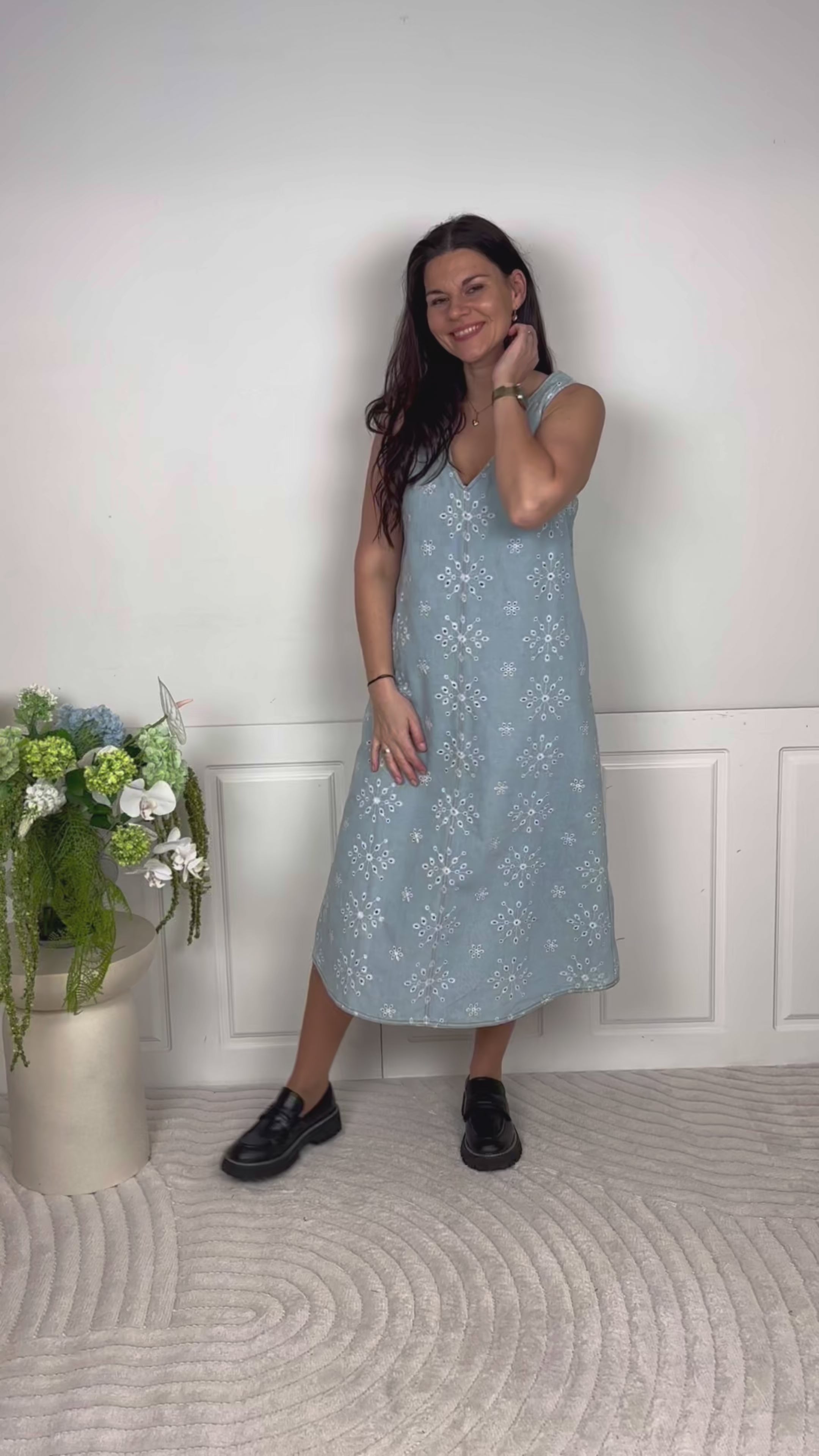 Kjolen er ærmeløs og har V-udskæring samt en lige, enkel silhuet, der giver et let og elegant udtryk.