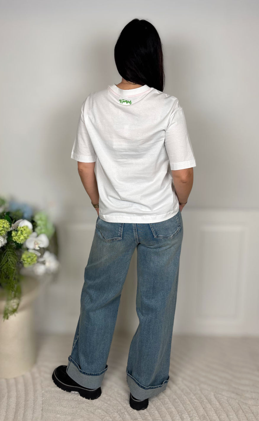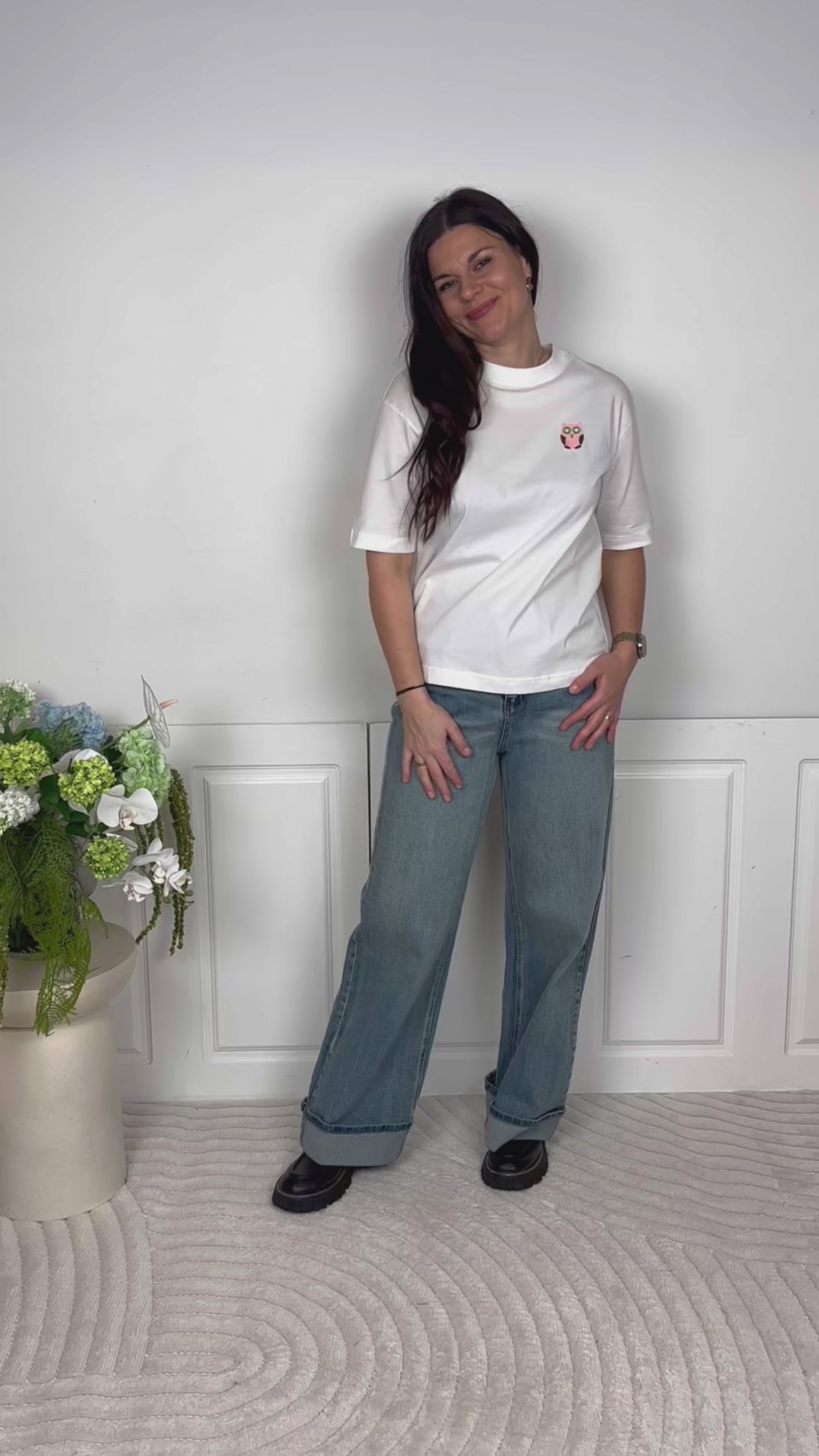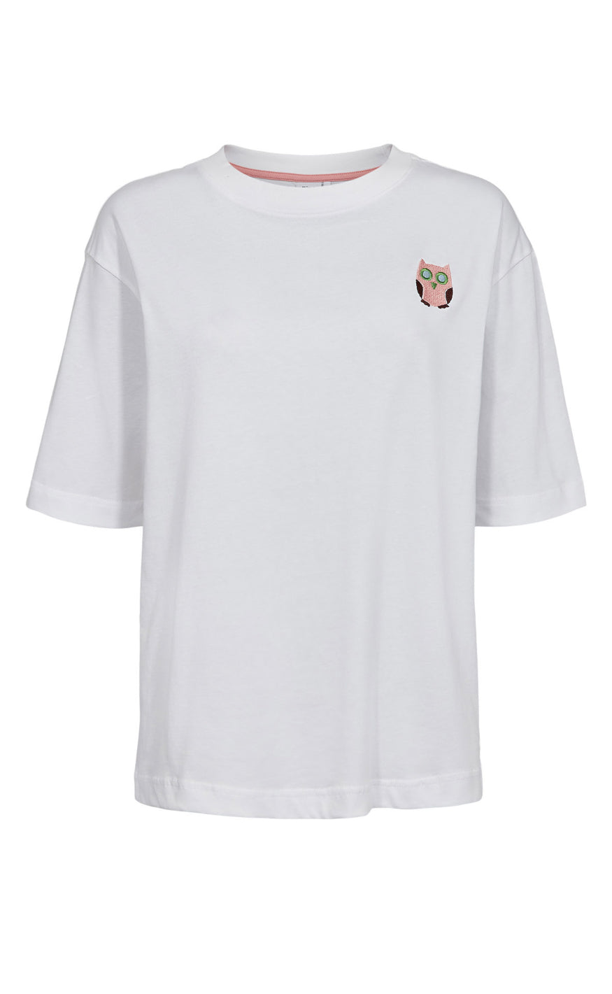 Klassisk hvid T-shirt fra Nümph med en lille, broderet ugle-detalje på brystet.