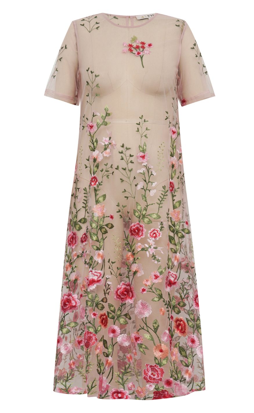 Elegant og feminin kjole fra A-View i en smuk nude nuance med farverigt, broderet blomsterprint.