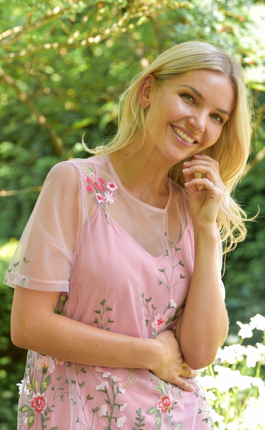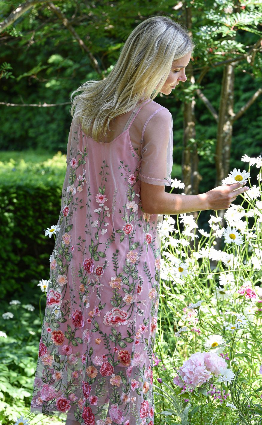 Det transparente mesh-materiale og de fine broderier skaber et eksklusivt udtryk, perfekt til festlige anledninger og særlige begivenheder.