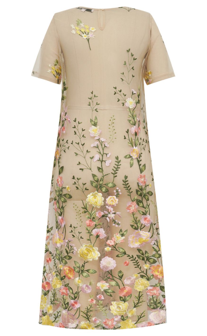 Romantisk og feminin kjole fra A-View i let, transparent mesh med smukt broderede blomster. Kjolen har korte ærmer, rund halsudskæring og en elegant, lige pasform, der giver et let og luftigt udtryk.