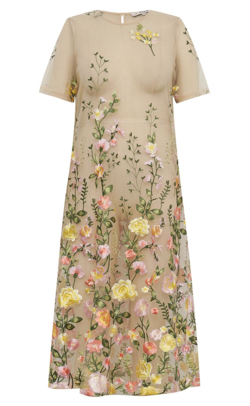 De fine blomsterdetaljer i bløde farver skaber et eksklusivt look, som gør kjolen velegnet til både festlige anledninger og særlige hverdage.