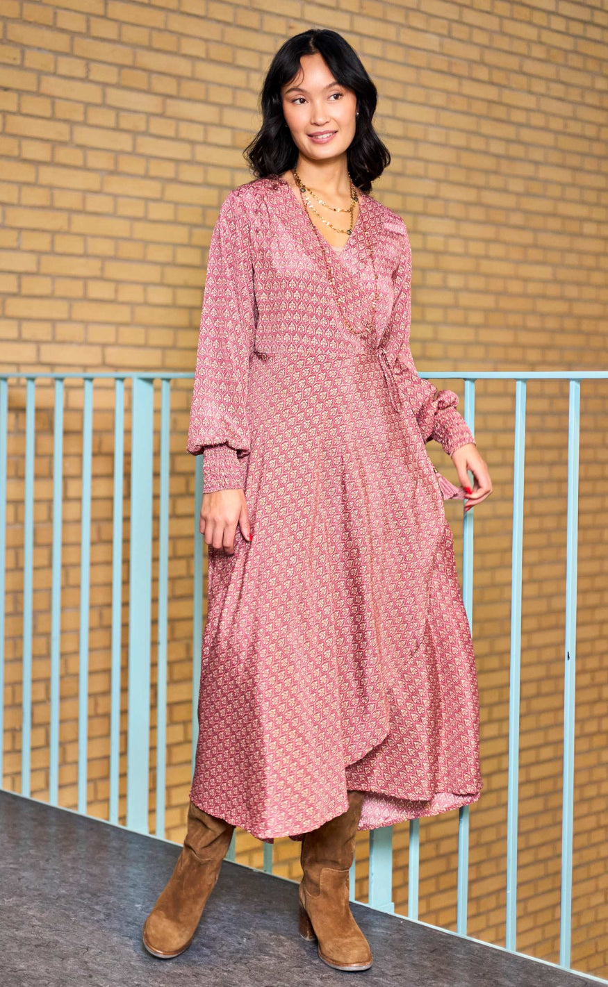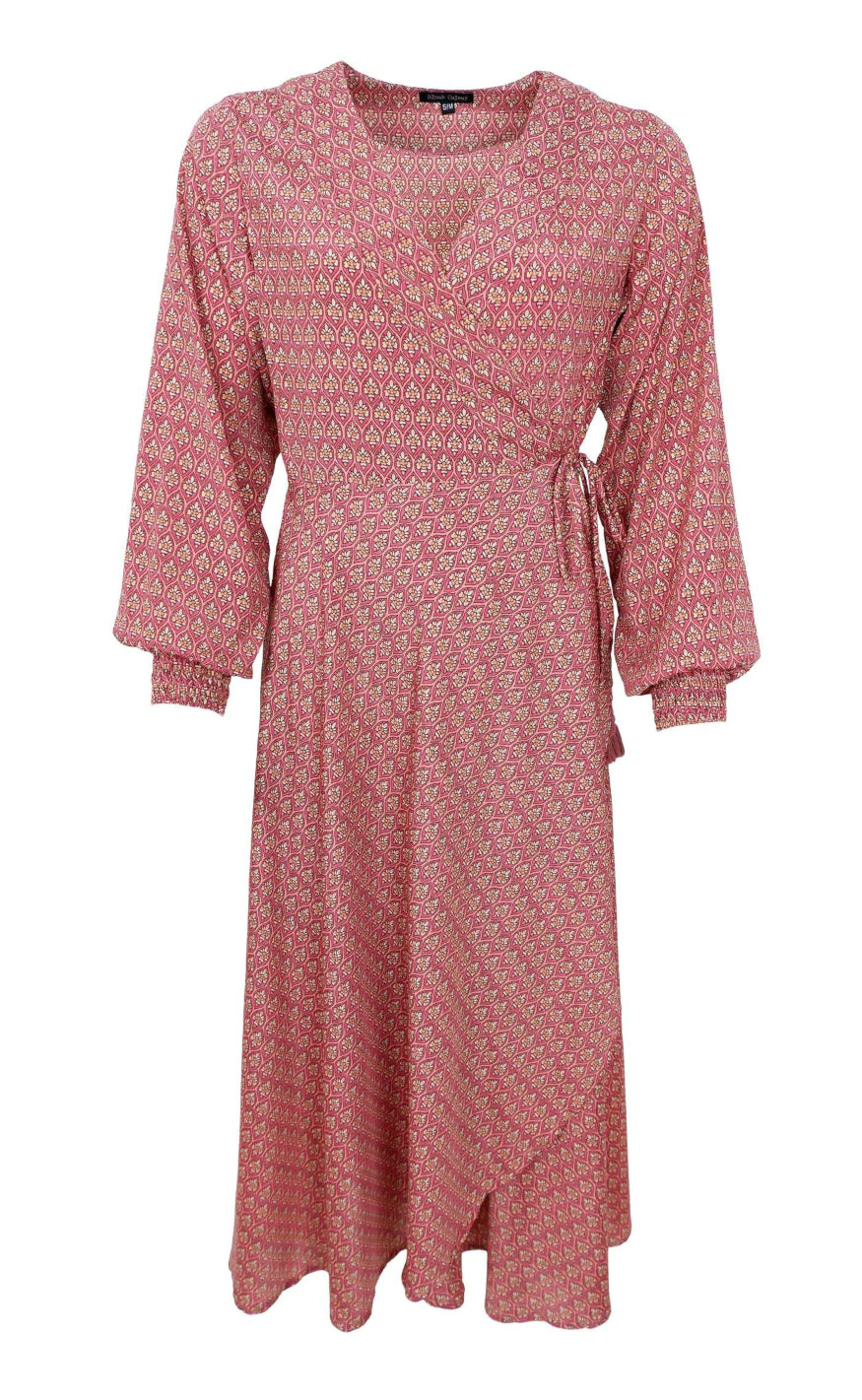 Kjolen har lange ærmer, V‑udskæring og et elegant slå‑om‑look med bindebånd i siden, der skaber en flatterende pasform og et let, flowy fald. Perfekt til både hverdag, sommerdage og pænere anledninger.