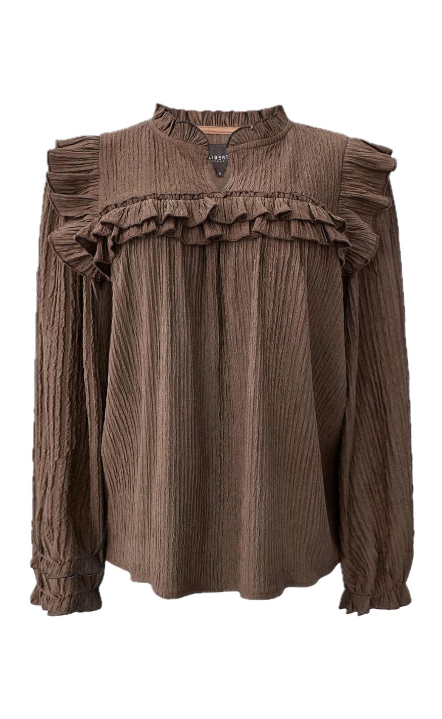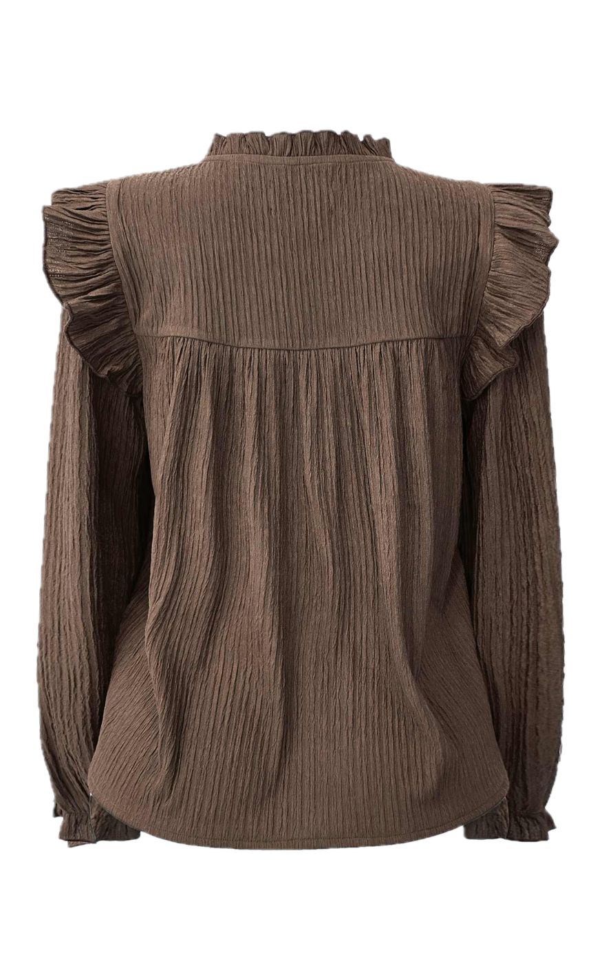 Elegant bluse i et let, struktureret materiale med fine flæsedetaljer ved skuldre og bryst, som giver et feminint udtryk.