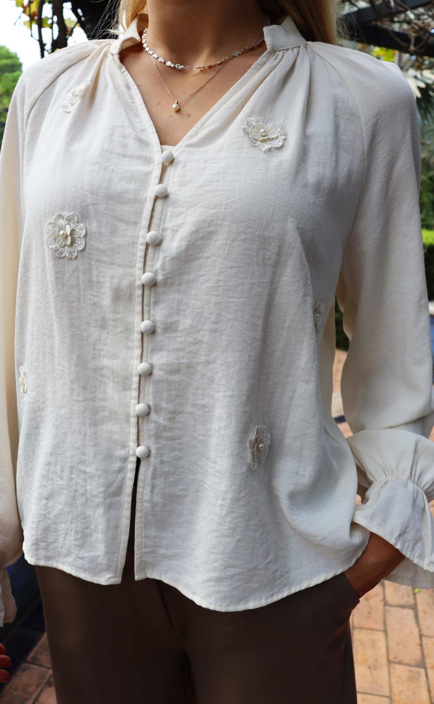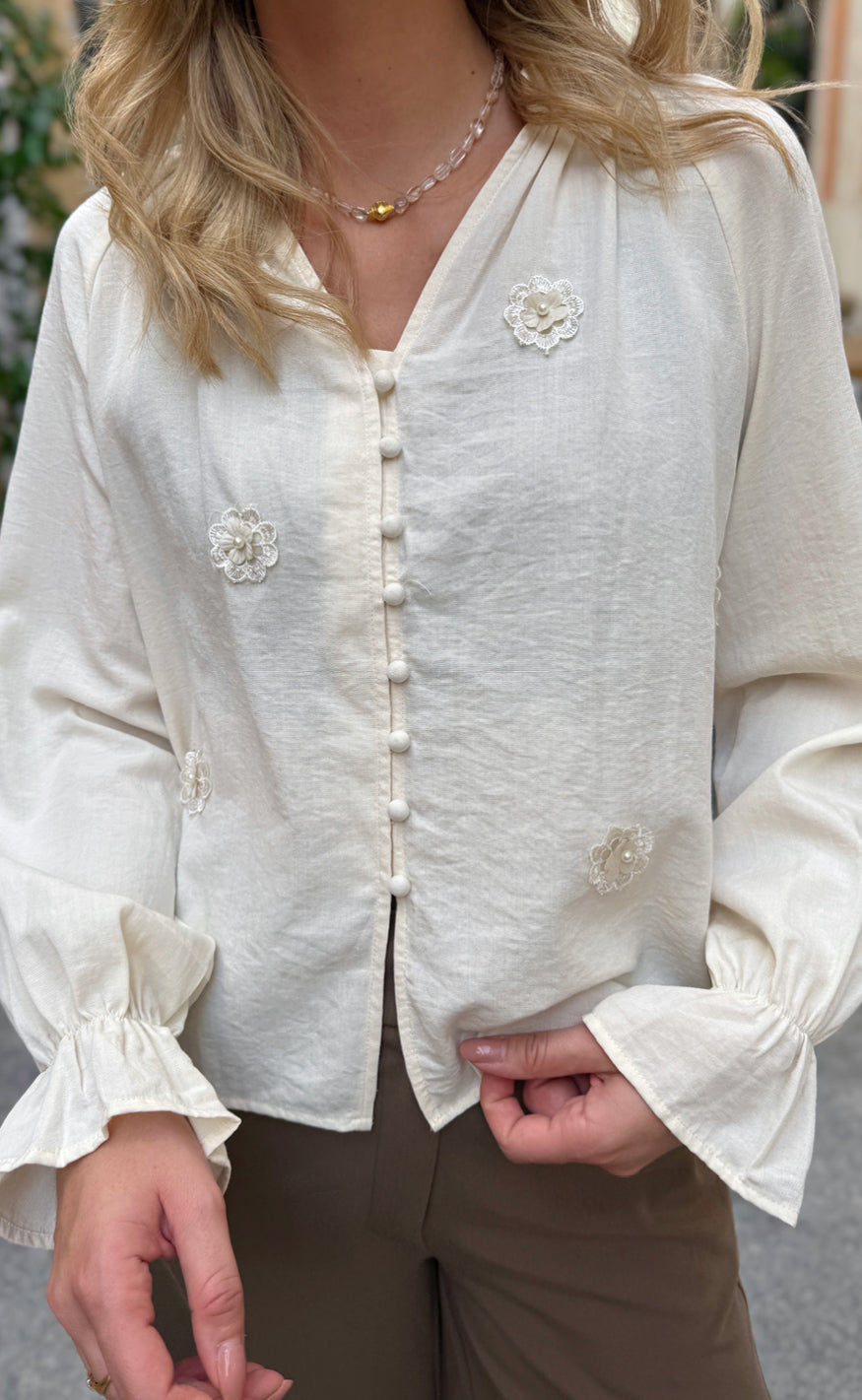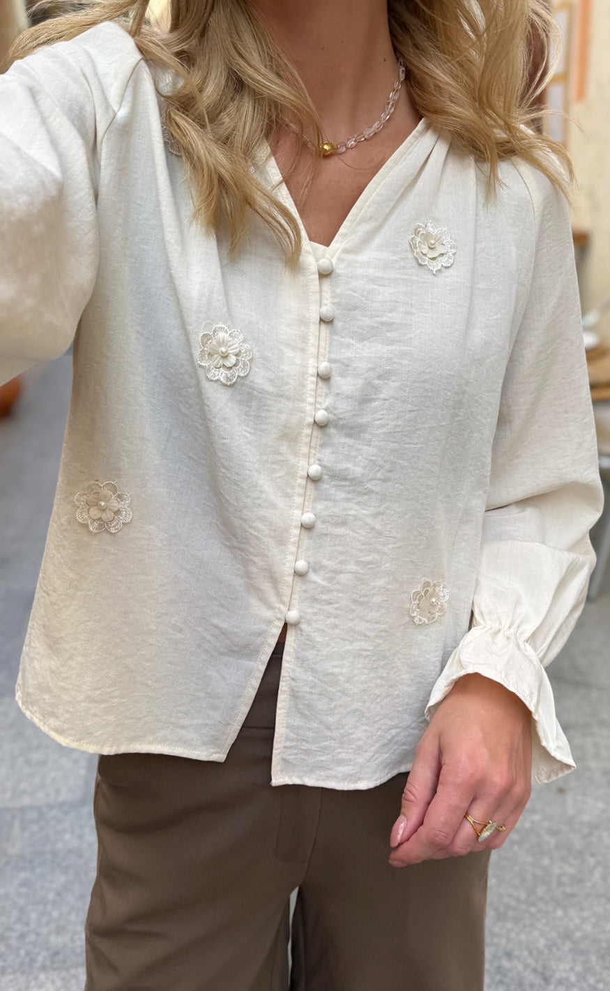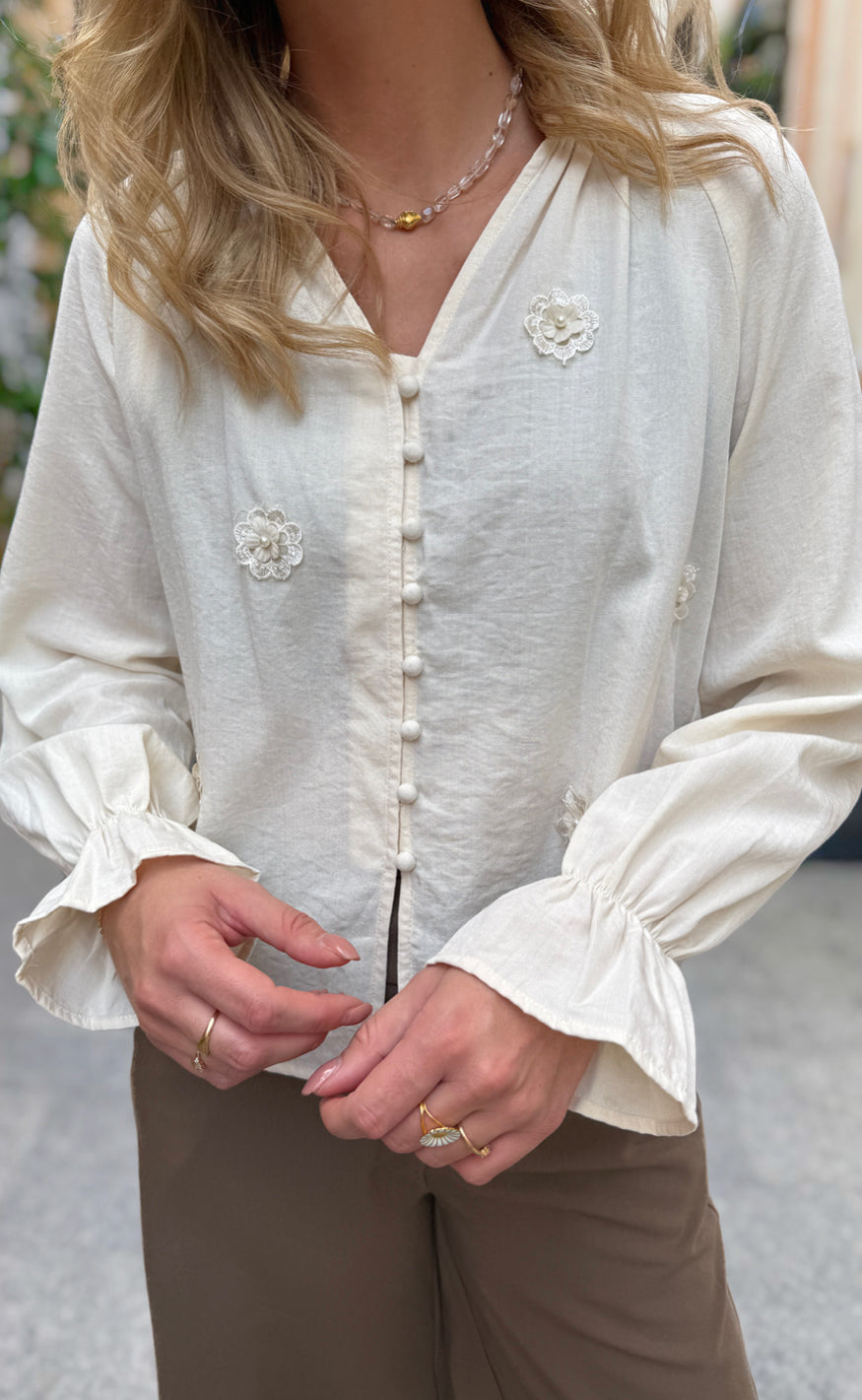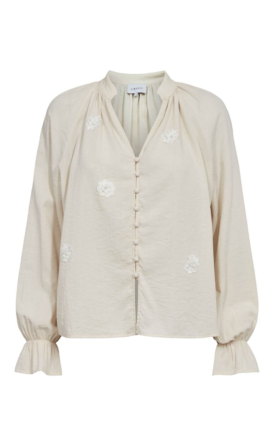 Elegant bluse fra Liberté i en lys, cremet nuance med fine blomsterapplikationer. Designet med V-udskæring, knaplukning foran og lange ærmer med let vidde og flæsekant.