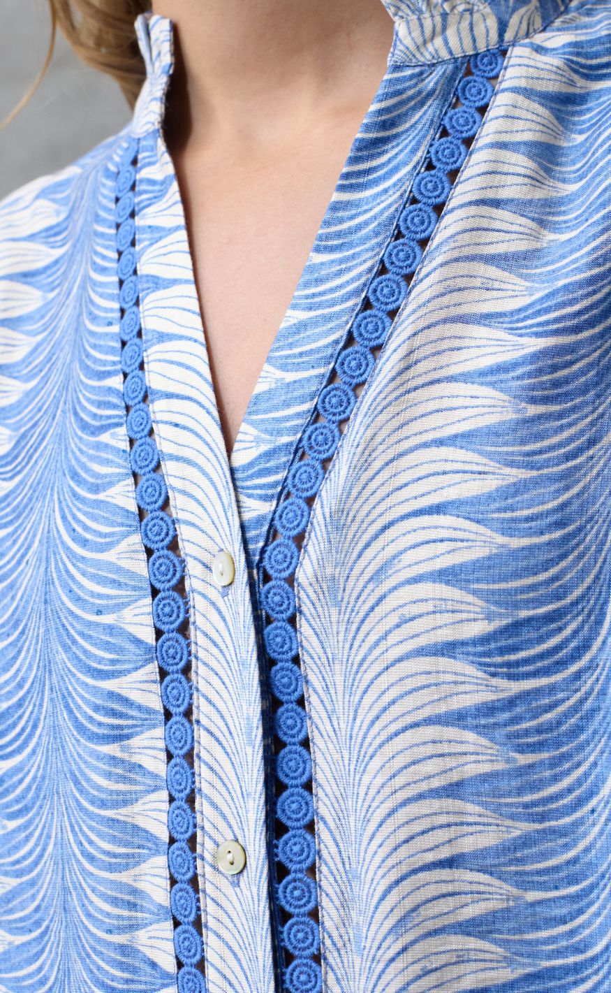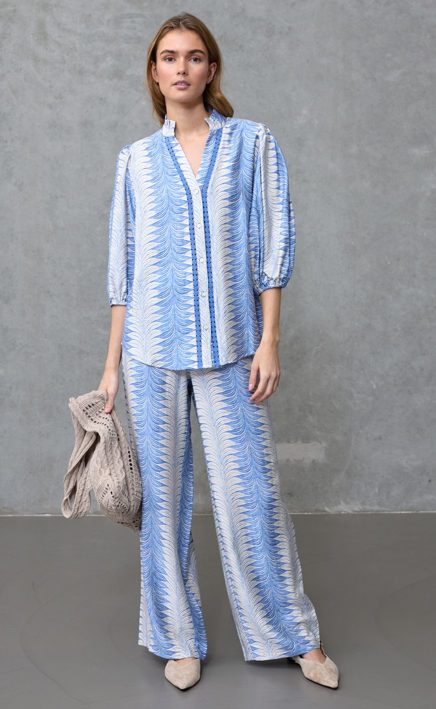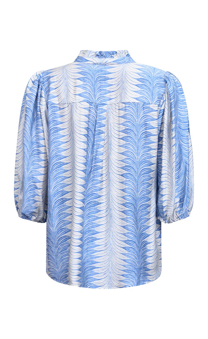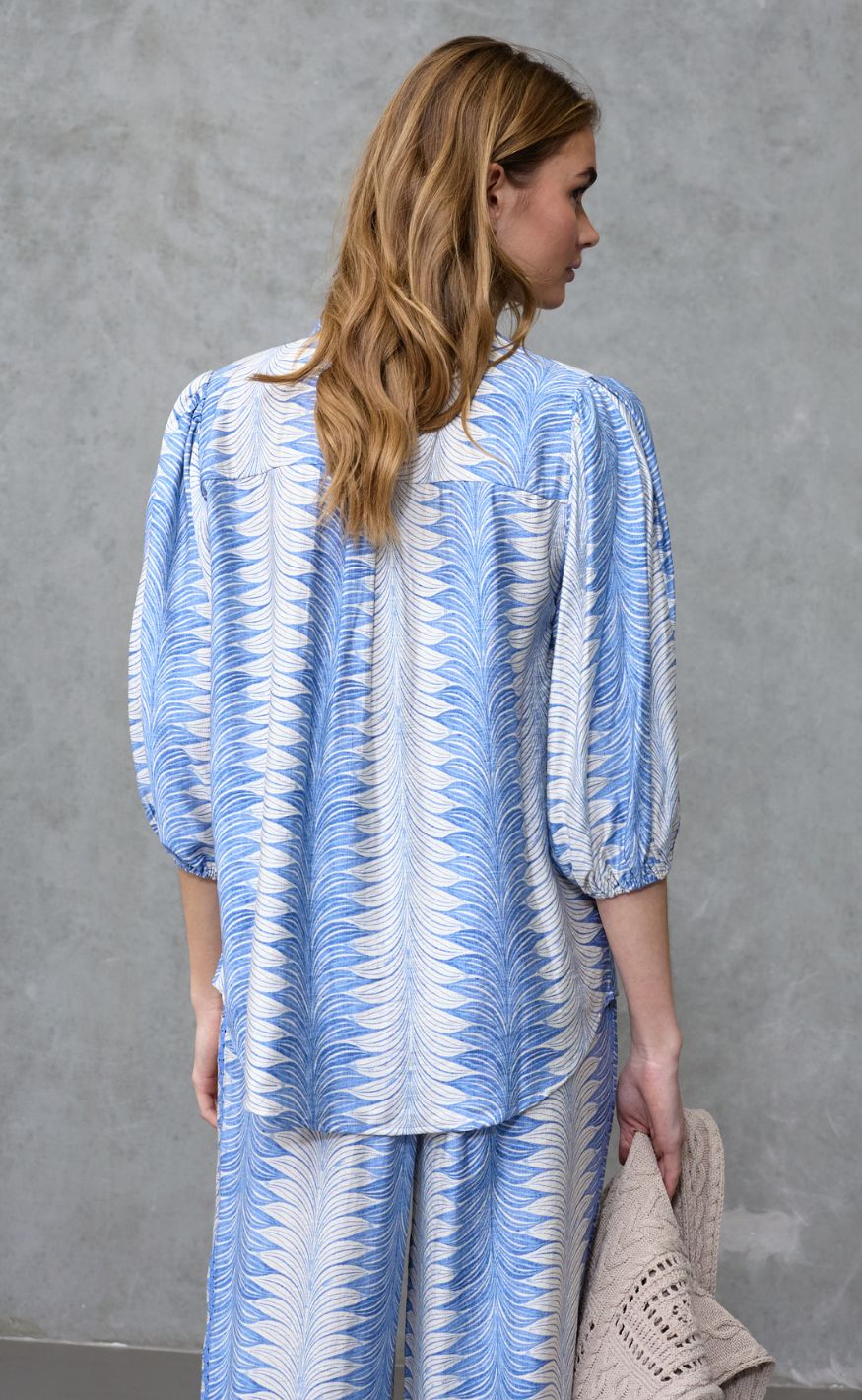 Let og feminin skjorte med et elegant grafisk print i blå og creme nuancer. Designet med V-udskæring, knaplukning og korte, let puffede ærmer, der giver et blødt og moderne udtryk.