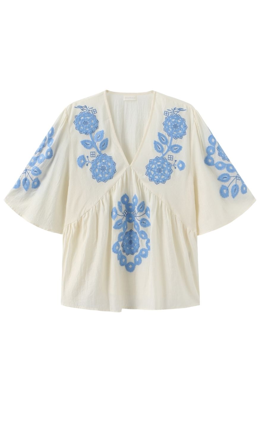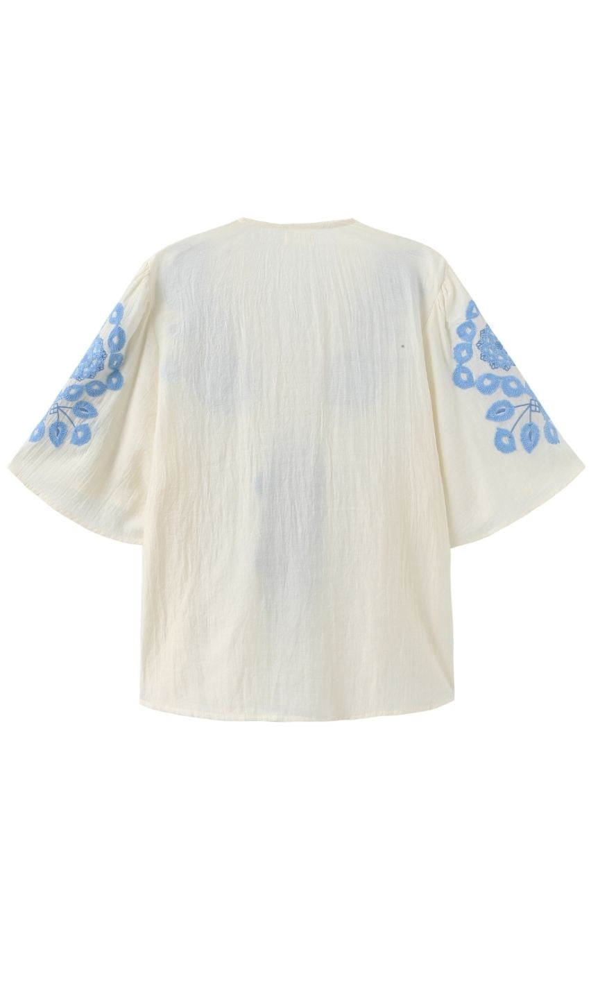 Feminin bluse fra Luxzuz i en let og luftig kvalitet med et smukt, afslappet fald. Designet har en løs pasform med V-udskæring og korte, vide ærmer, der giver et ubesværet og elegant udtryk. De fine, kontrastfarvede broderidetaljer tilfører et dekorativt og eksklusivt touch.
