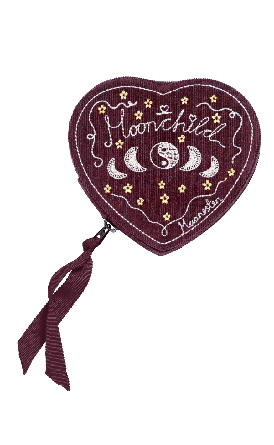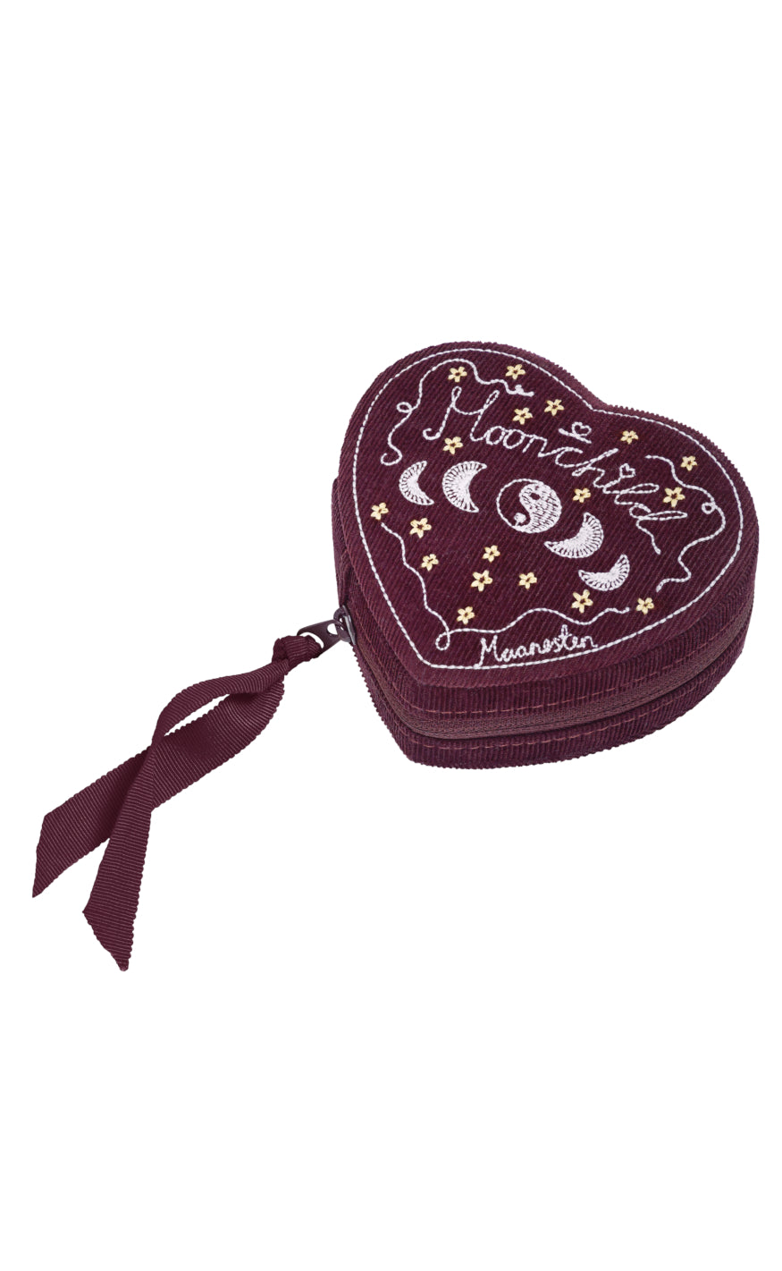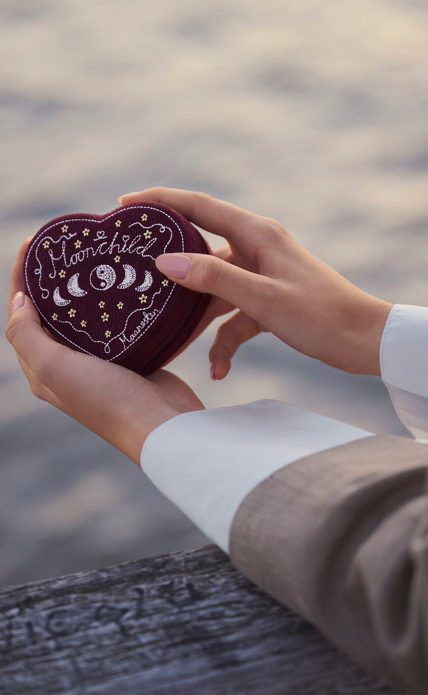Smukt og eventyrligt smykkeskrin fra Maanesten i en dyb bordeaux nuance, formet som et hjerte og pyntet med fine, broderede månefaser og stjerner.