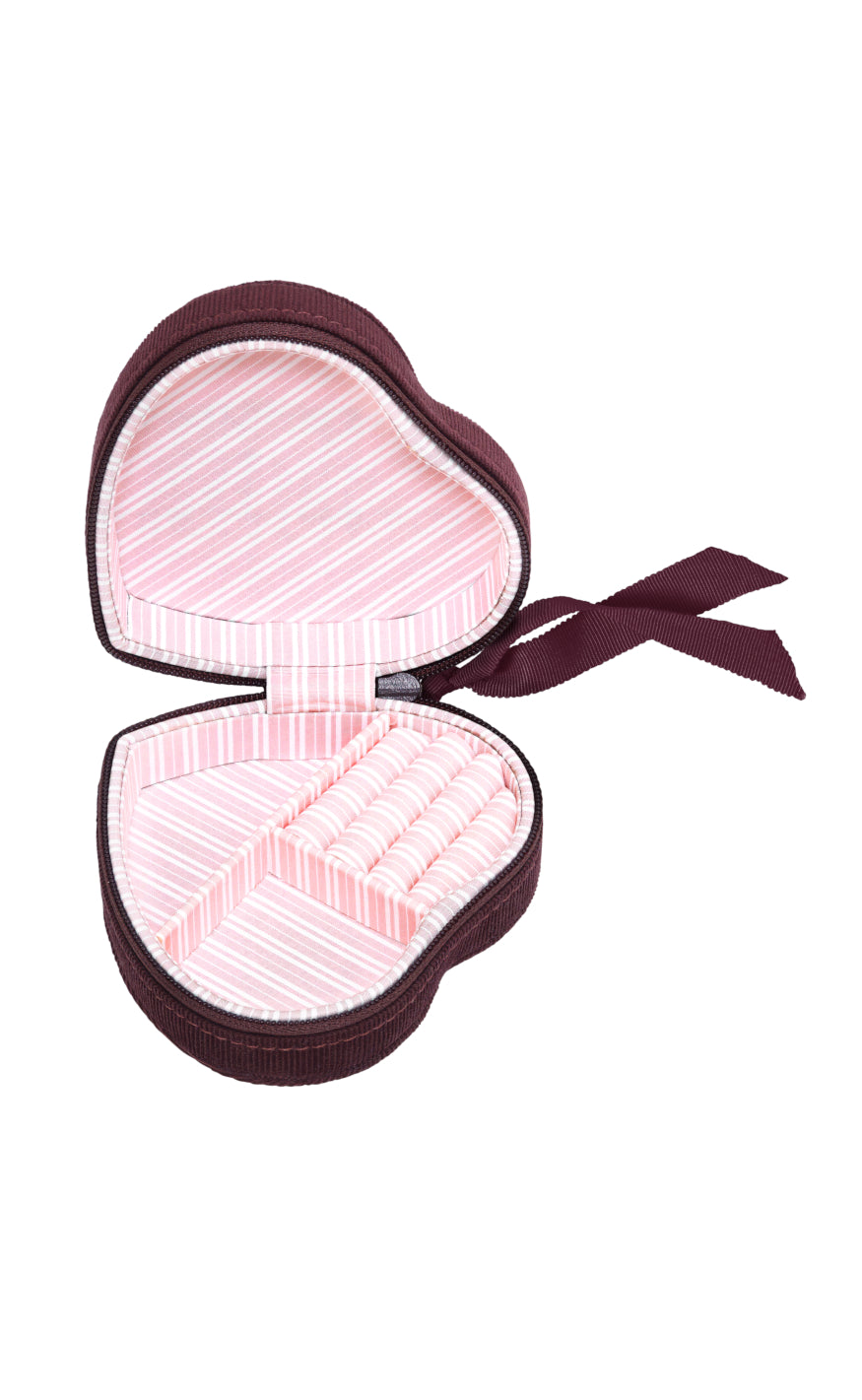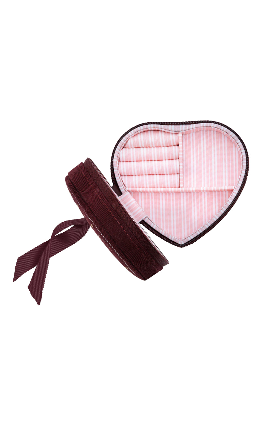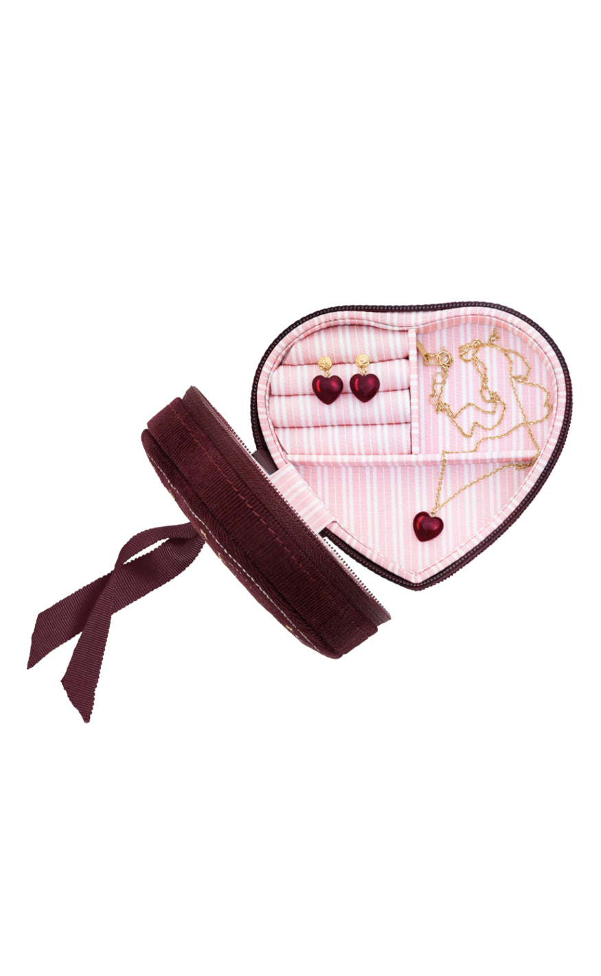 Smukt og eventyrligt smykkeskrin fra Maanesten i en dyb bordeaux nuance, formet som et hjerte og pyntet med fine, broderede månefaser og stjerner.