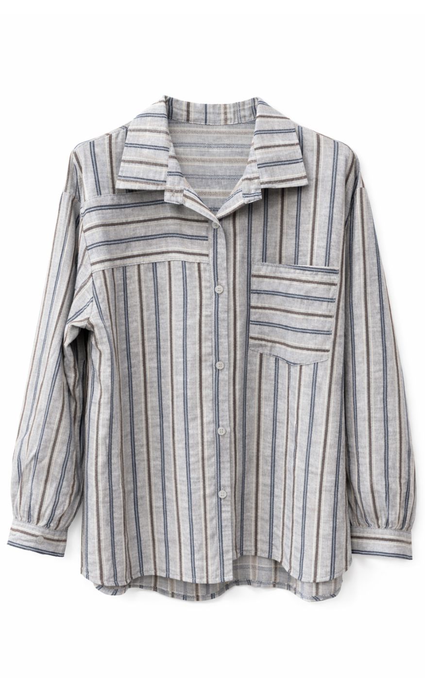 Skjorten har lange ærmer, klassisk krave, knaplukning foran og brystlomme, som giver et casual og tidløst udtryk – nem at style både lukket eller åben.