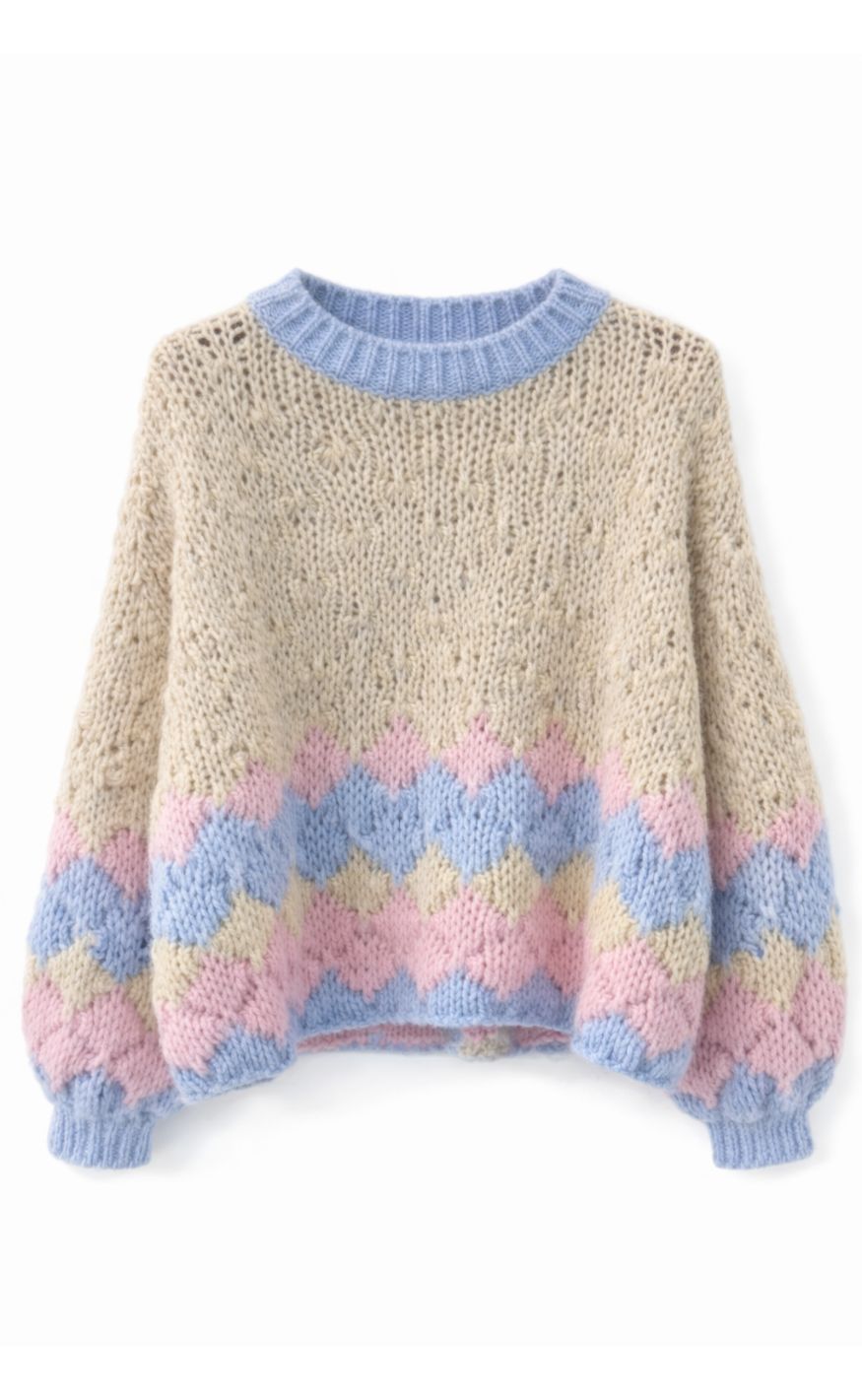 Chunky strik med beige top og pastelfarvede diamantmønstre nederst og på ærmerne.