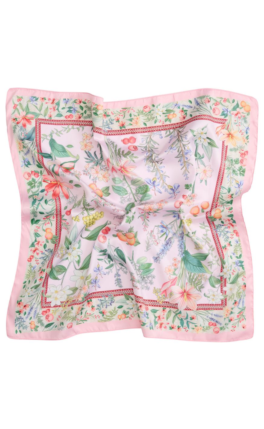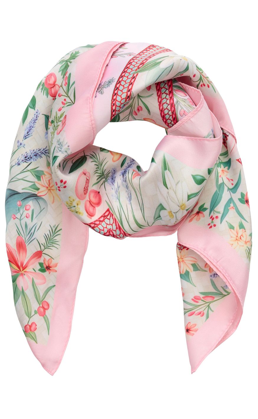 Dette tørklæde kombinerer bløde rosa nuancer med fine blomsterdetaljer og dekorative elementer.