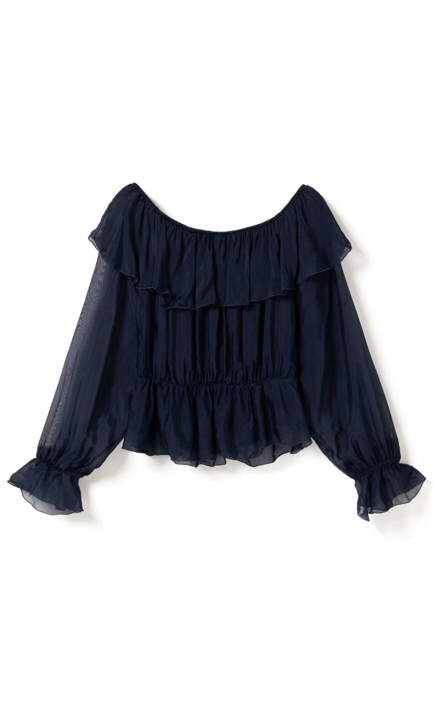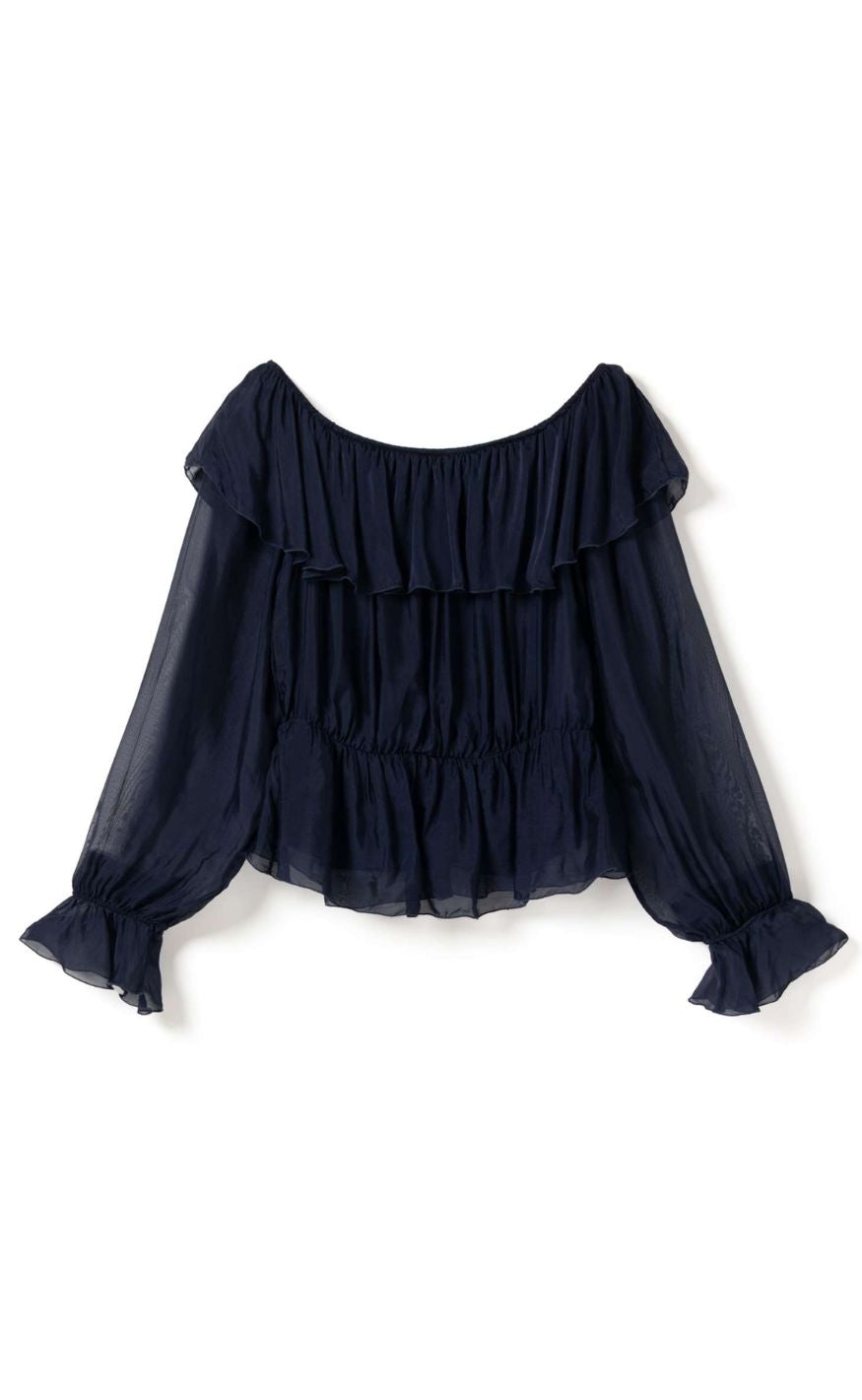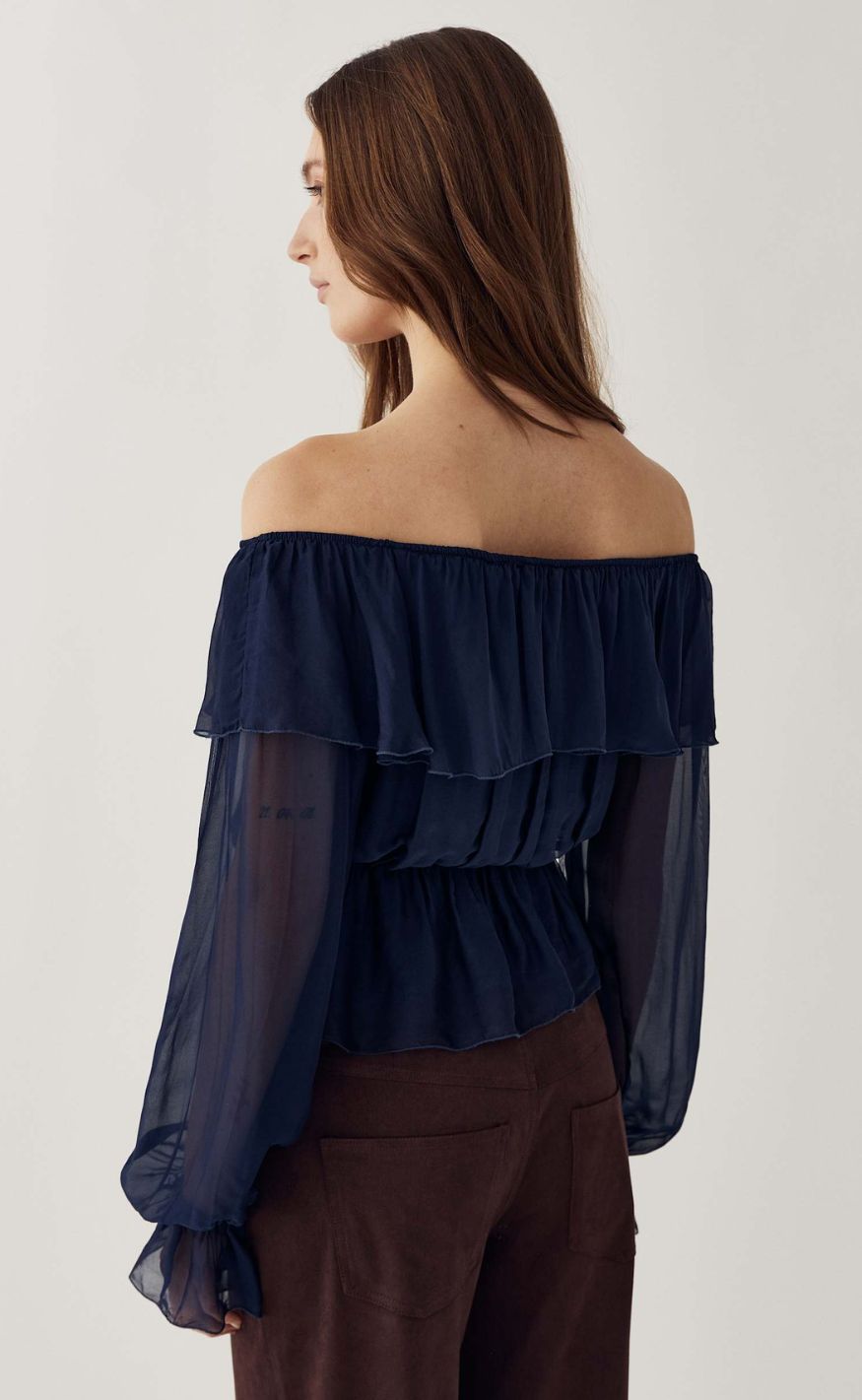 Feminin off-shoulder bluse i en let og transparent kvalitet med smukke flæsedetaljer, der giver et elegant og luftigt udtryk. Den elastiske halsudskæring og talje skaber en flatterende pasform, som gør blusen perfekt både til festlige anledninger og til et mere sofistikeret hverdagslook.