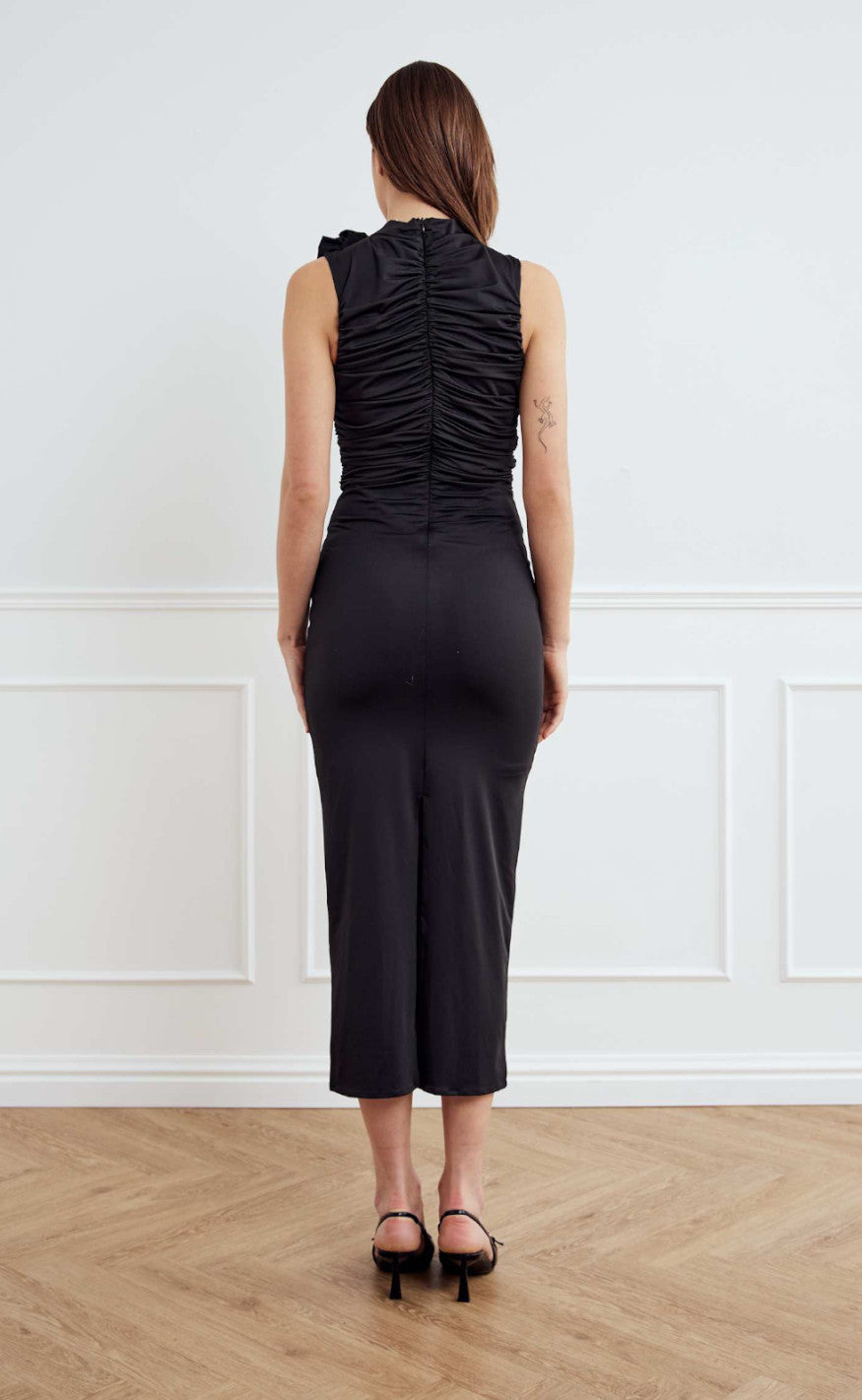 Kjolen er lang og sidder tæt samt har den en fin blomsterdetalje.