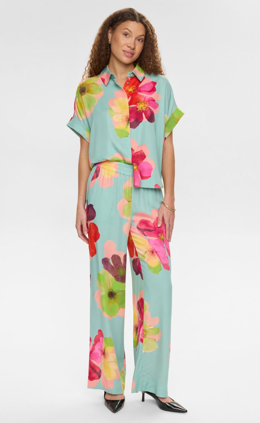 Farverige og feminine bukser fra Nümph med et smukt blomsterprint. Bukserne har elastisk talje og brede ben, som giver en behagelig pasform og et elegant, flydende udtryk.