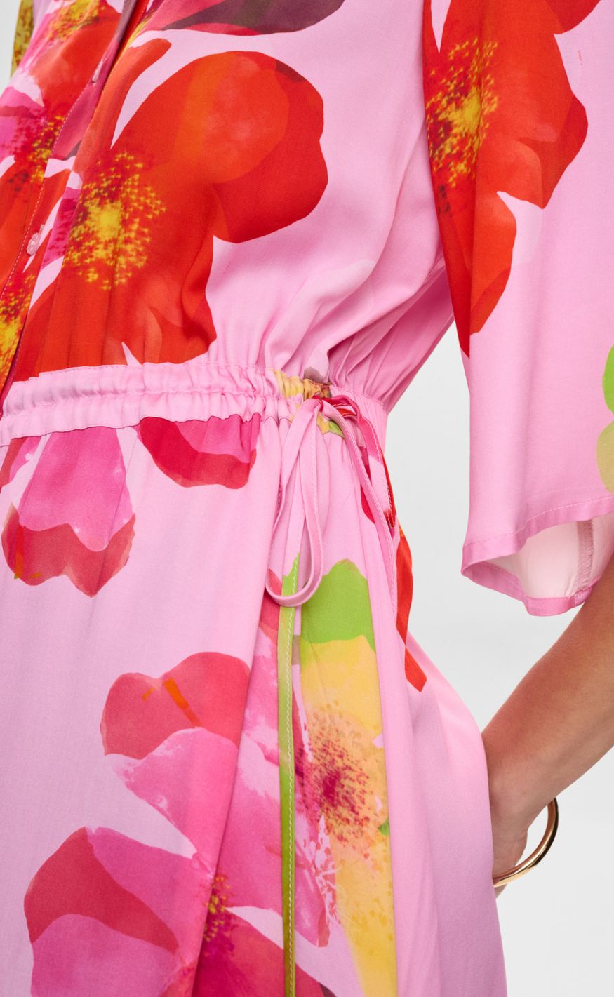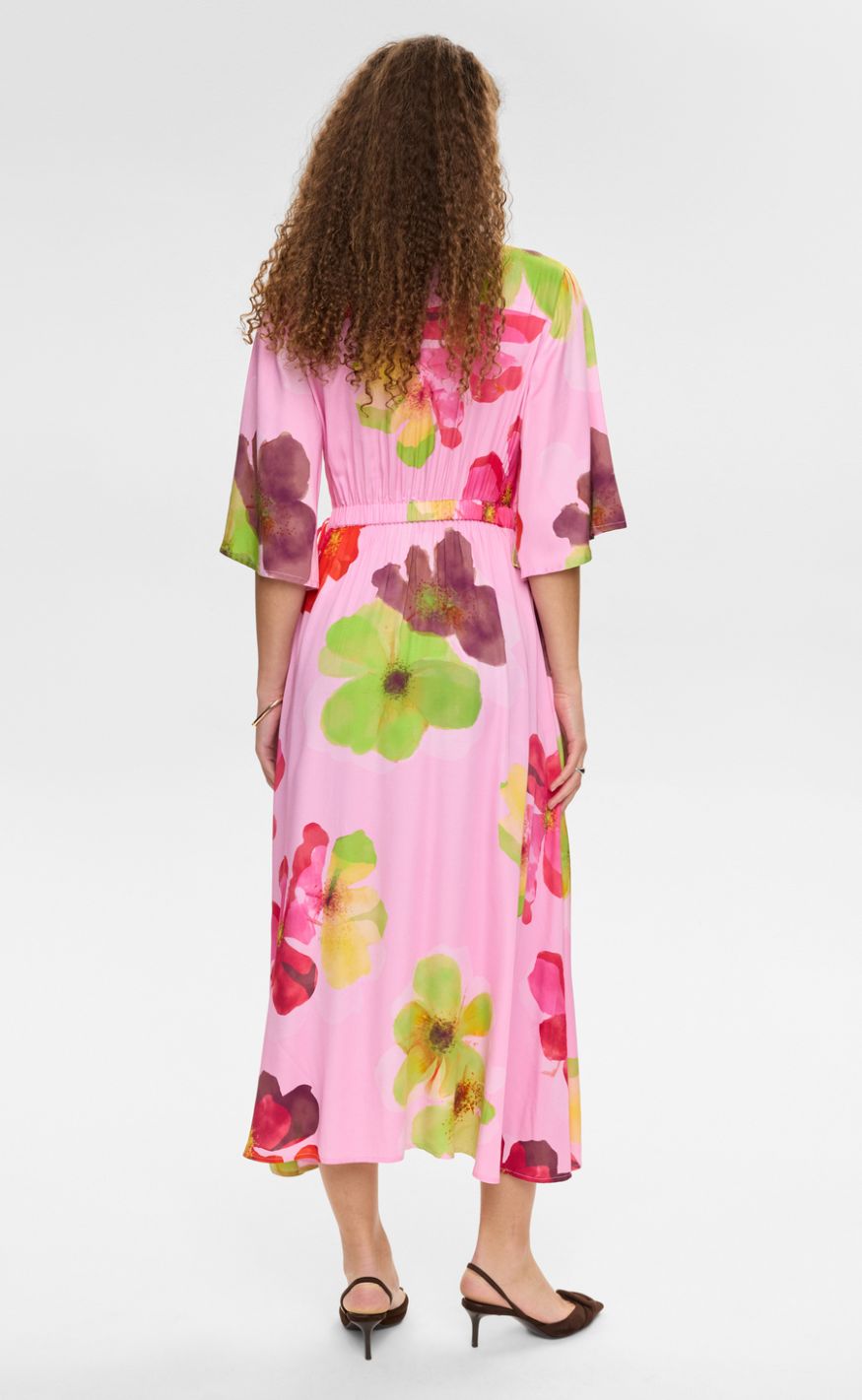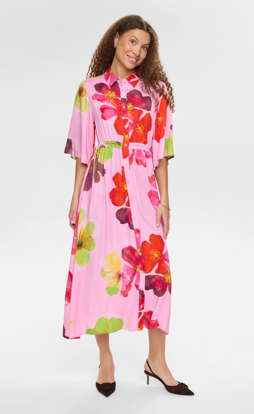 Den justerbare talje med bindebånd fremhæver figuren, mens den lette kvalitet og midi-længden gør kjolen perfekt til både hverdag og festlige anledninger.
