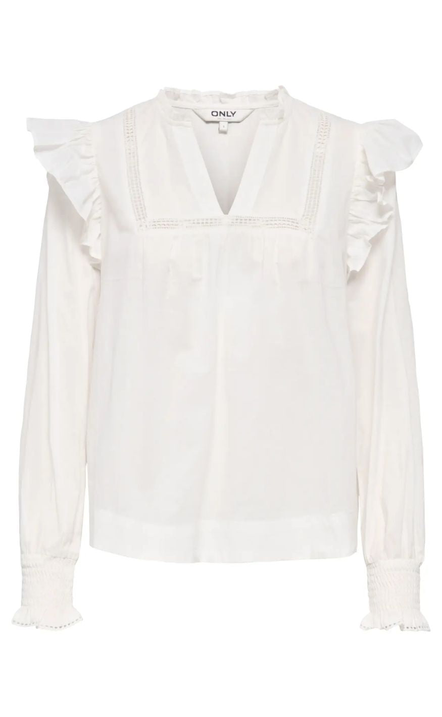 Feminin bluse fra Only med smukke flæsedetaljer og en lille v- udskæring ved halsen.