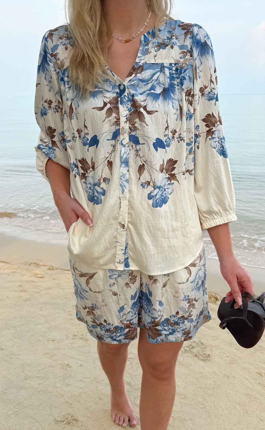 Feminine og sommerlige shorts i off white med et smukt blomsterprint i blå og brune nuancer.