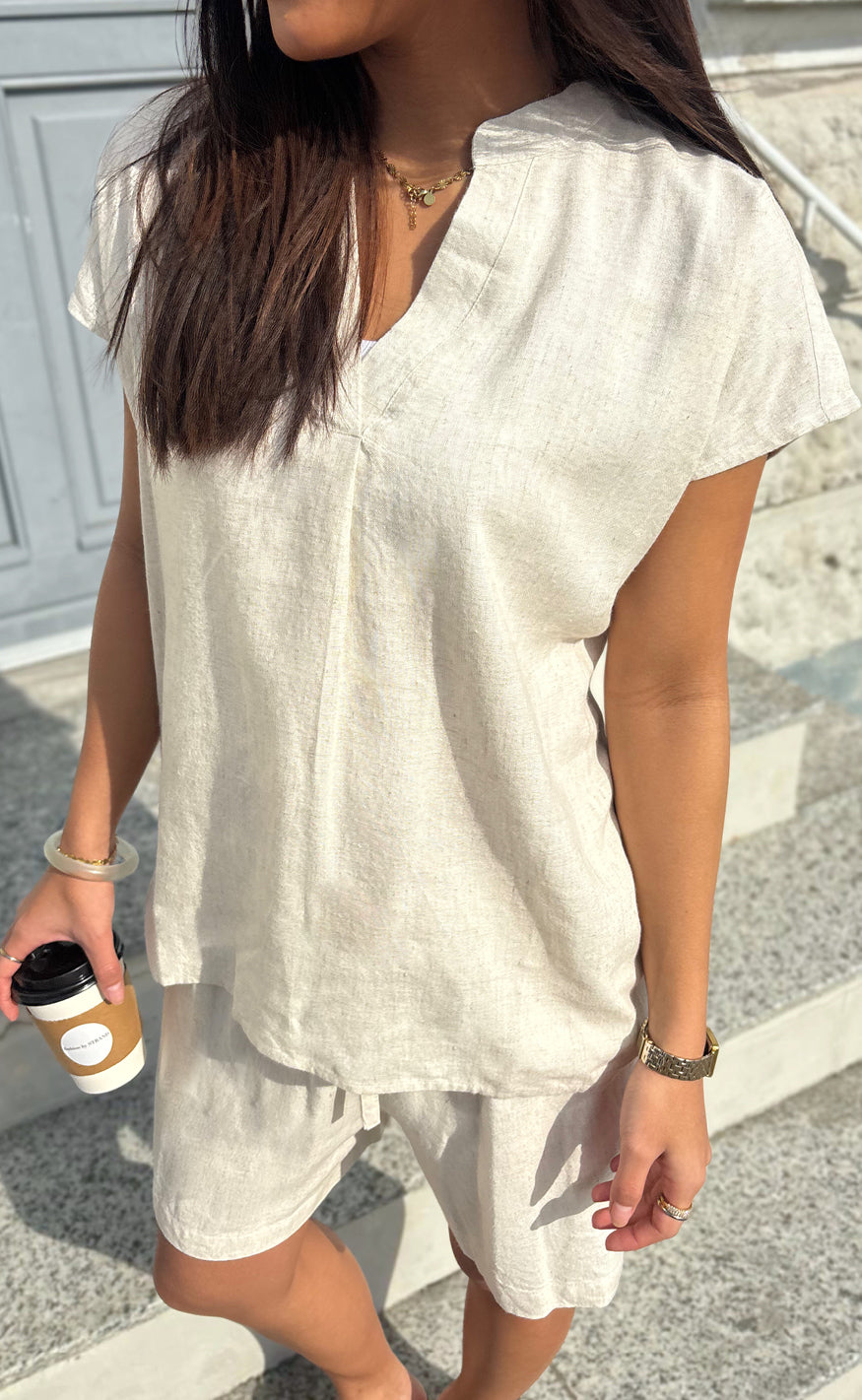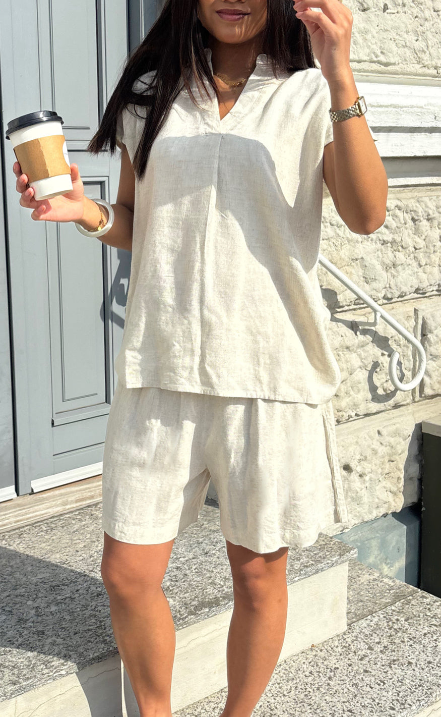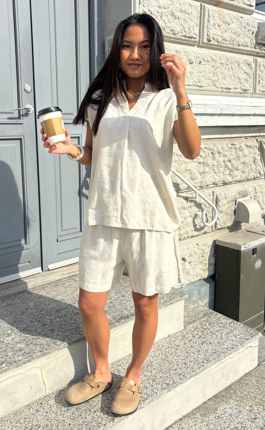 Say INA Copenhagen toppen er oplagt at style med matchende Say INA Copenhagen Shorts - Laura Linen - Sand, men kan f.eks. også styles med jeans eller en nederdel.