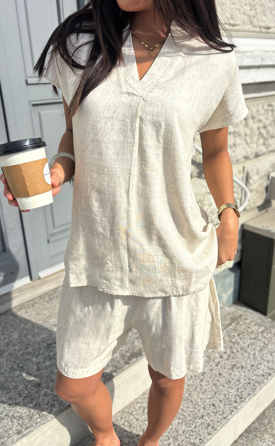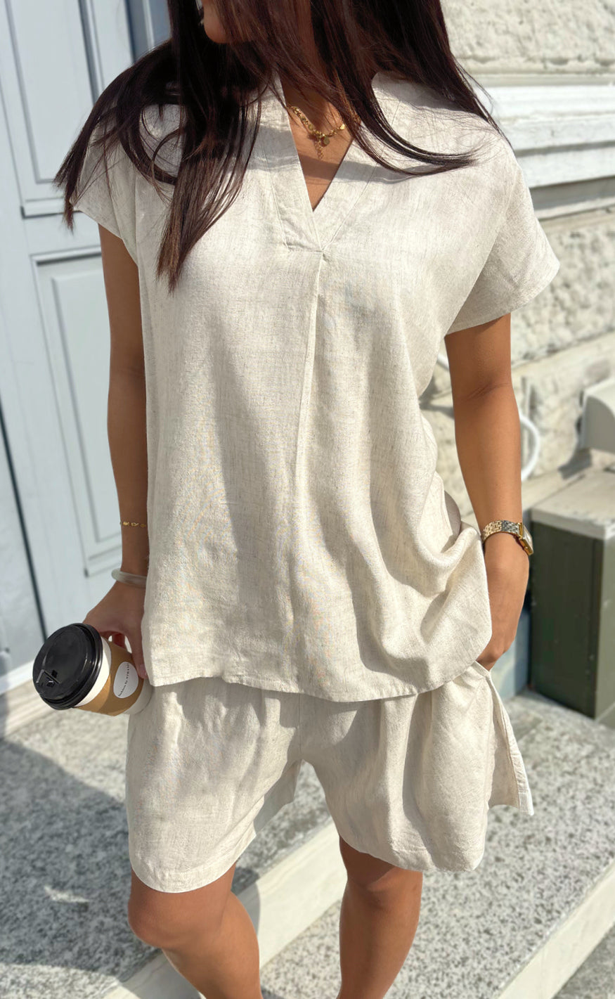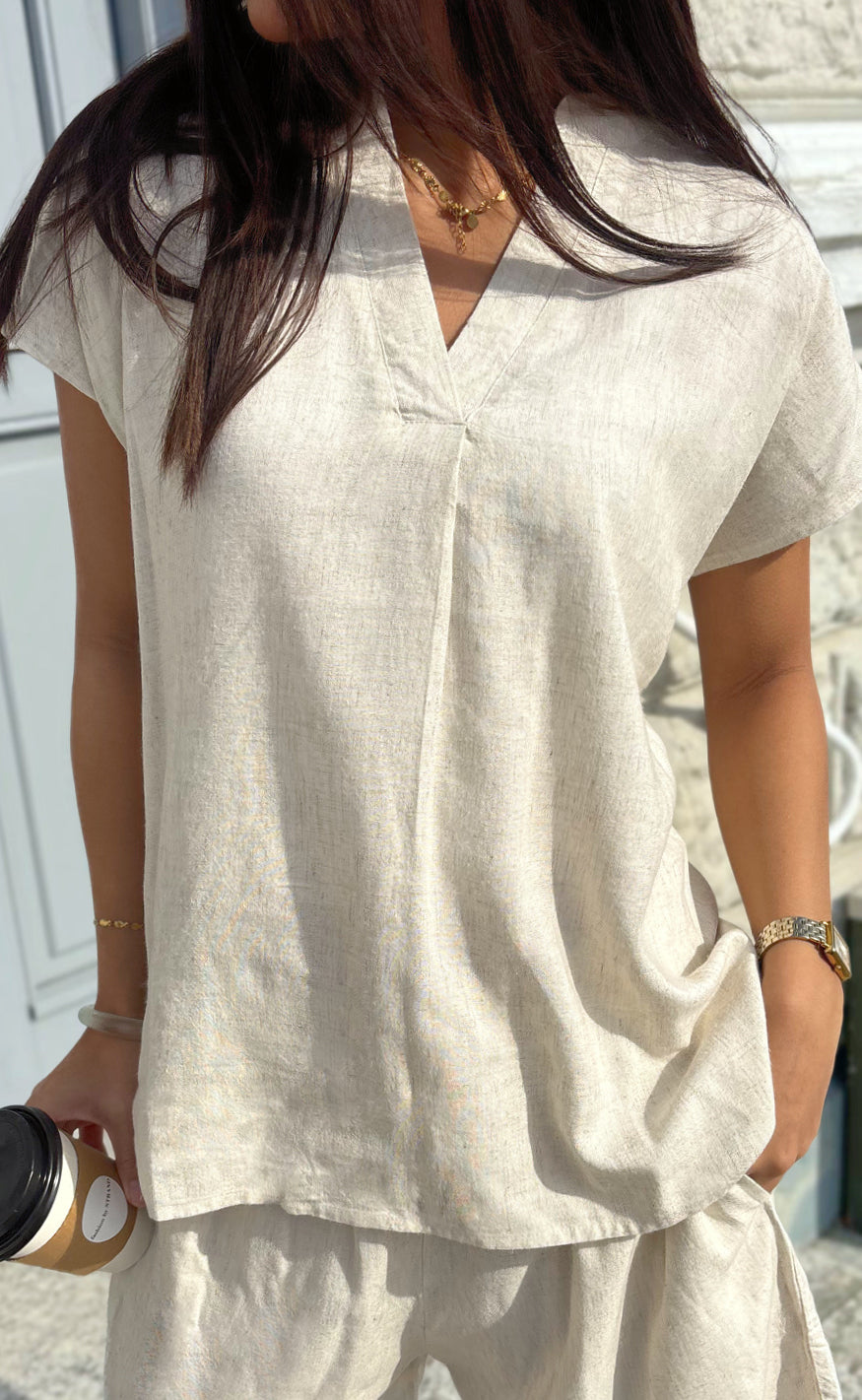 Say INA Copenhagen toppen er oplagt at style med matchende Say INA Copenhagen Shorts - Laura Linen - Sand, men kan f.eks. også styles med jeans eller en nederdel.
