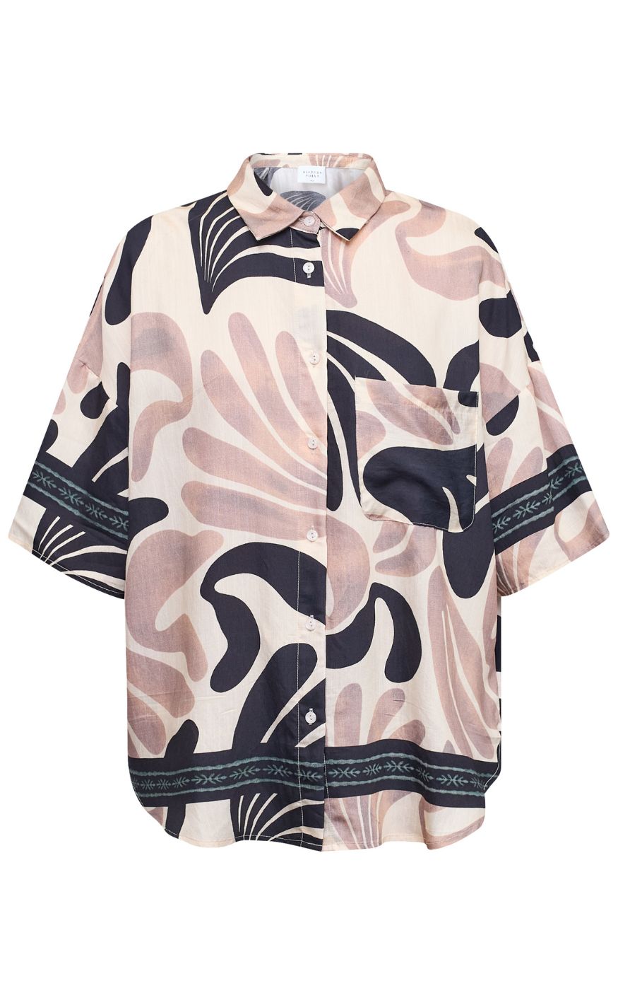 Iøjnefaldende og moderne skjorte fra Sisters Point i en lys nuance med grafisk mønster i rosa og mørkeblå toner. Skjorten har klassisk krave, gennemknapning og korte, brede ærmer, der giver et afslappet og trendy udtryk.
