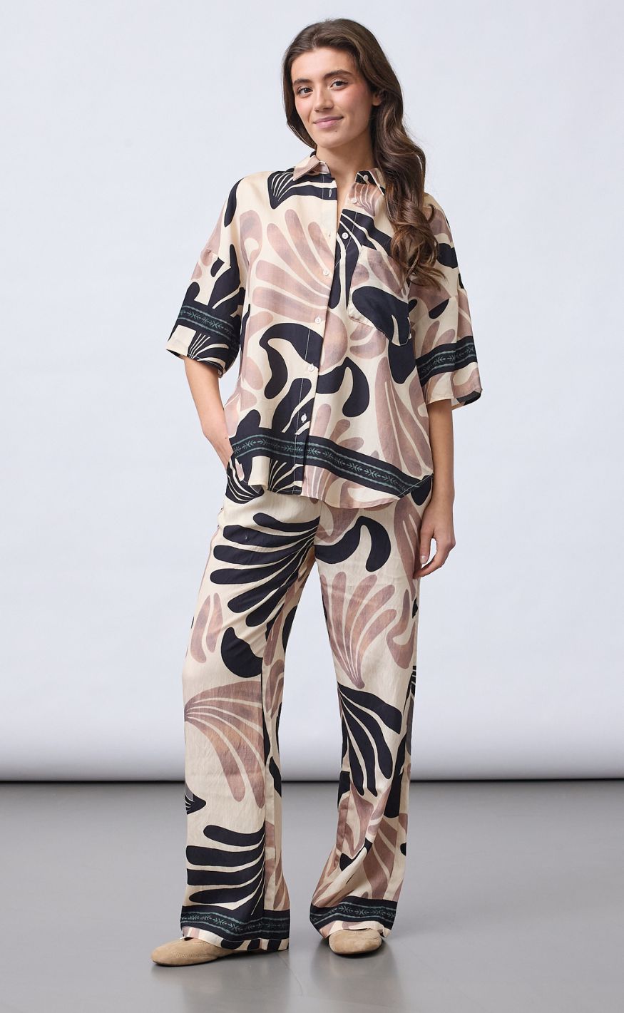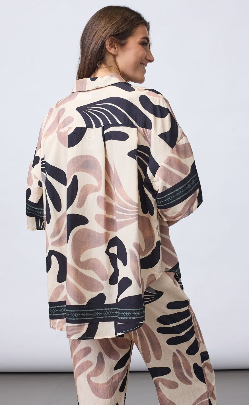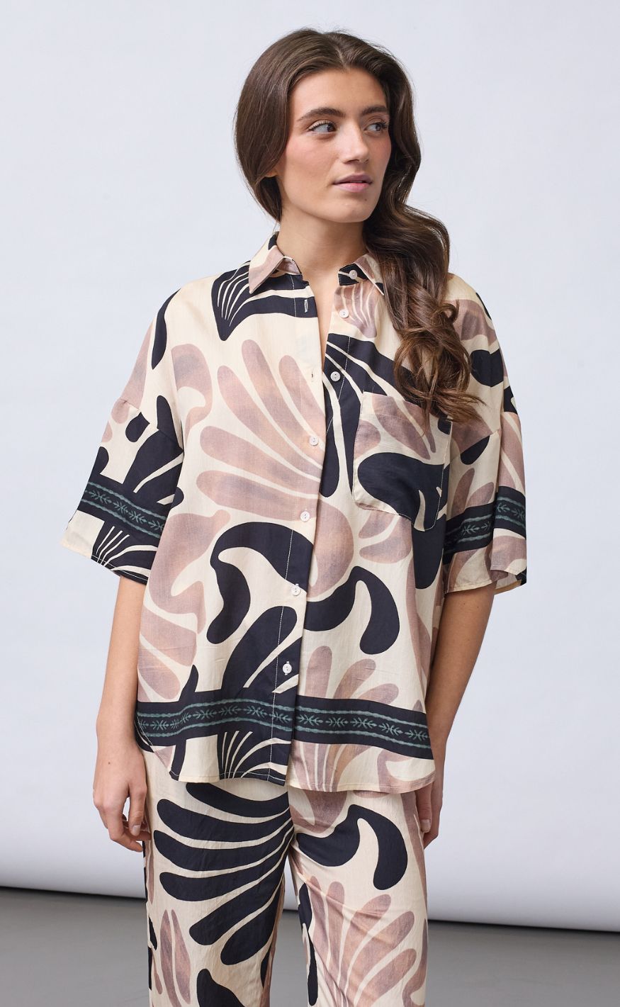 Den løse pasform og det lette materiale sikrer et smukt fald, mens brystlommen og de dekorative detaljer forneden fuldender looket – perfekt stylet alene eller som del af et matchende sæt.
