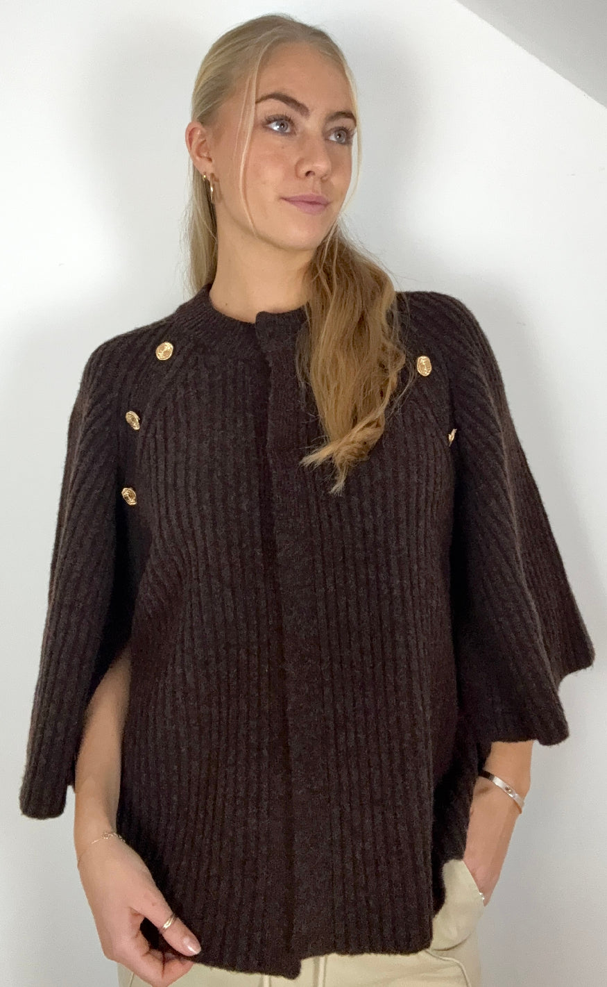 Lækker strik fra Continue i mørkebrun, med flotte knapper fortil.
