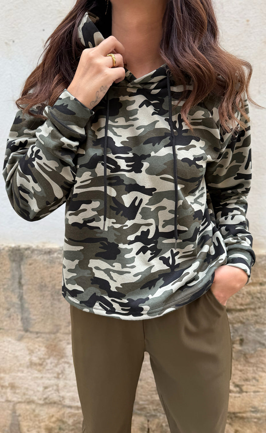 Flot hoodie fra Liberte i en camo farve, med et rødt hjerte bagtil.