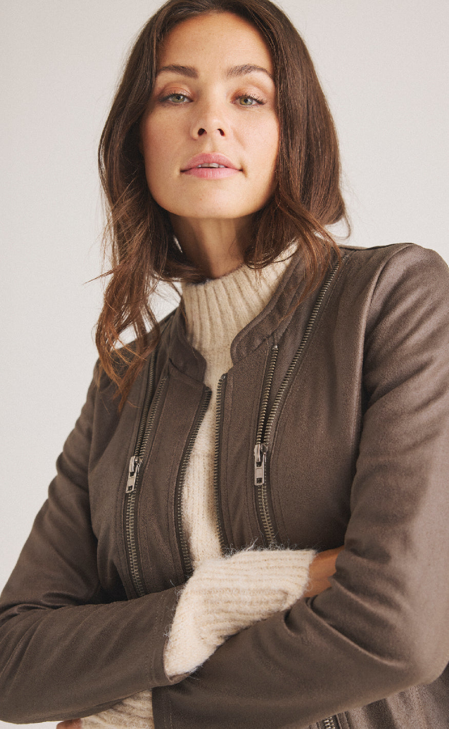 Materialet har en blød, ruskindsinspireret overflade, som tilfører jakken et eksklusivt præg. Perfekt som overgangsjakke eller til at fuldende et smart outfit med jeans eller kjole.