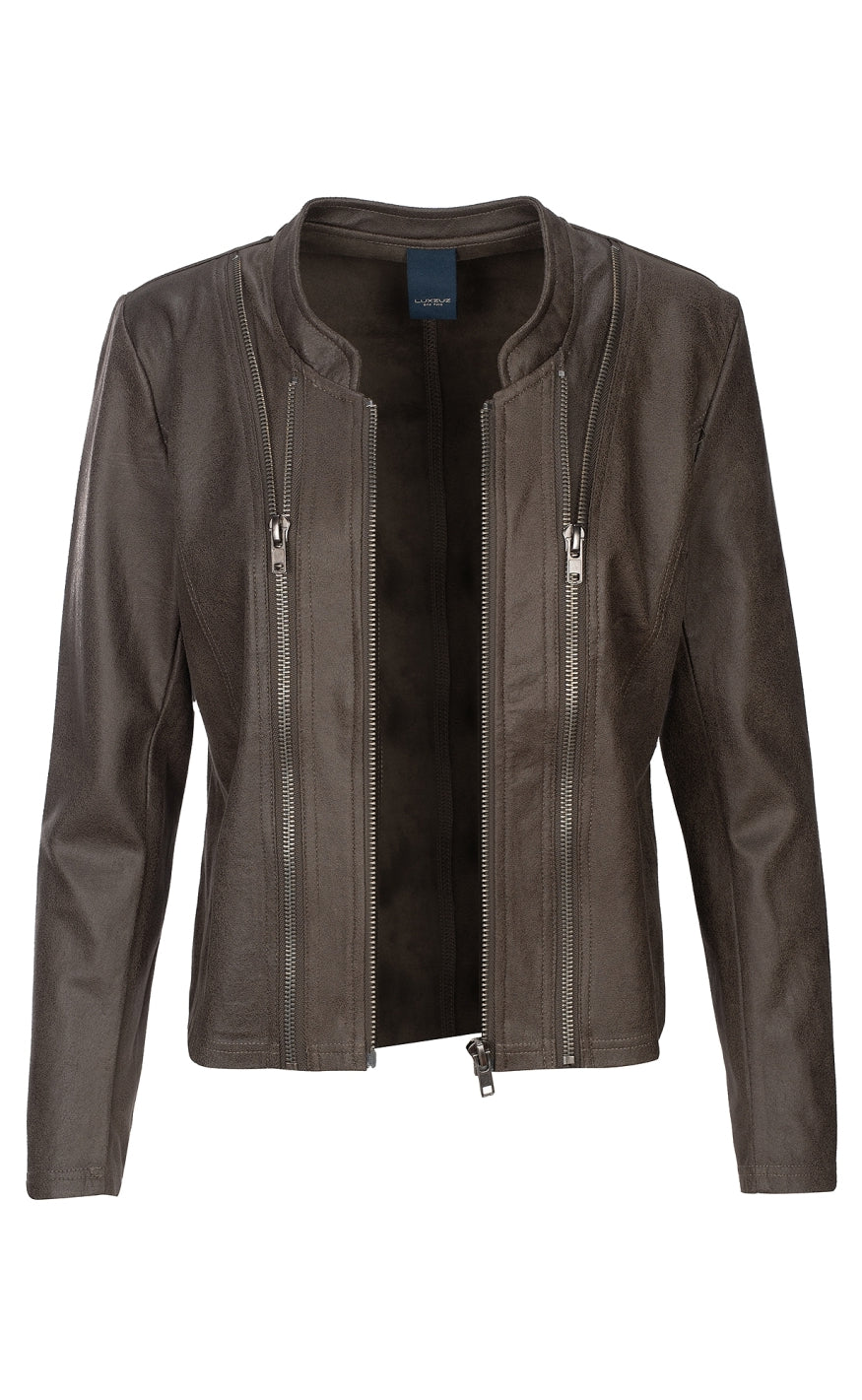 Jakken har lange ærmer, rund halsudskæring og er designet med markante lynlåse både foran og som dekorative detaljer, der giver et råt og stilfuldt look.